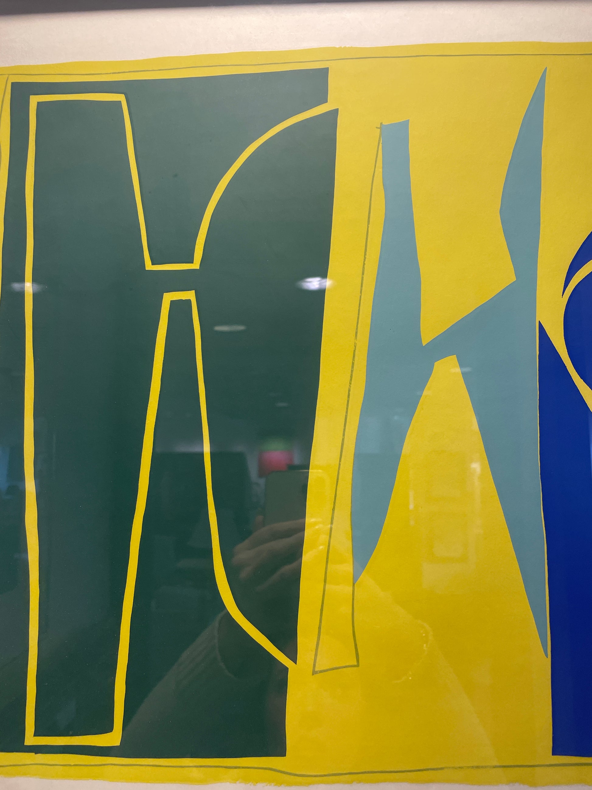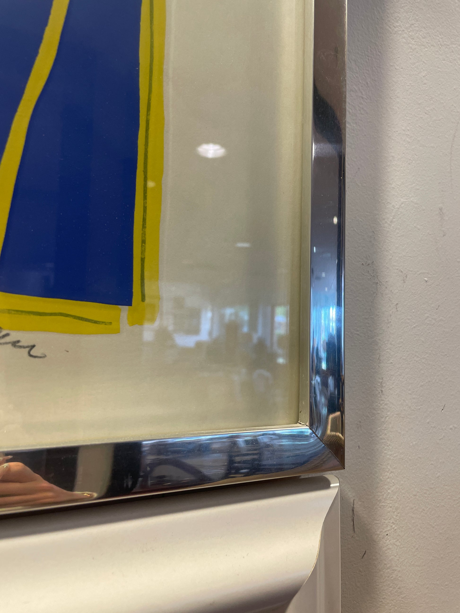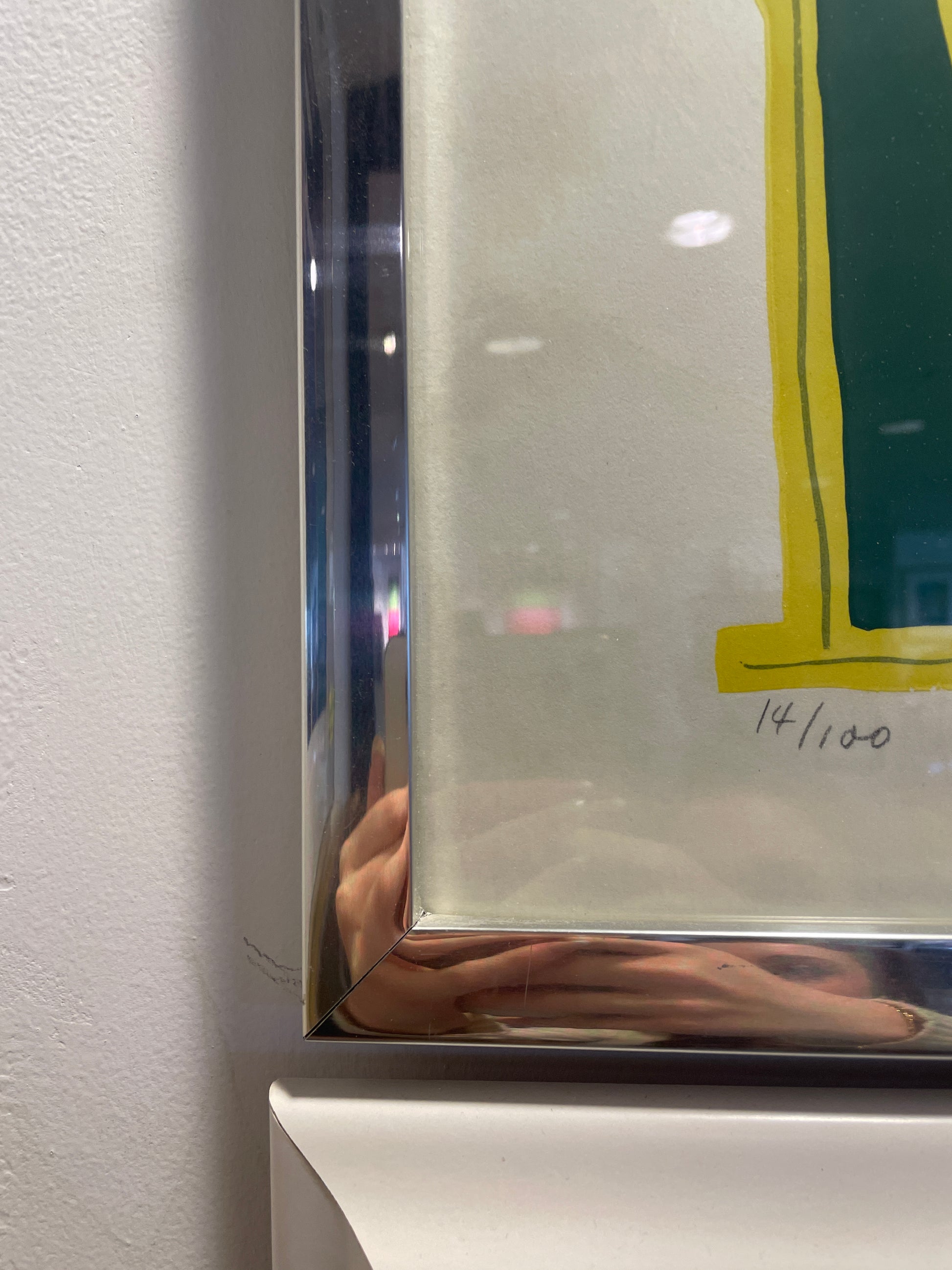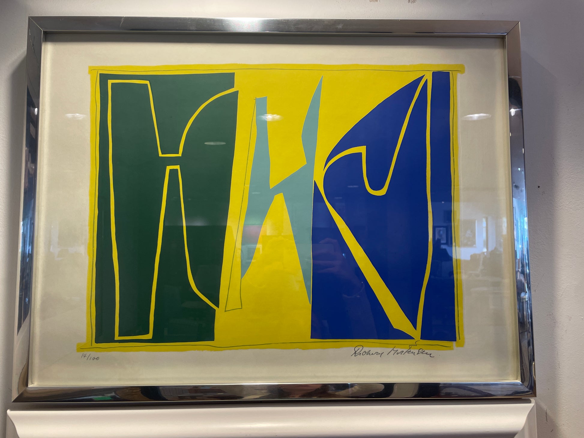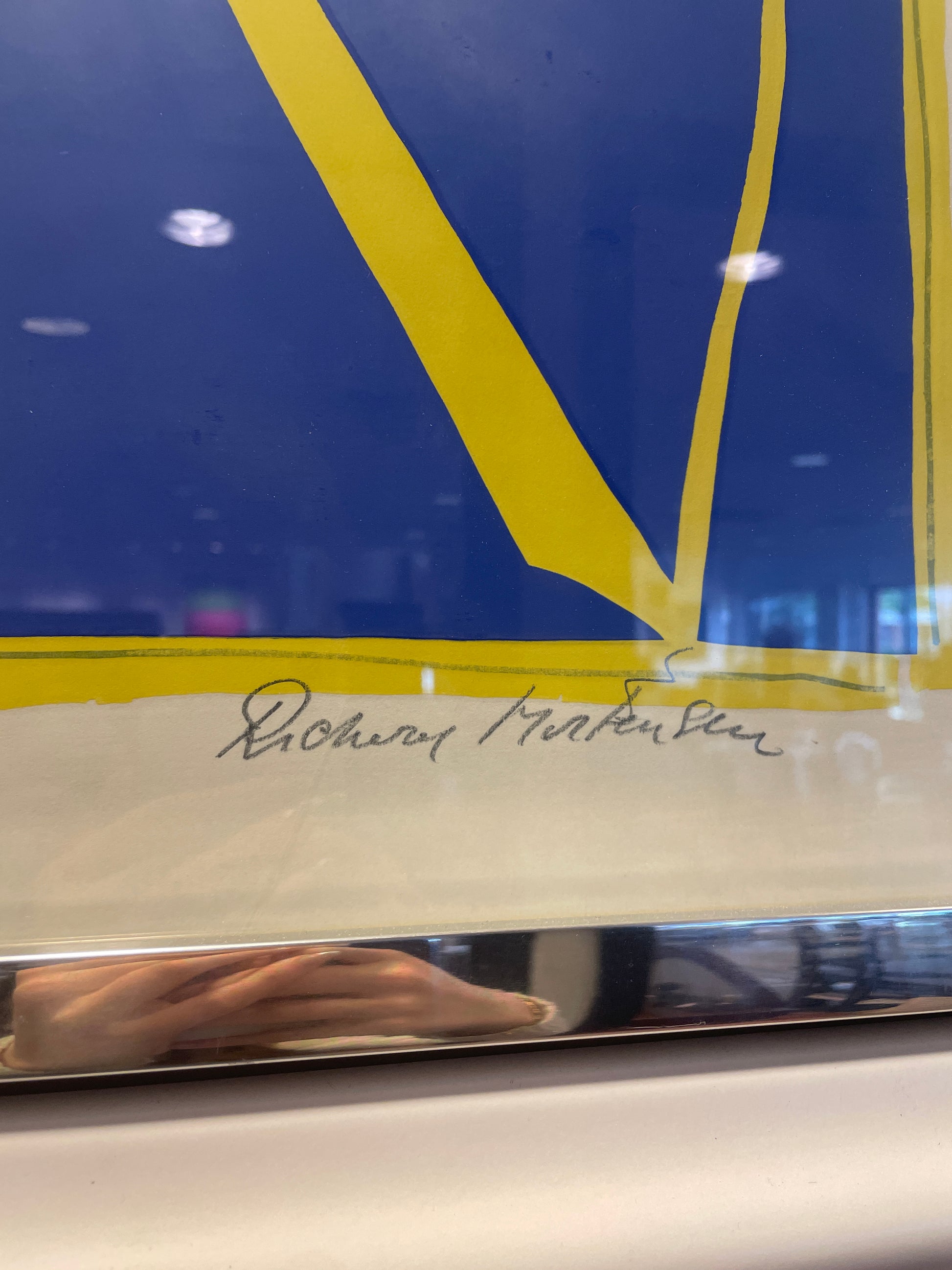 Abstract, geometric serigraph print by artist Richard Mortenson. Features dancing, linear shapes and chartreuse coloration with deep green and blue as well as medium blue accents. Signed Richard Mortenson in the bottom right corner. Numbered 14/100 in the bottom left corner. Held in a silver metal frame.