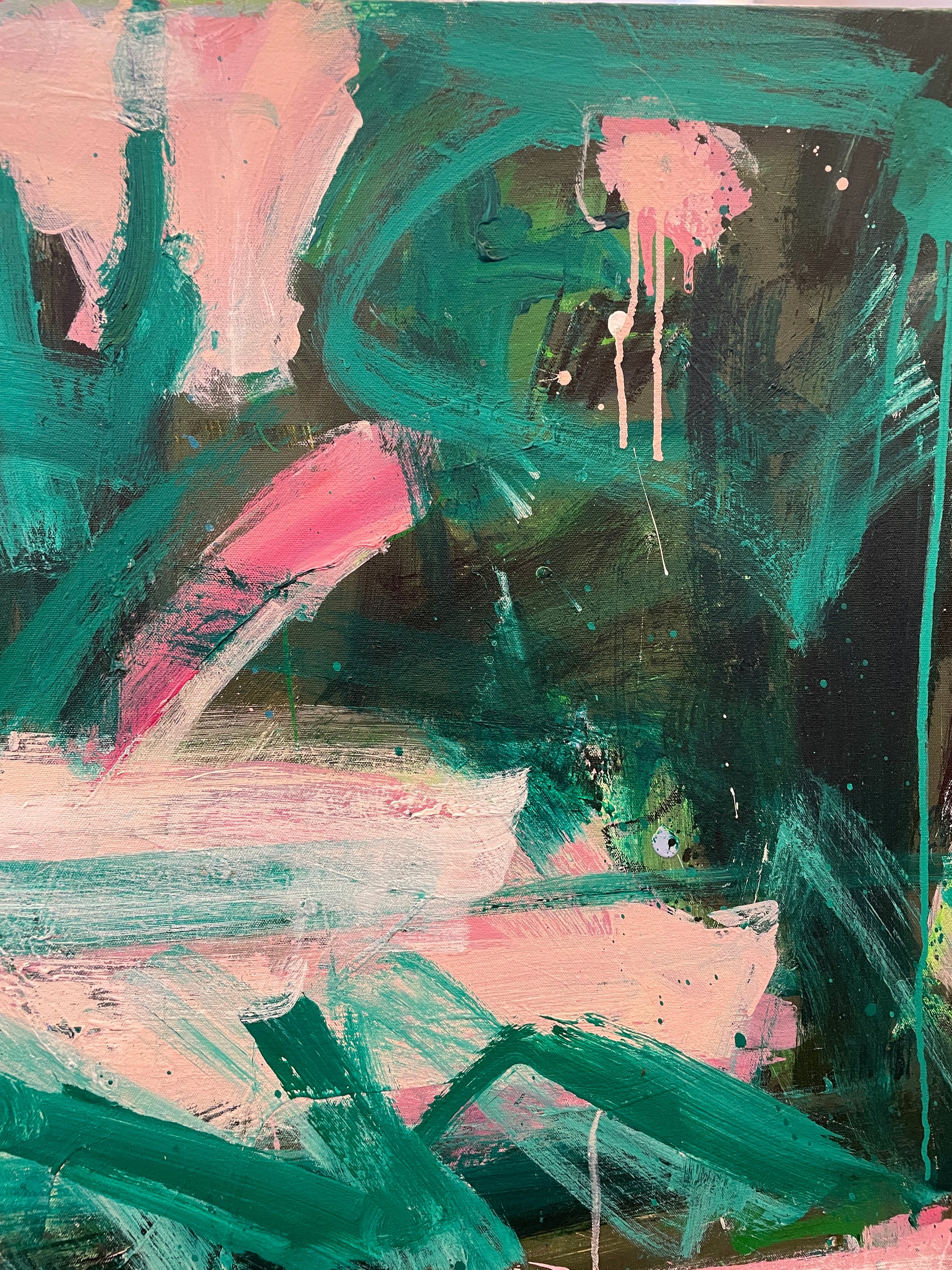 Robbie Kemper pink and green acrylic painting on canvas. Signed lower left. This beautiful piece of art is abstract in style. It is done in shades of pink and green that are broadly stroked across the canvas. Some of the paint drips down for even more detail and character. This beautiful piece is an eye-catching addition to any space.