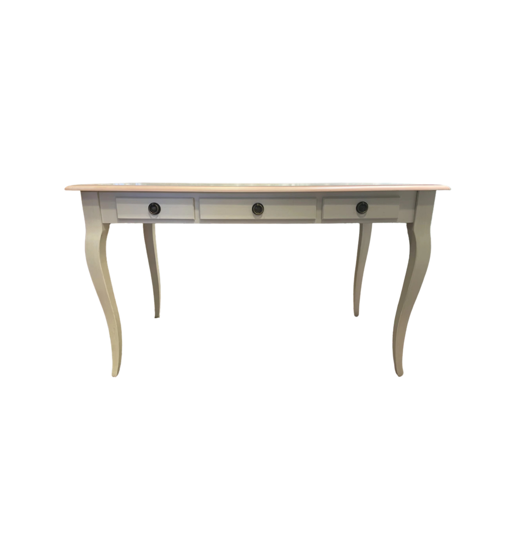 This Julia Gray-attributed desk features a rococo style with a white-washed color and pink trim. There are 3 drawers each with brass pull rings. The desk sits on cabriole legs.
