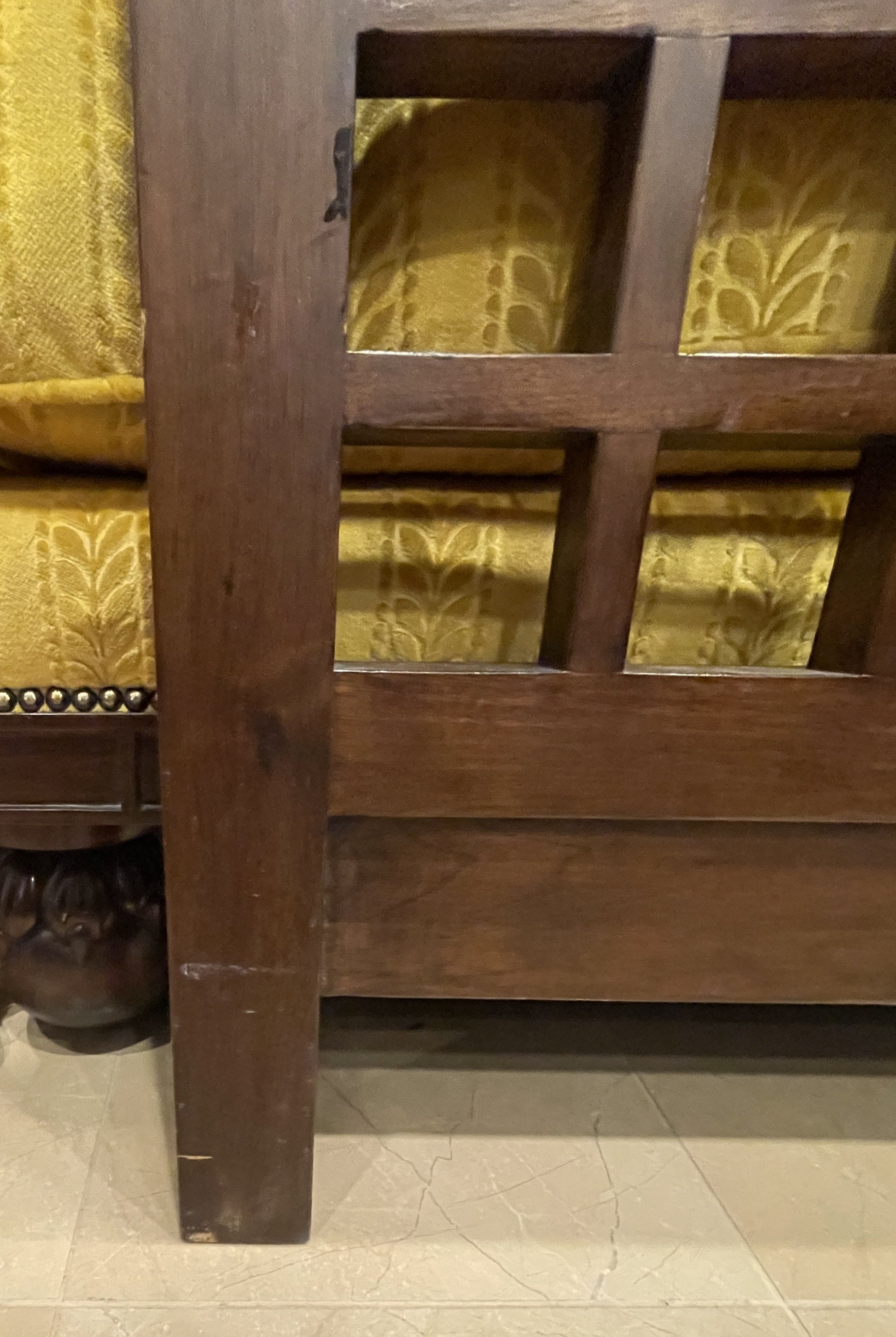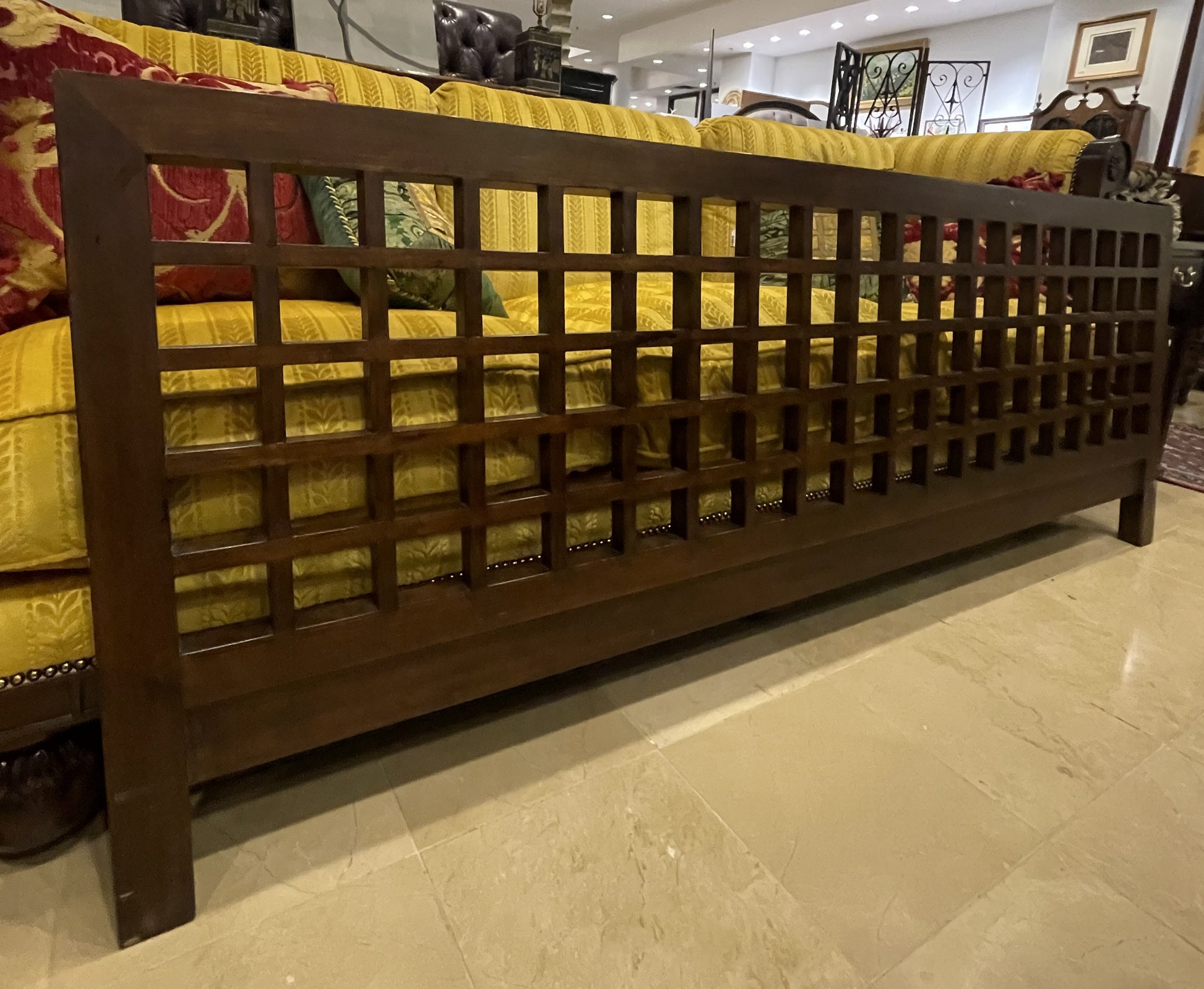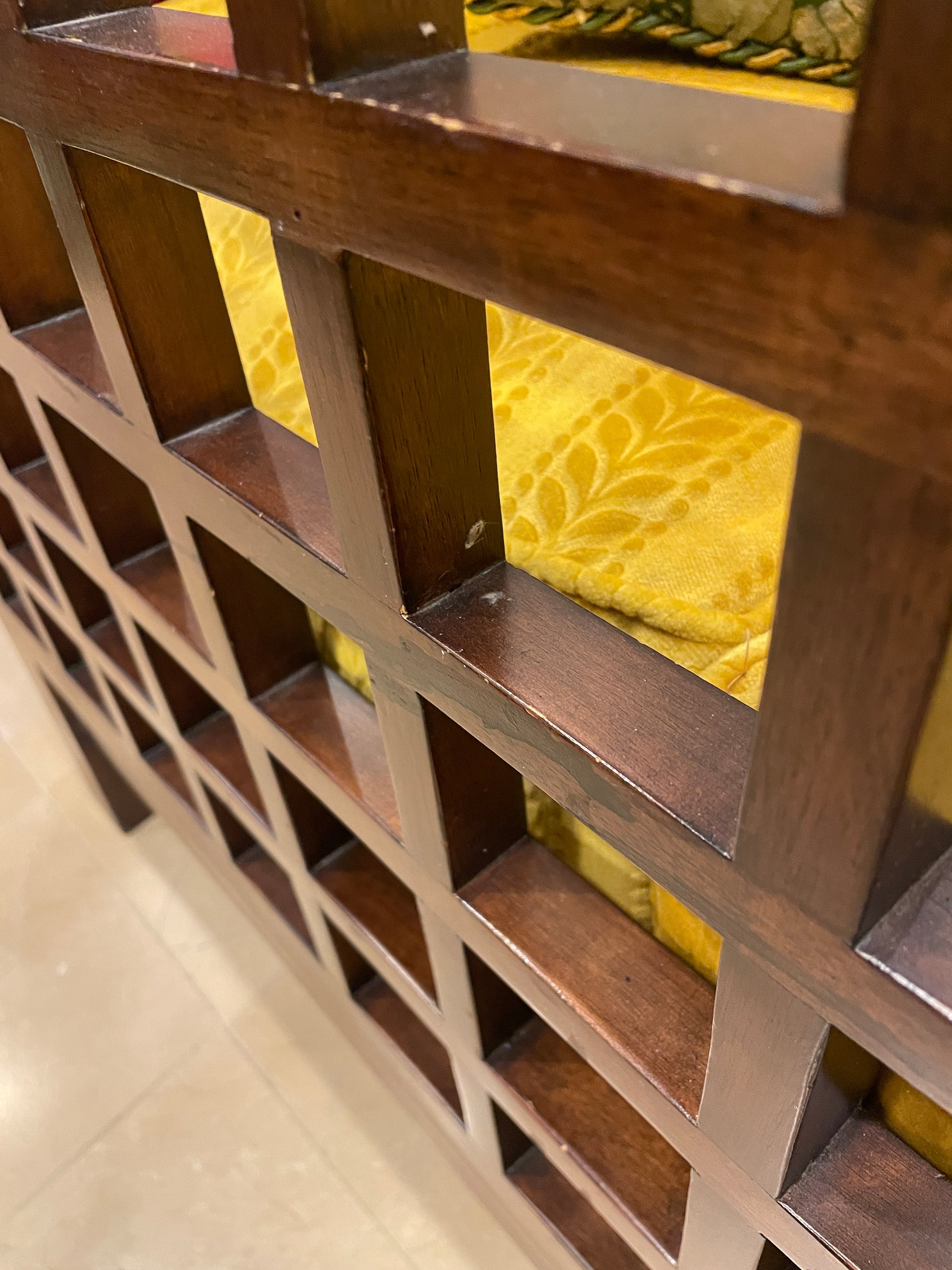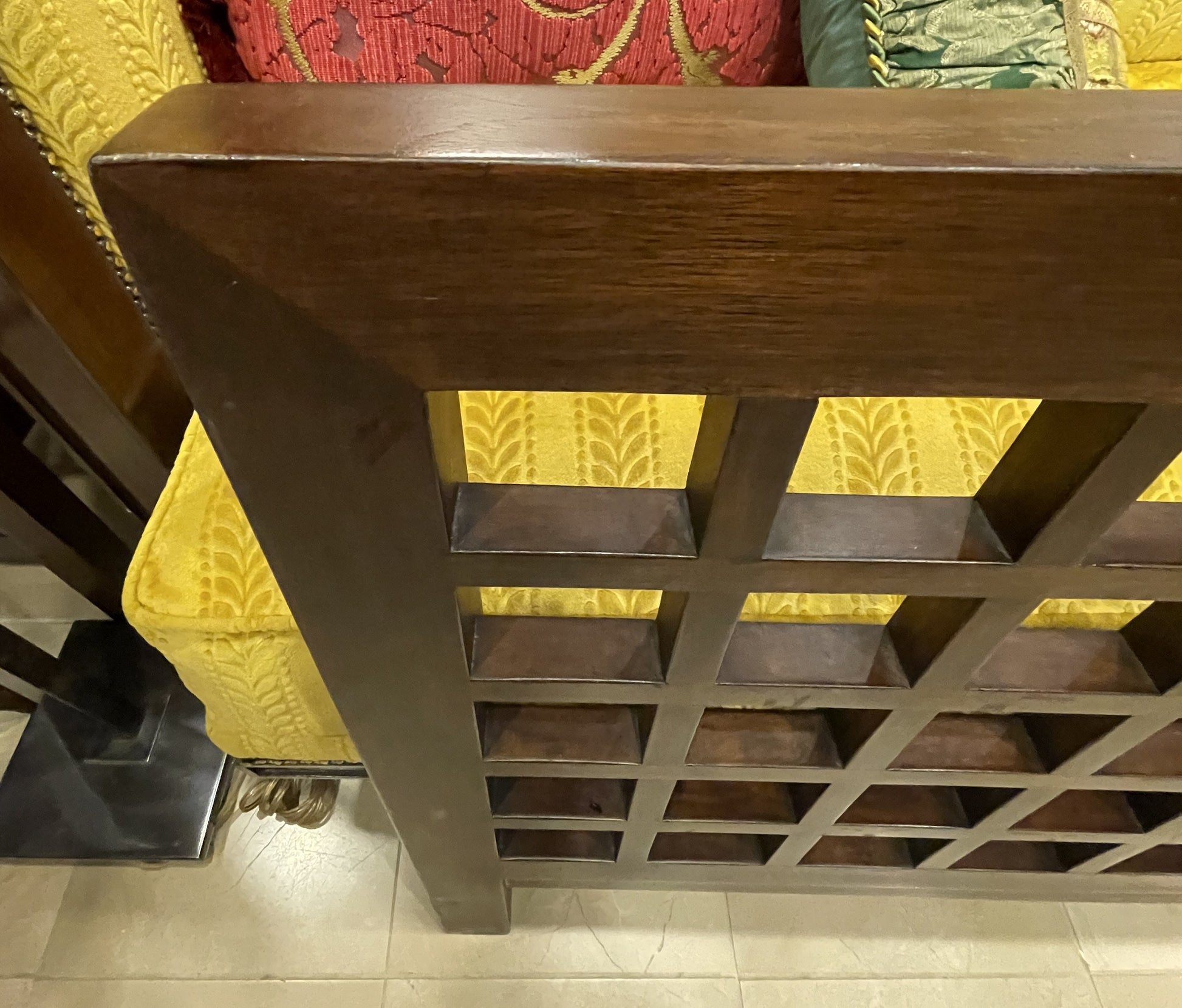Room and Board king "Jade" platform bed. This charming bed features a grid design formed from gorgeous dark-toned wood. The frame sits low to the ground on square feet that just slightly lift up the base. This bed has mid-century modern charm that's sure to elevate any space.