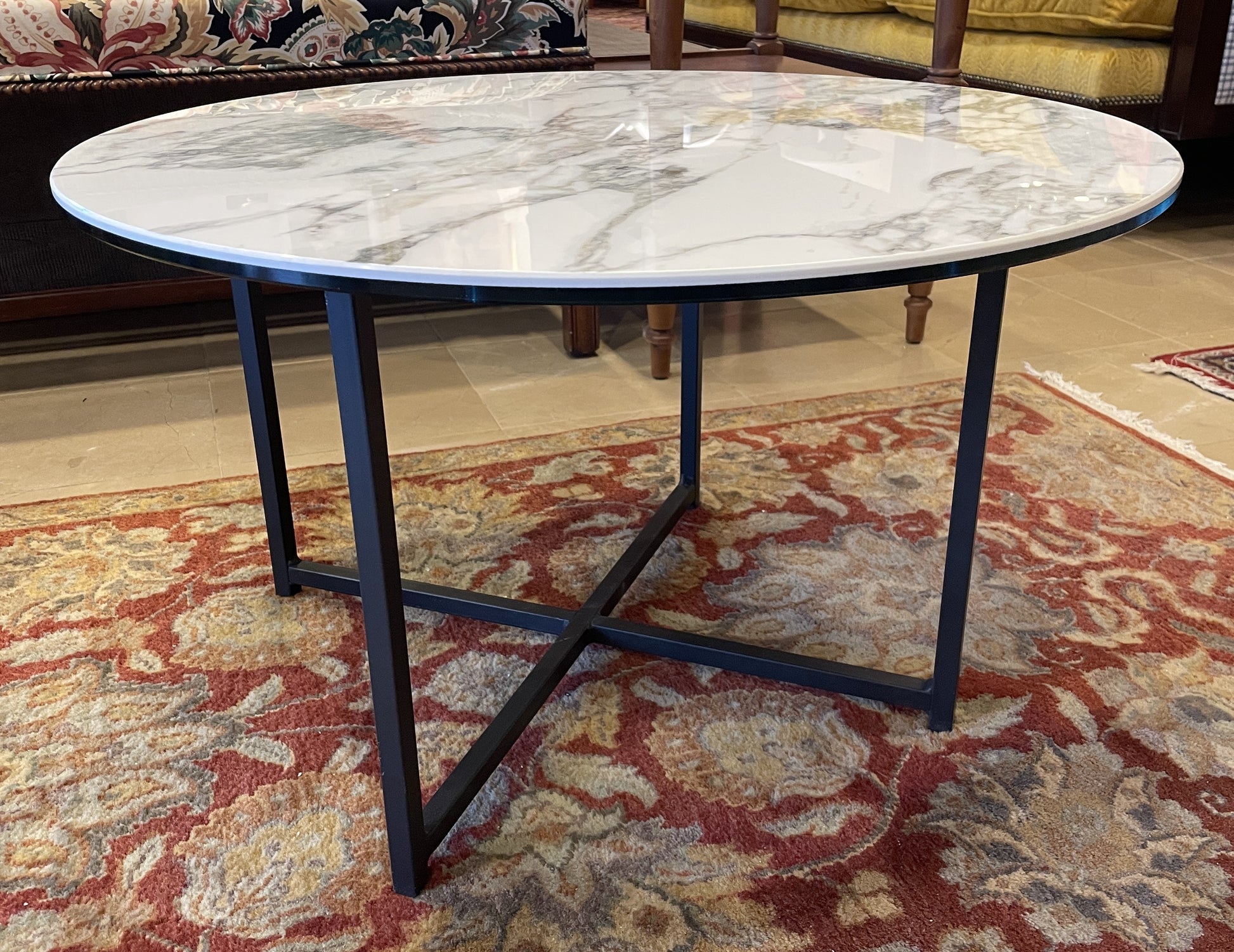Room and Board modern classic ceramic coffee table. This charming little modern piece features a crisscrossed steel base that holds a glass and ceramic tabletop. The circular tabletop has a distinct, thick layer of glass underneath the marbled ceramic top in white and gray. This charming piece is sure to elevate a space with elegant modern flare.