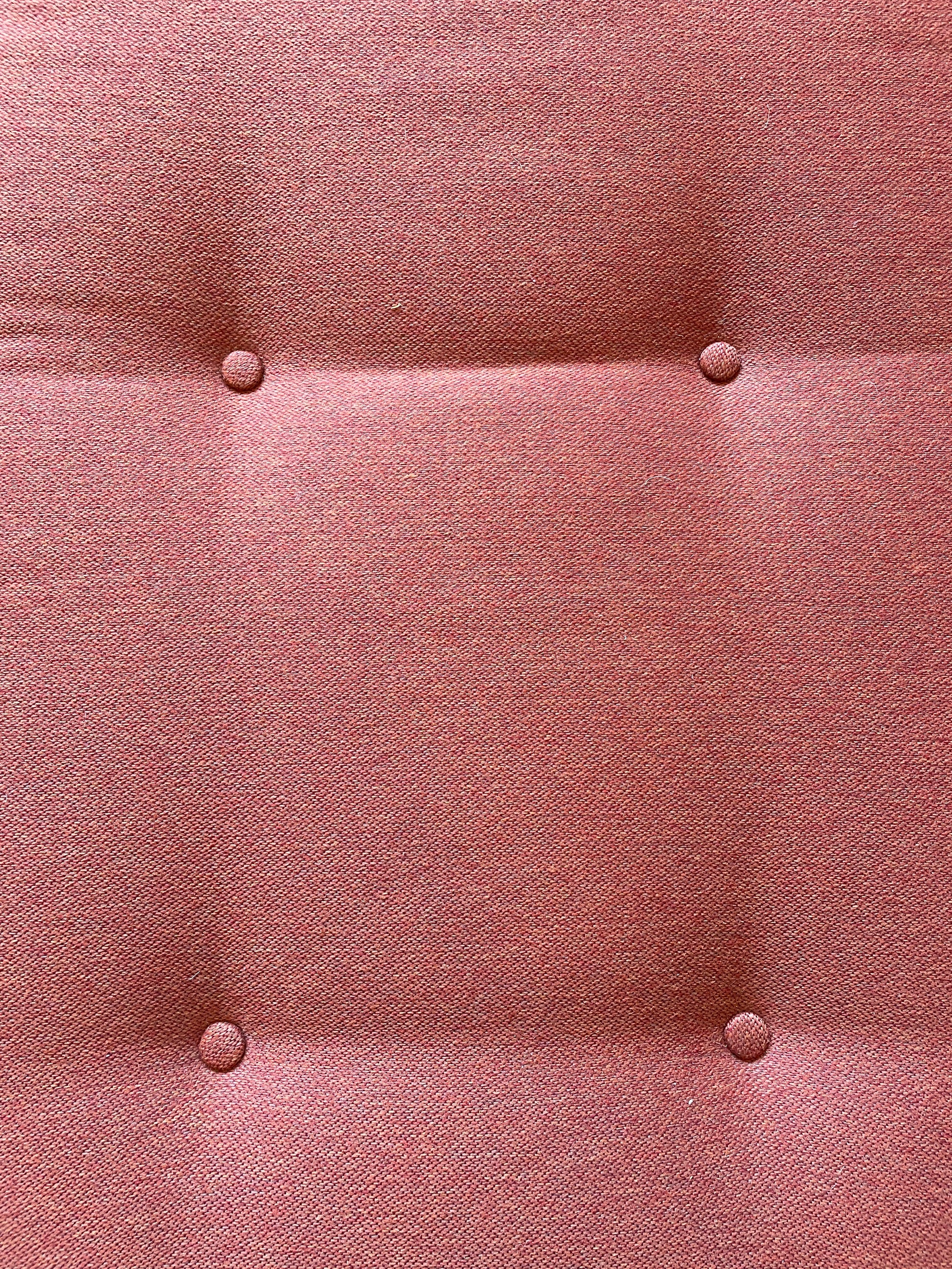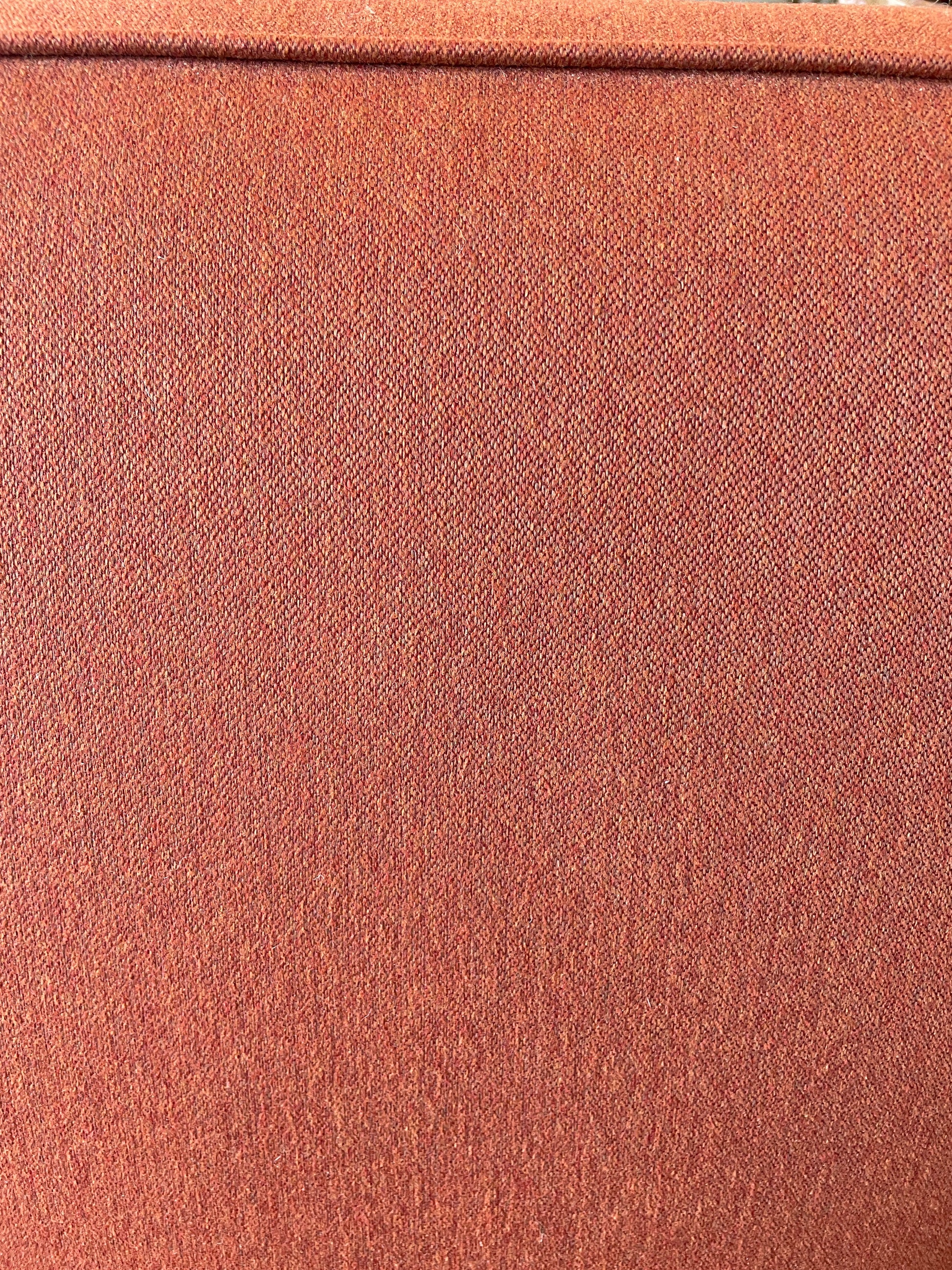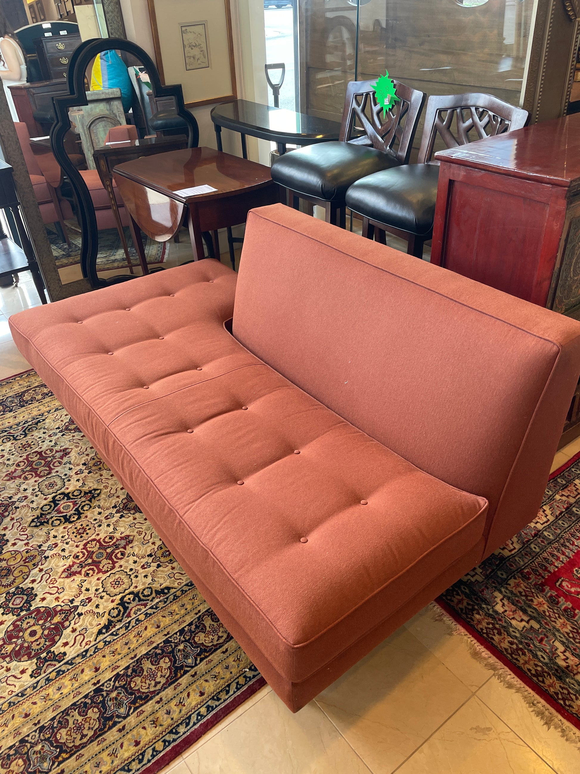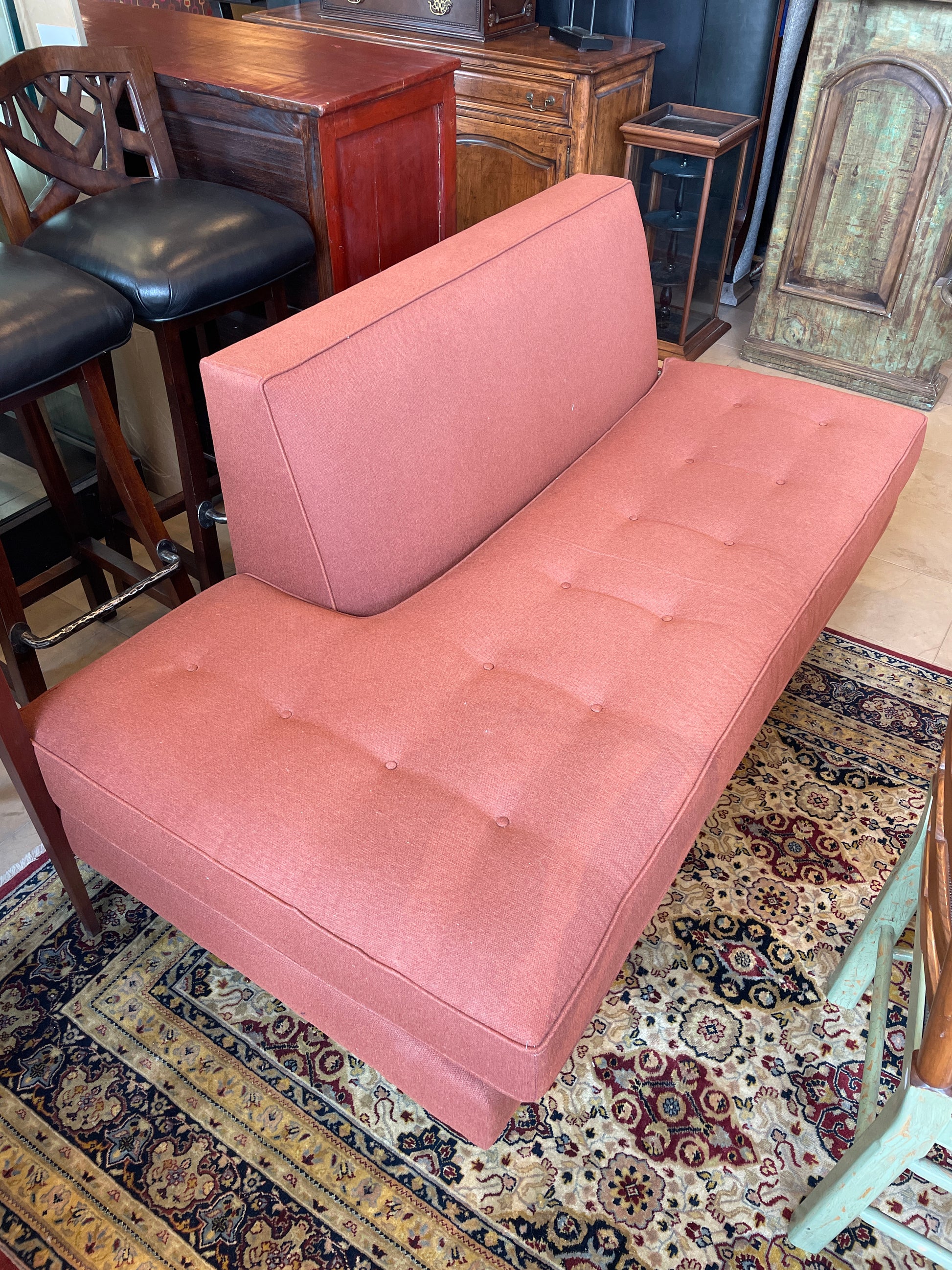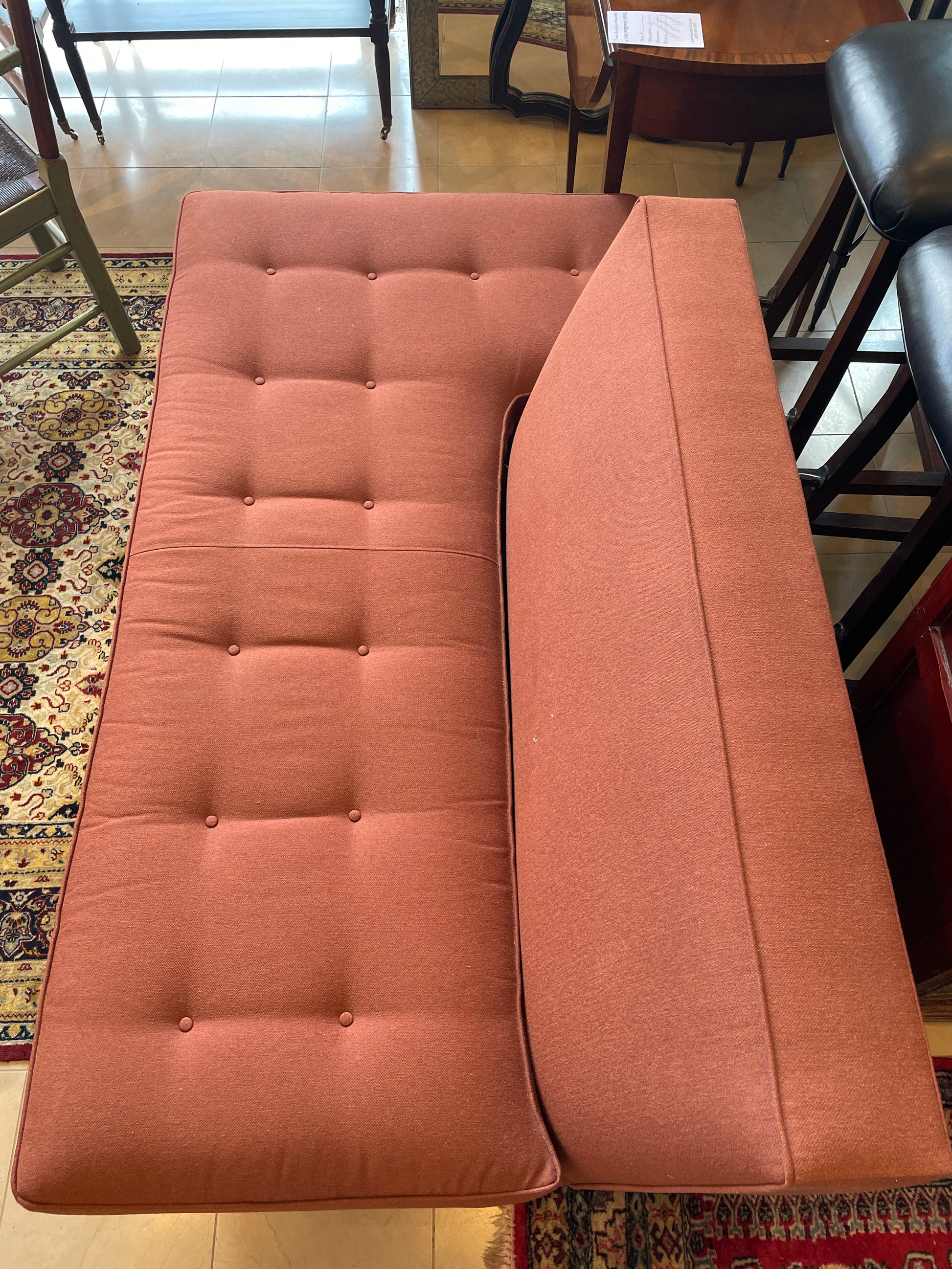 Mid Century style sofa in the Reese style by the brand Room and Board. Features a sleek appearance with a right-centered seat back and button tufted seat cushion. The fabric is a plain weave in the color pelham blossom which is light burnt orange color. The legs of the sofa are long and tapered with a charcoal stain. Room and Board branding is present underneath the seat cushion.