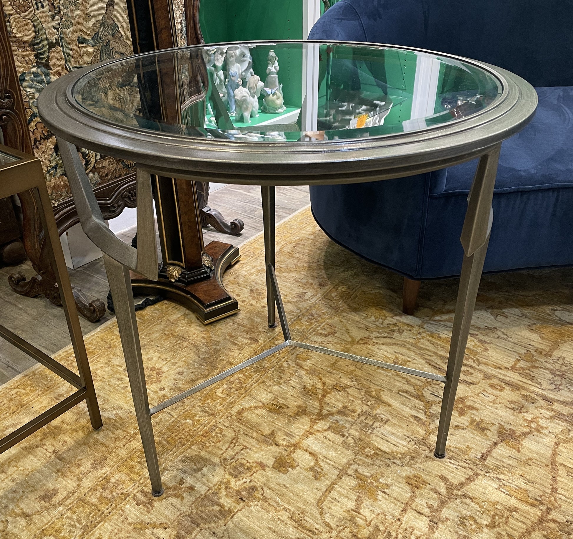 Round iron and glass end table in matte chrome. This beautiful little end table has a matte chrome frame that supports a circular glass tabletop. The frame has three legs in a unique shape. The legs fork out at the top into two separate prongs and are connected by a Y-shaped stretcher. A sleek table with modern flare that is sure to elevate any setting.