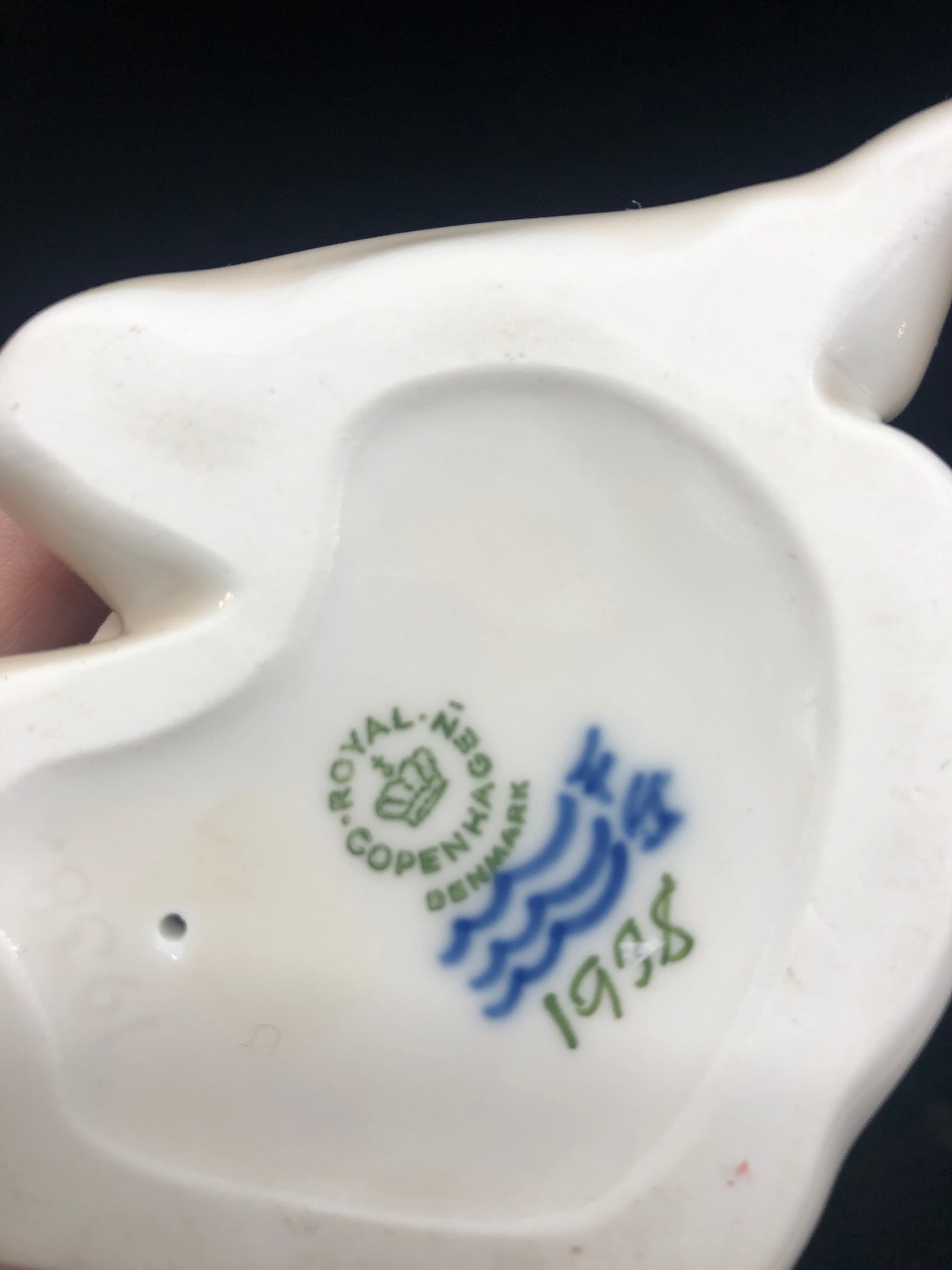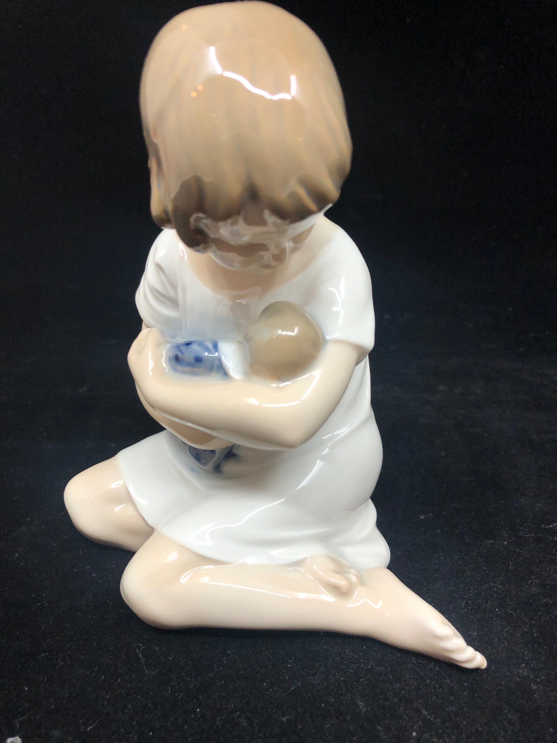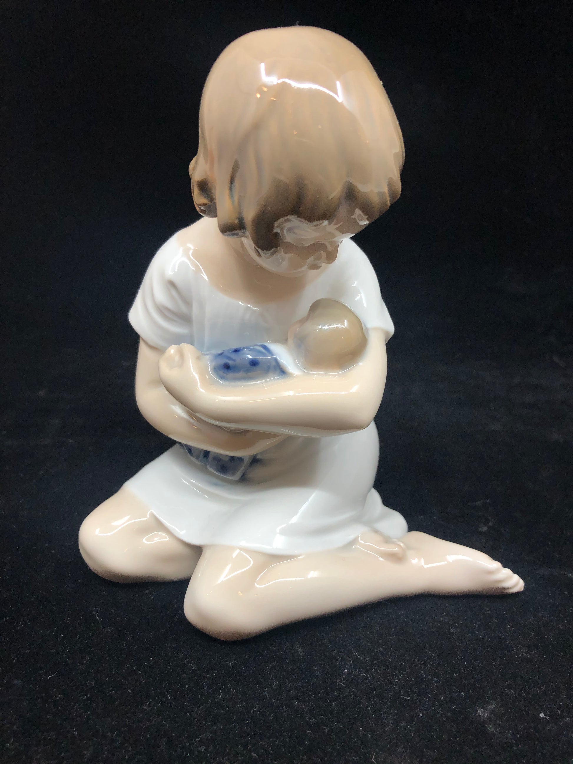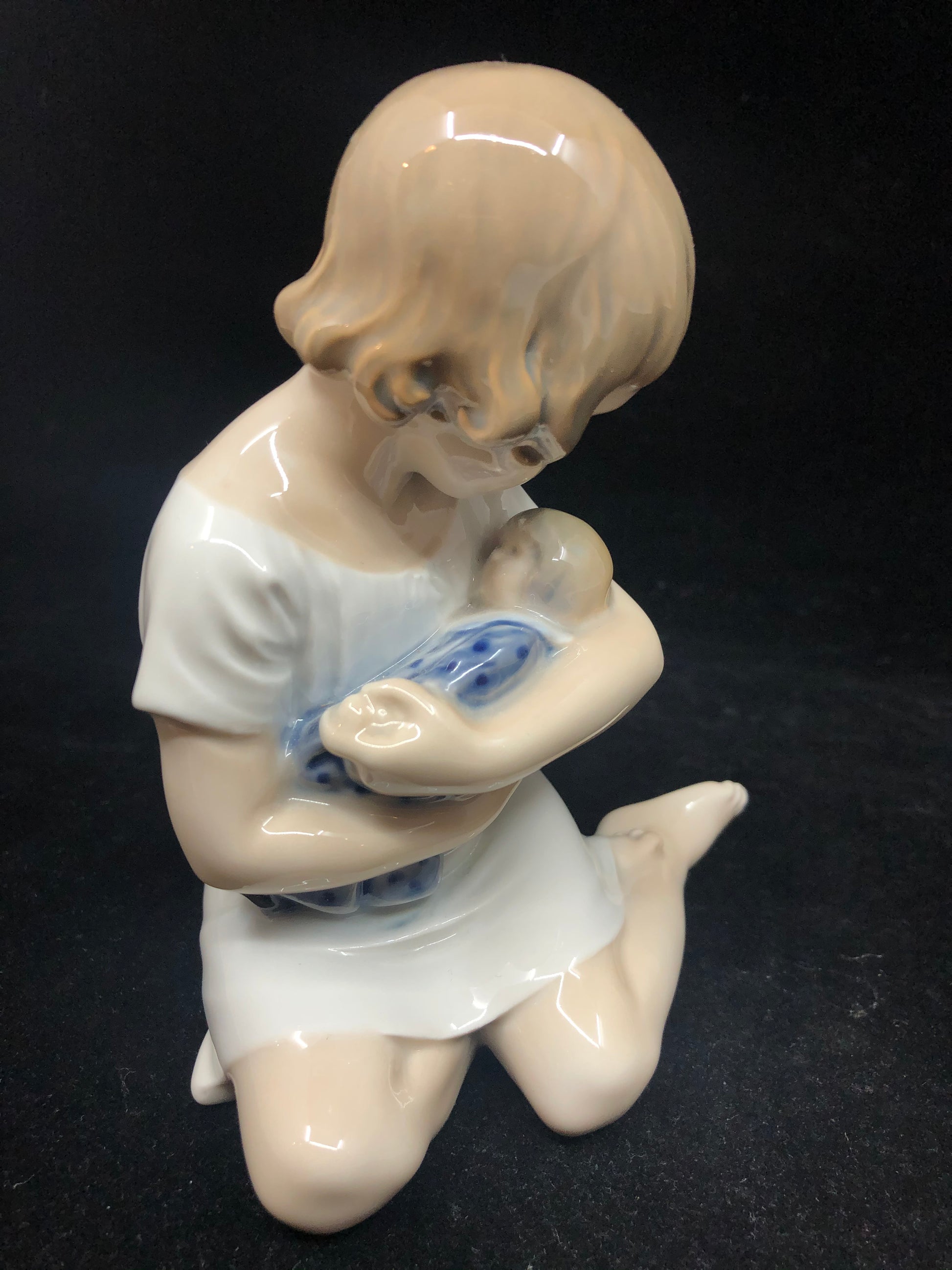 Royal Copenhagen figurine of a young girl holding a baby doll. Royal Copenhagen number 1938. Marking on underside on figurine. Glazed finish.