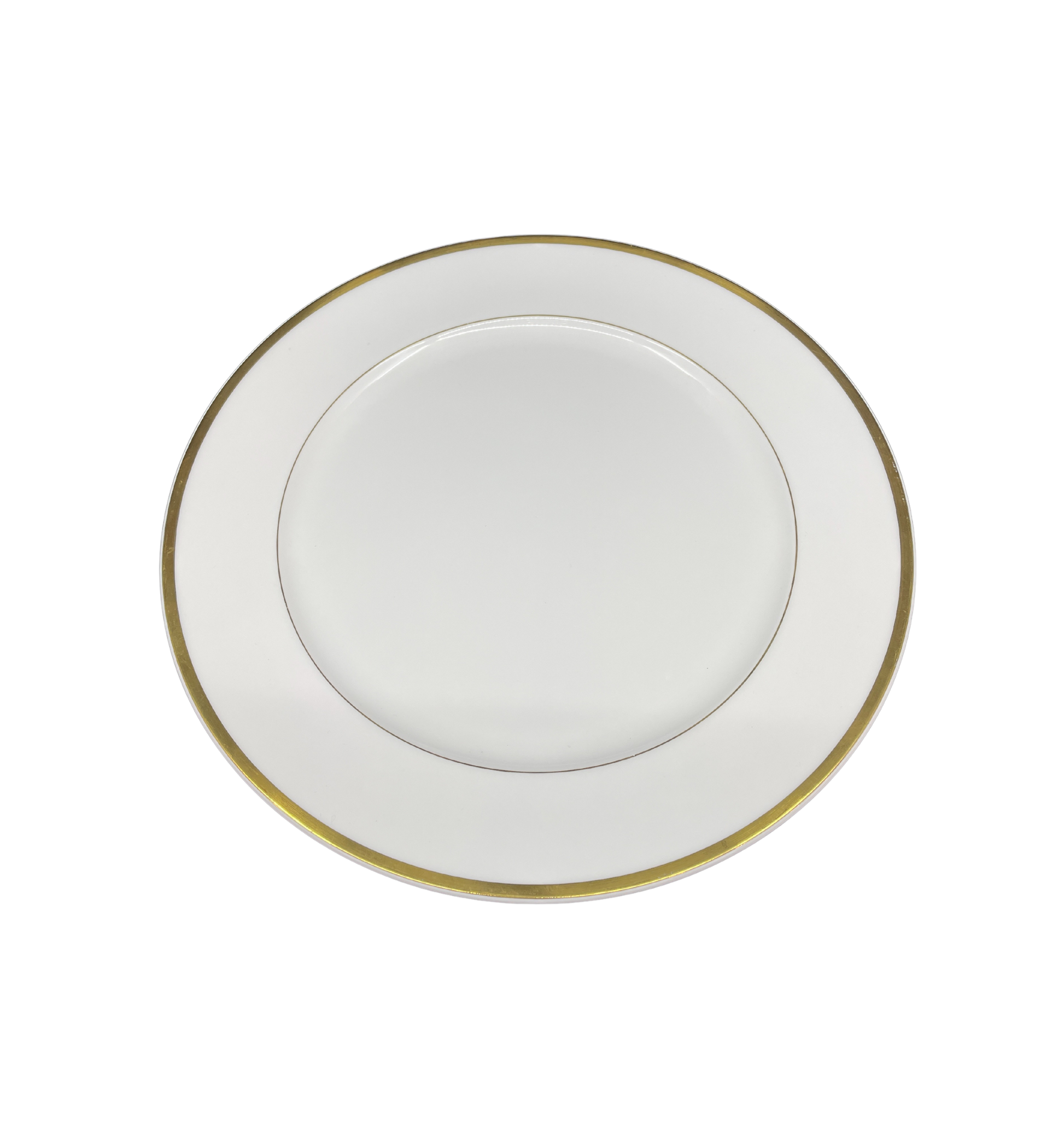 Royal Doulton "Alice" charger plate. This beautiful bone china plate has a white base with a gorgeous thin gold band around both edges of the rim. An elegant piece that's versatile and timeless thanks to its simple and sleek design.
