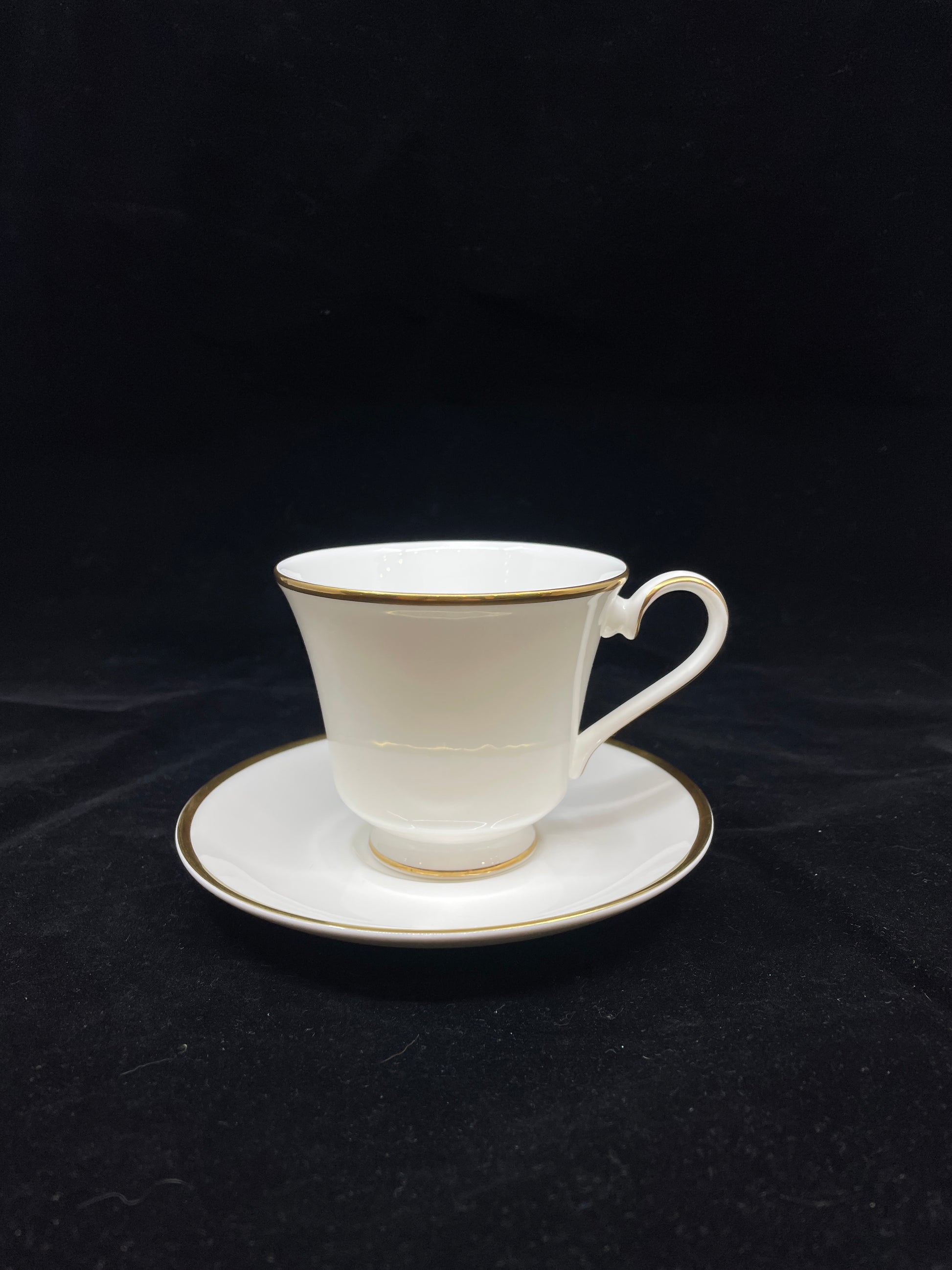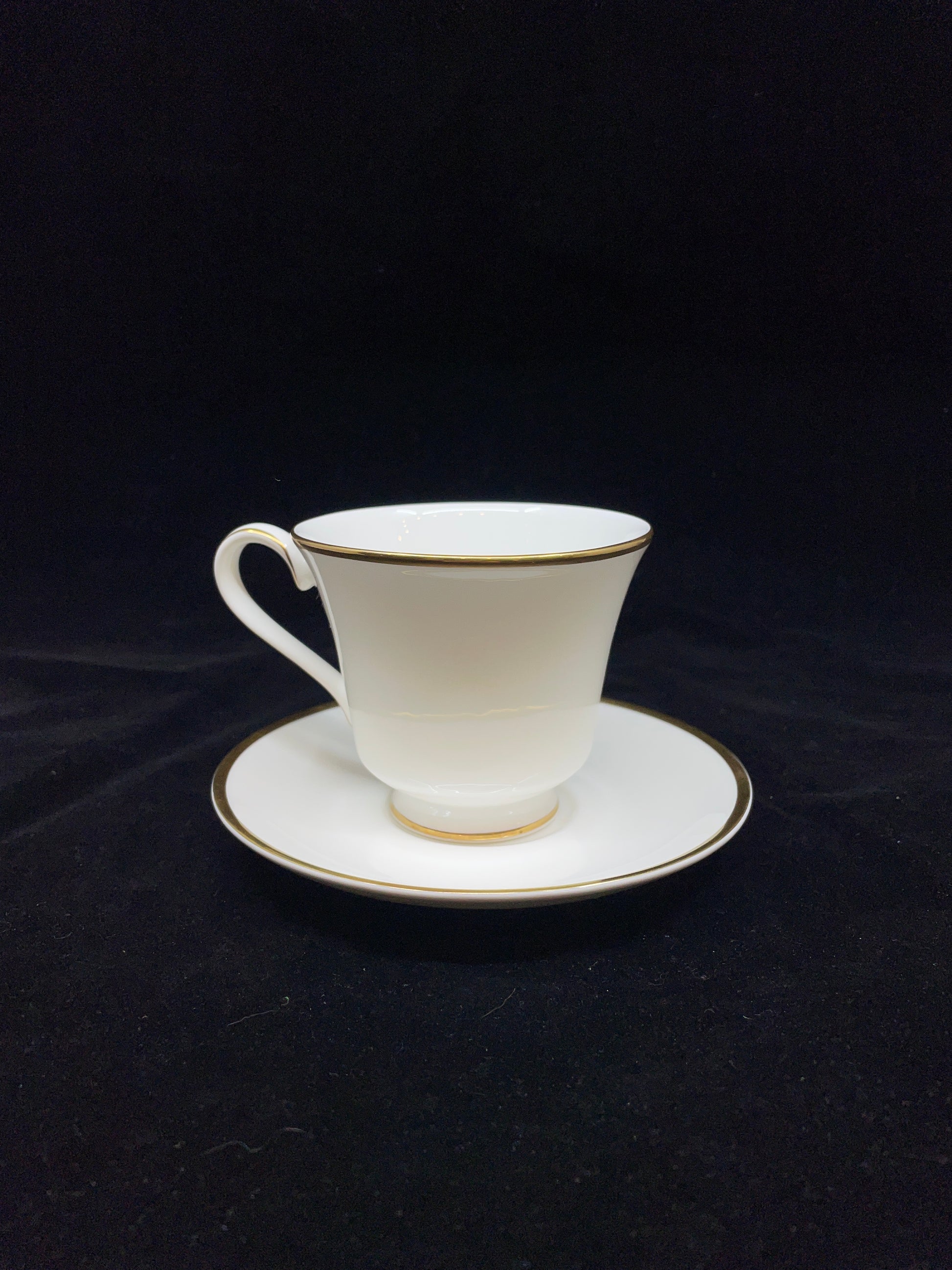 Royal Doulton "Alice" cup and saucer. This beautiful bone china has a white base with a gorgeous thin gold band around the rim of both the cup and saucer. An elegant set that's versatile and timeless thanks to its simple and sleek design.