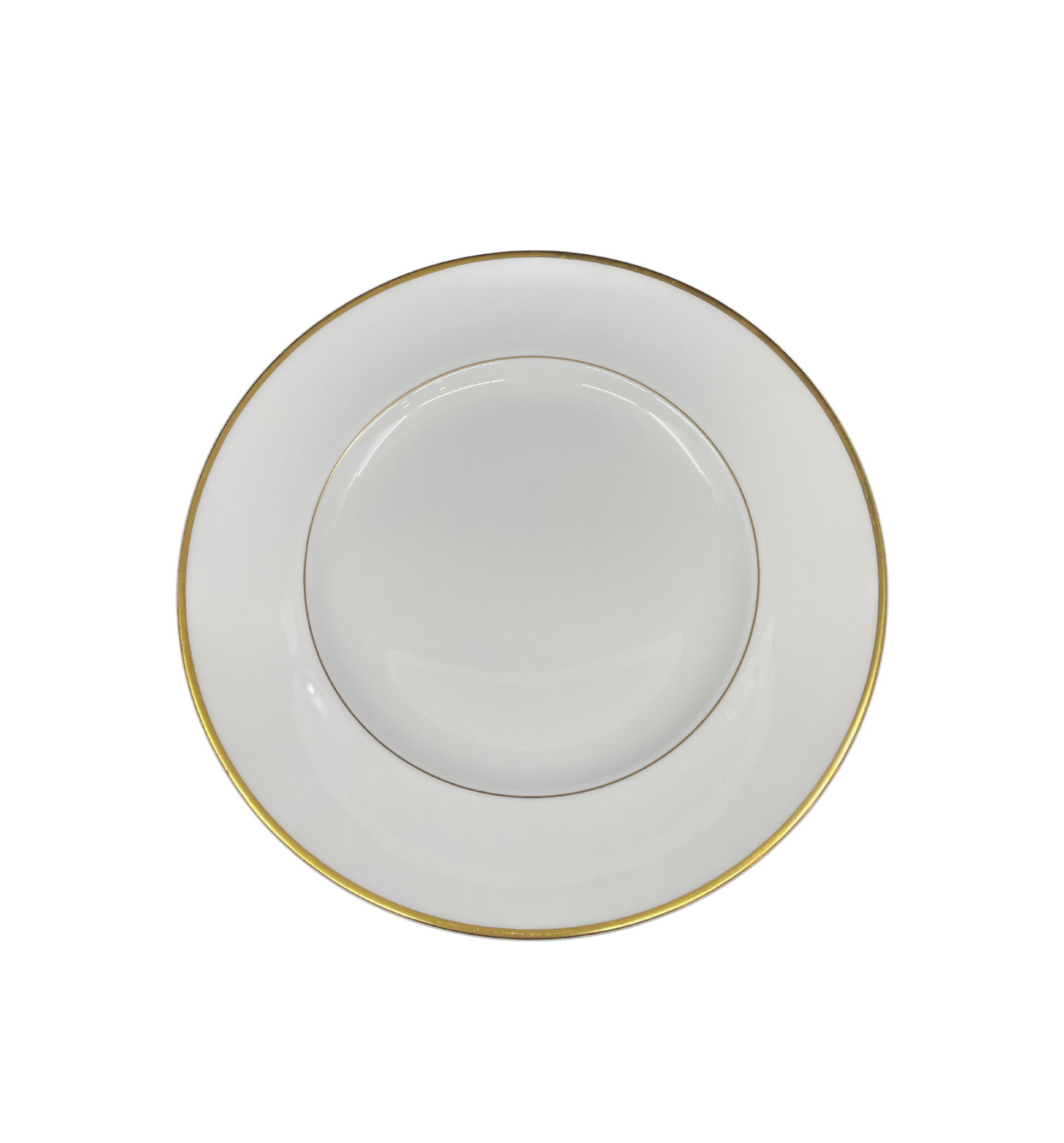 Royal Doulton "Alice" dinner plate. This beautiful bone china plate has a white base with a gorgeous thin gold band around both edges of the rim. An elegant piece that's versatile and timeless thanks to its simple and sleek design.
