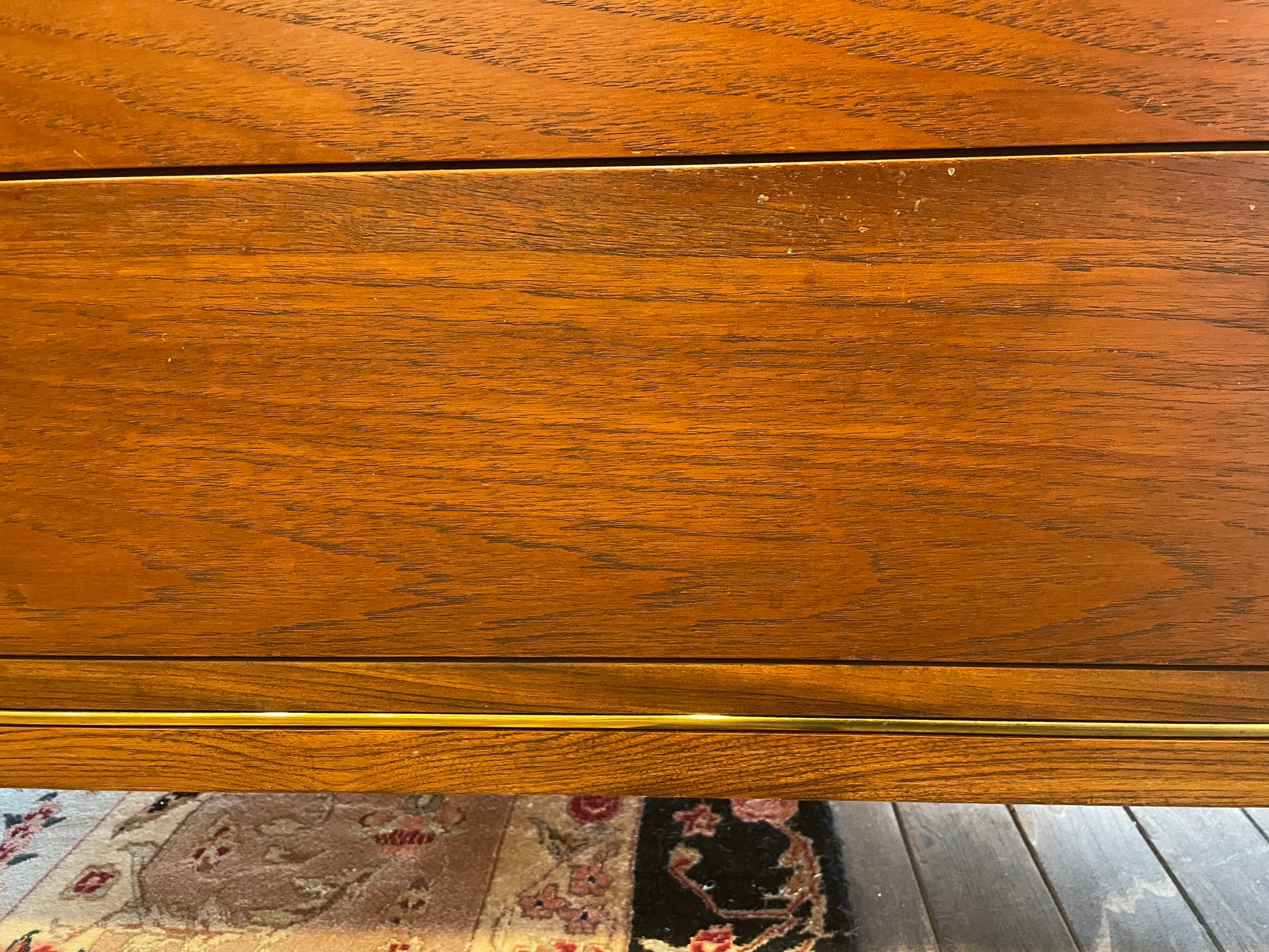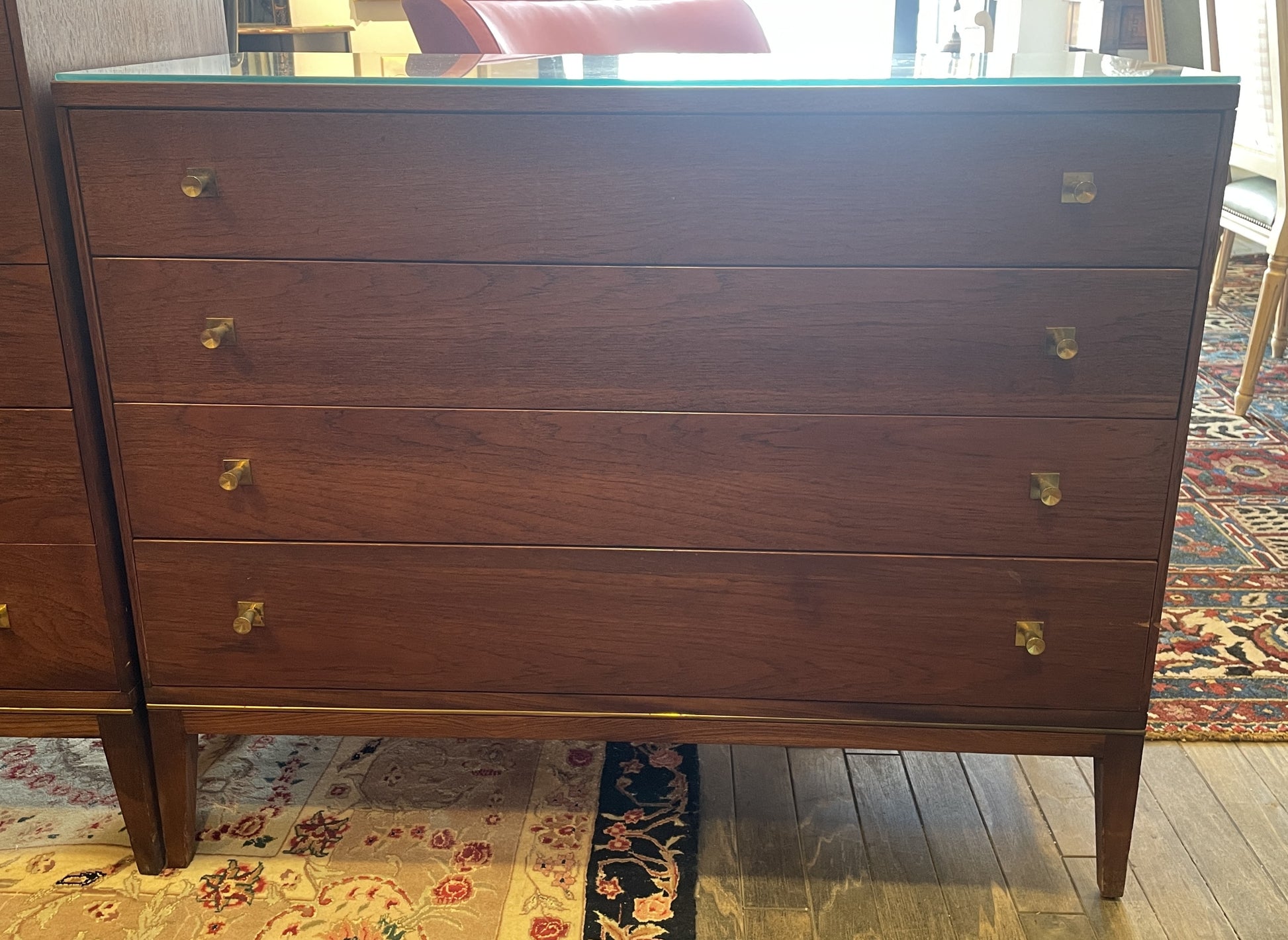 RWay mid century dresser. This charming dresser is crafted with walnut wood that has a gorgeous medium tone. The dresser sits on tapered legs and features a four drawer design. Each drawer has two small, cone-shaped brass knobs for easy opening. The dresser is protected by a layer of glass that lays flush against the top. The uppermost drawer is divided into three compartments. A line of brass accents the area between the lowest drawer and the legs. A functional dresser with a simple, yet eye-catching design.