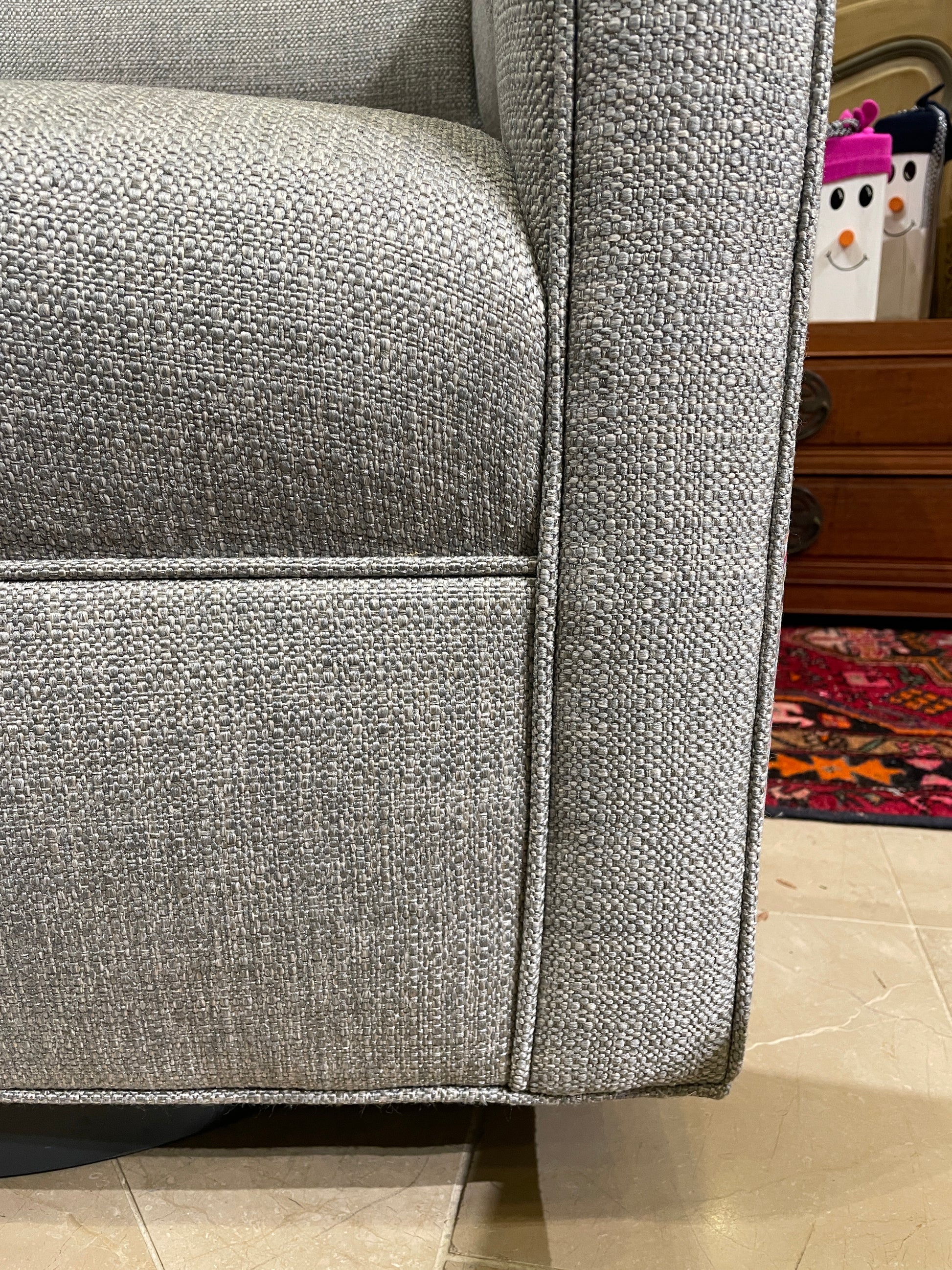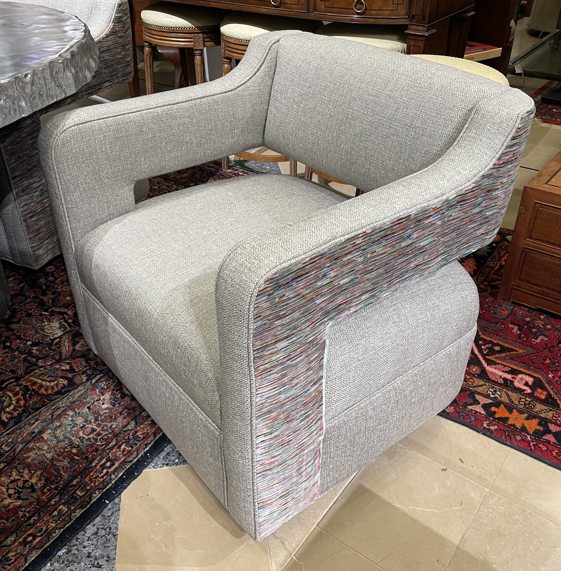 Sam Moore "Moani" swivel chair. This playful chair has an inviting shape and charming design. The majority of the chair is covered with a light gray fabric, and the exterior of the arms and back are covered with colorful velvety material. The velvety material features a unique design with short, horizontal lines in a rainbow of colors on a gray background. The chair sits on a swivel base, which is ideal for space saving. The shape of the chair is also unique with a cutout section underneath the back and arms which gives upper portion of the chair a floating appearance. The lower portion of the chair is square with rounded corners. This awesome chair is sure to add a touch of playfulness and contemporary comfort to any space.