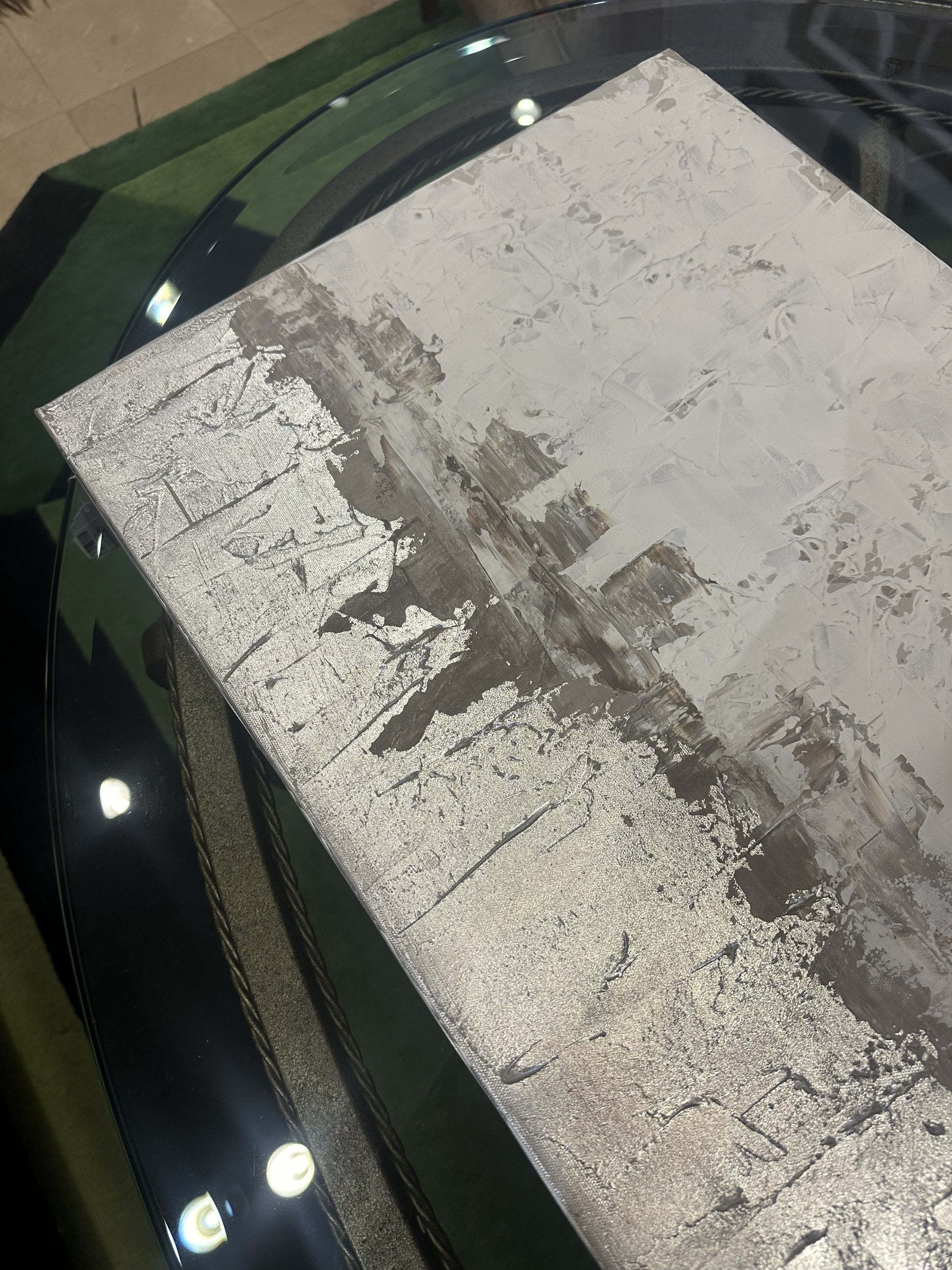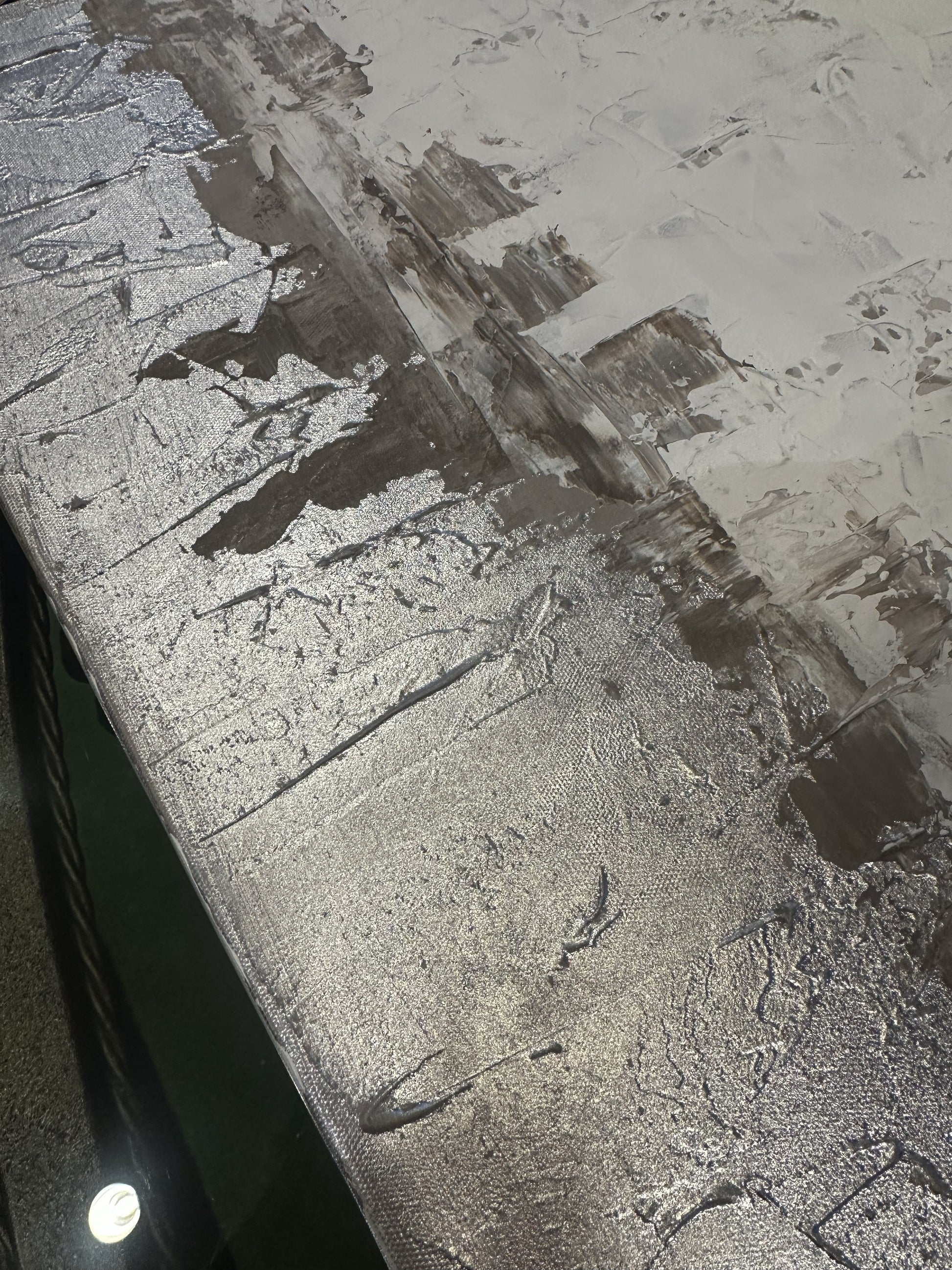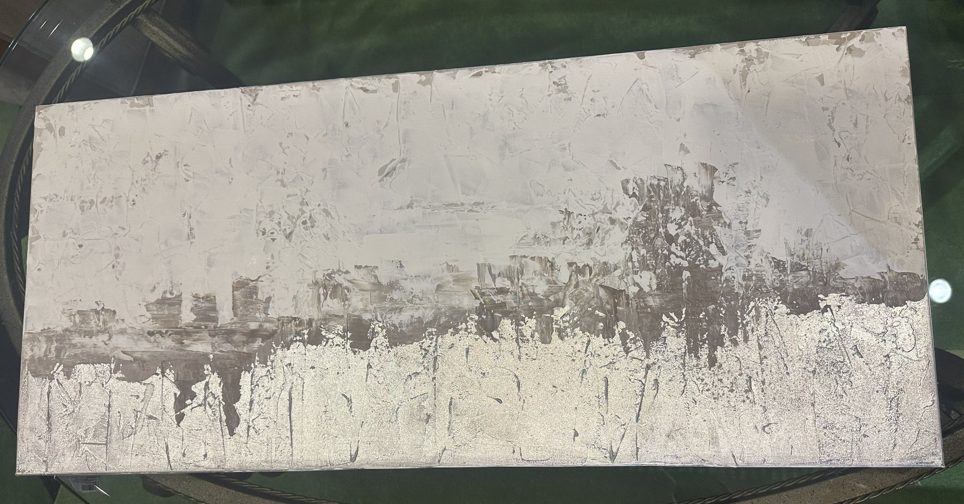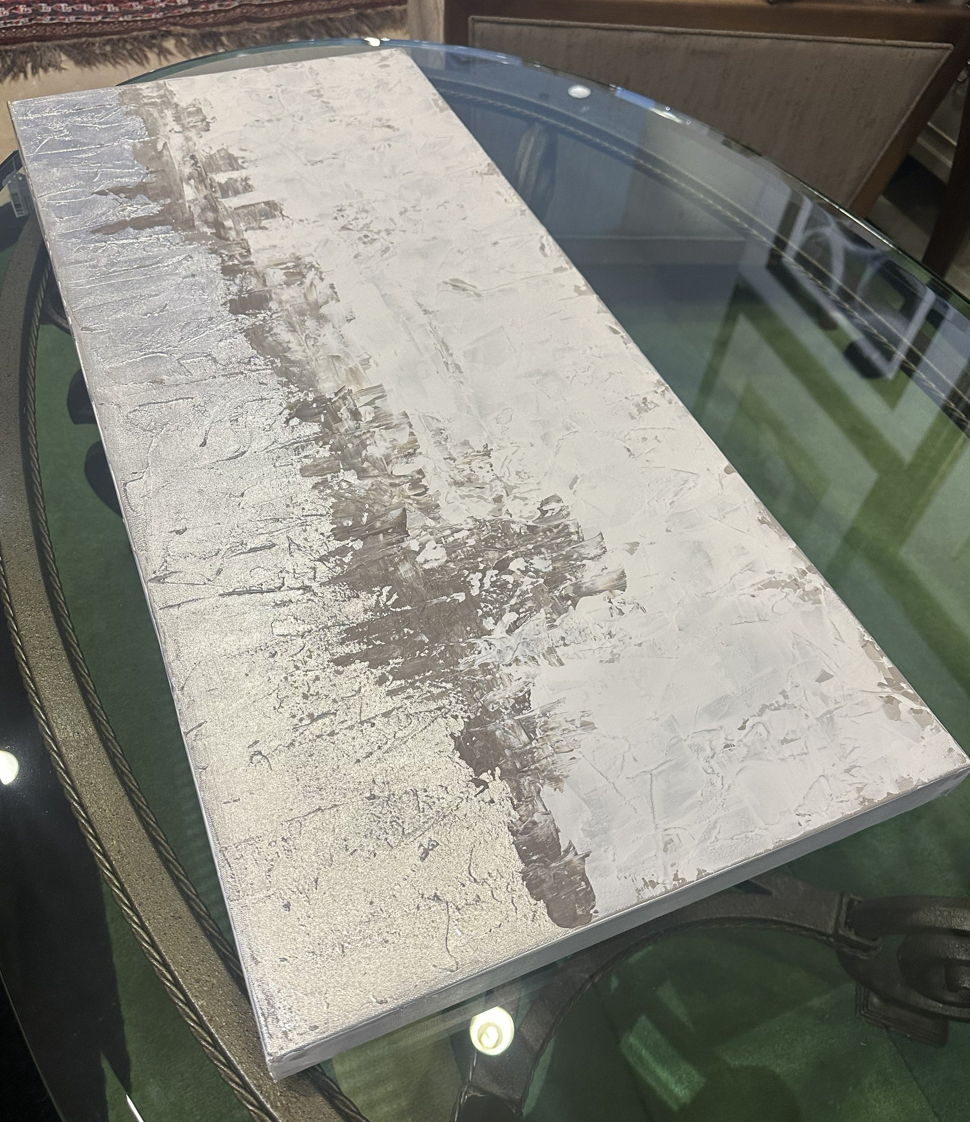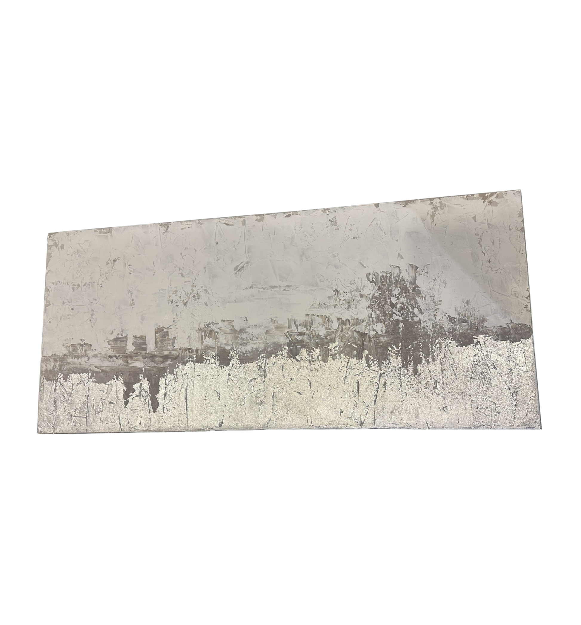Sarah Brooke "Somewhere Small" giclee in silver and white. Marked en verso. This beautiful abstract giclee features a palette of white, gray, and silver. A shining layer of silver lines the bottom of the piece, and gray and white layers sit above it. The colors are fairly flat, allowing texture to create visual interest in the piece. A beautiful neutral piece that's perfect to add a hint of silver to any space.