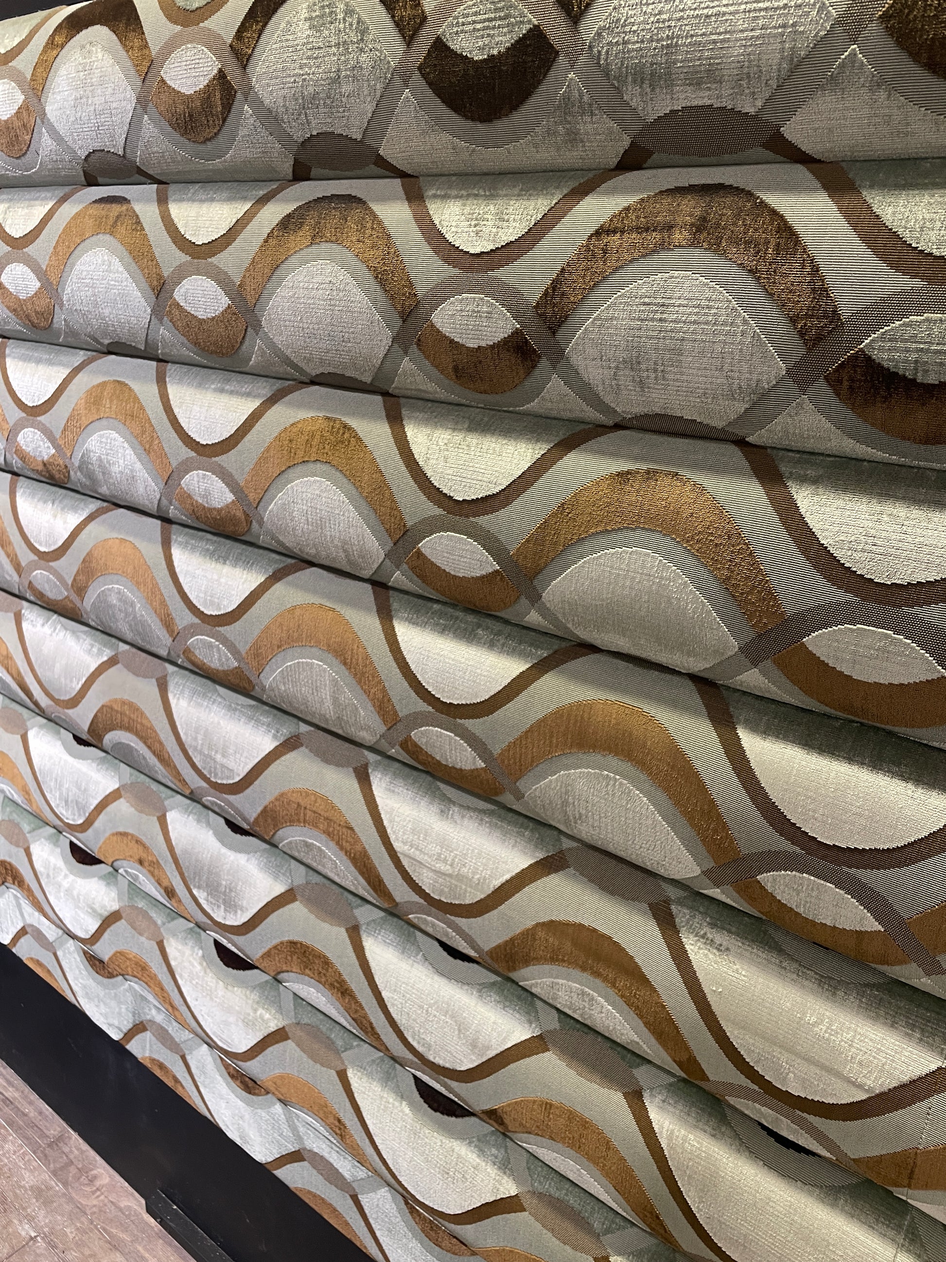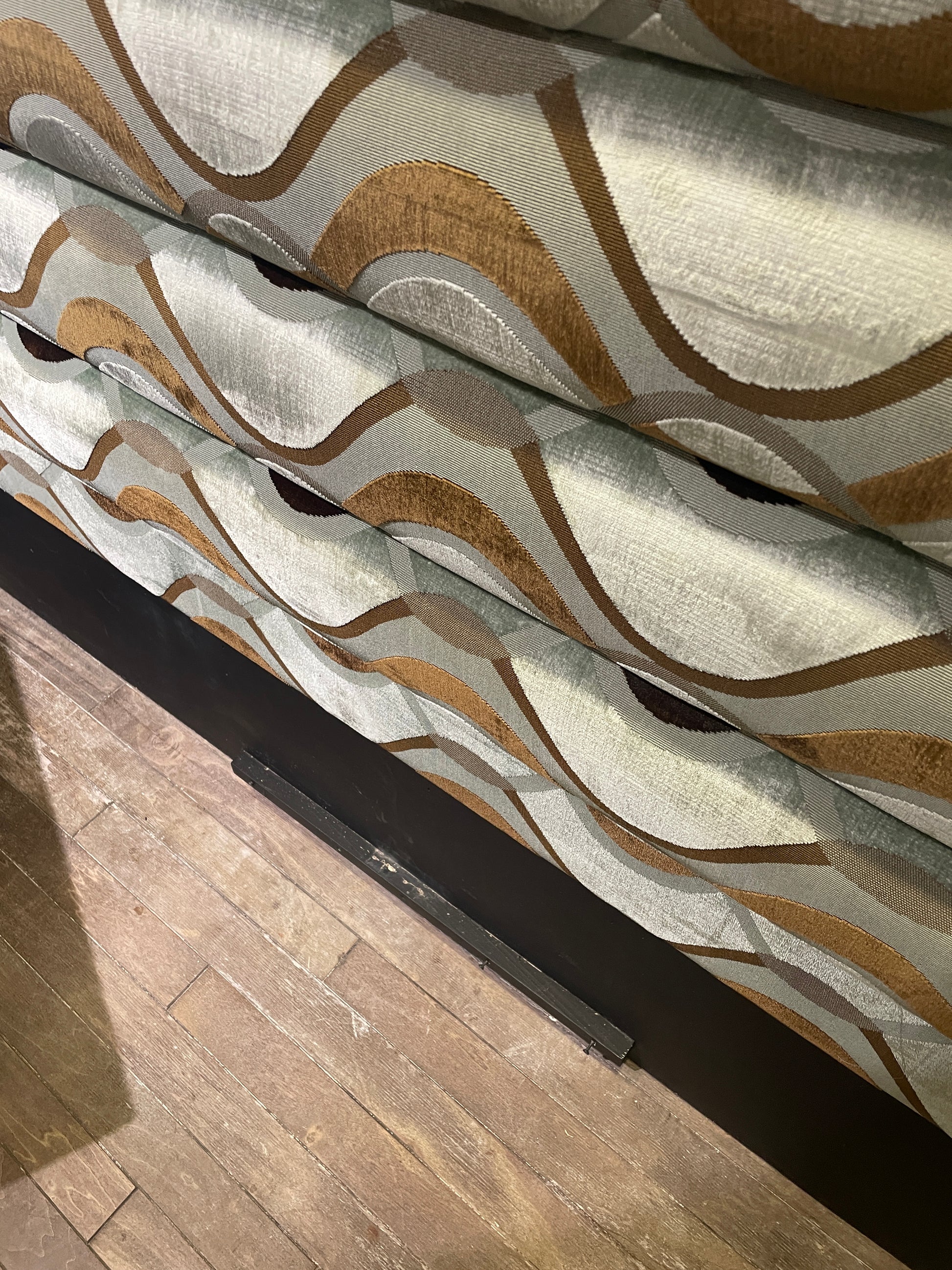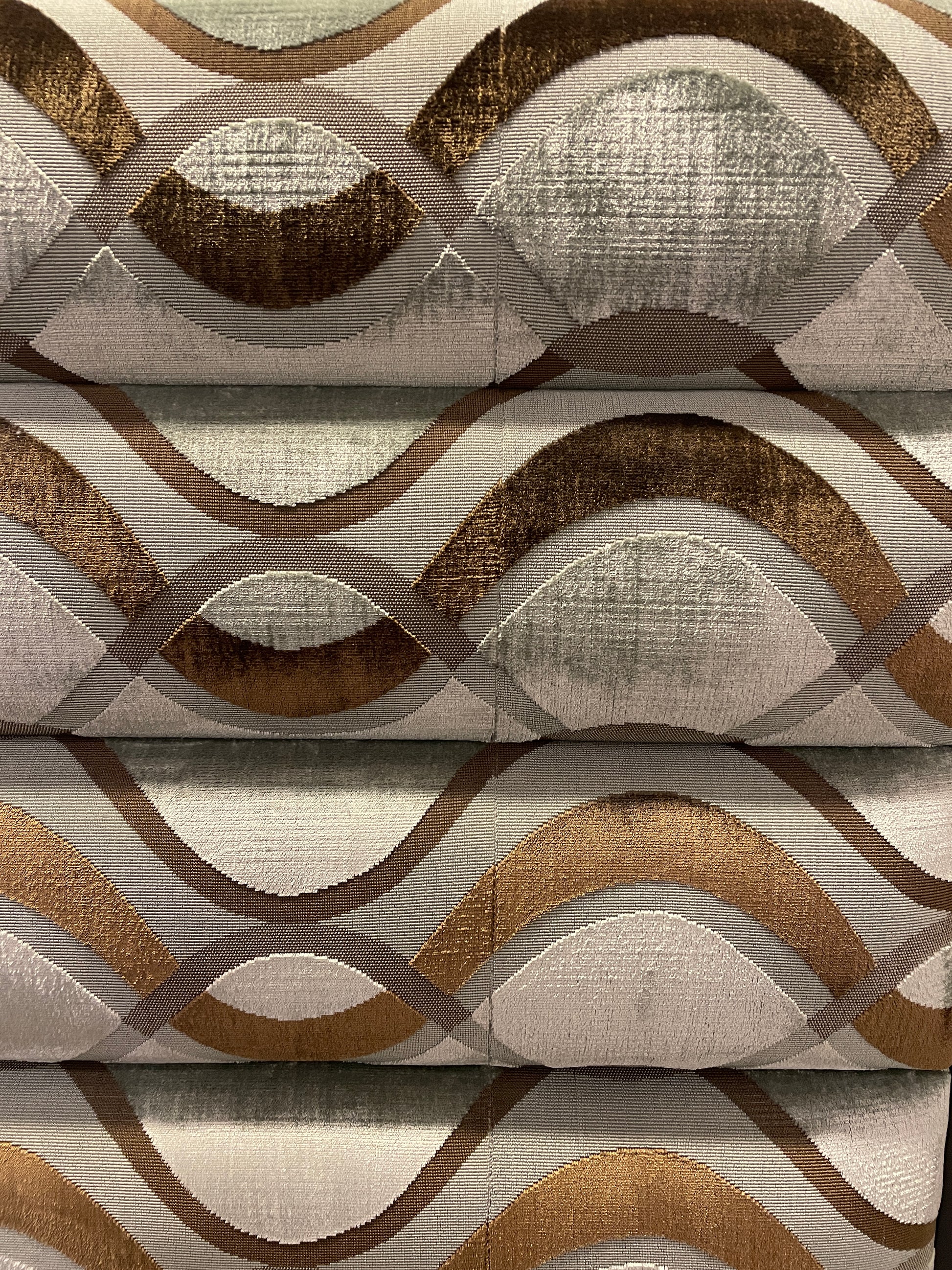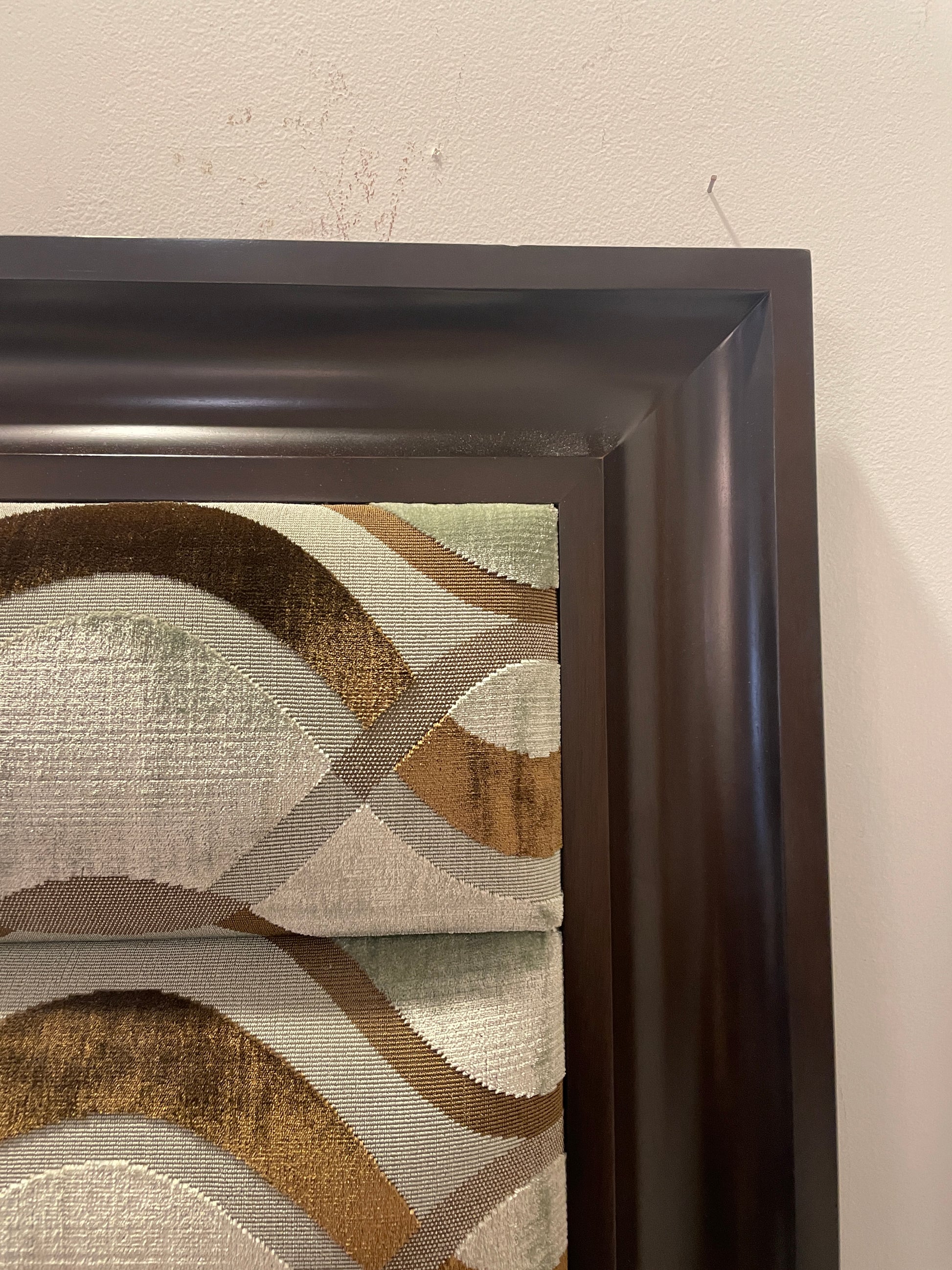 Upholstered king bed frame by the brand Scott Arthur Yerkey. Features a large, upholstered headboard with curvy line details in a brown and blue color with textured fabric. The outer edge of the headboard has a wooden frame in a very deep brown color. The bedframe includes the headboard, footboard, sideboards, rails, support, and center support.