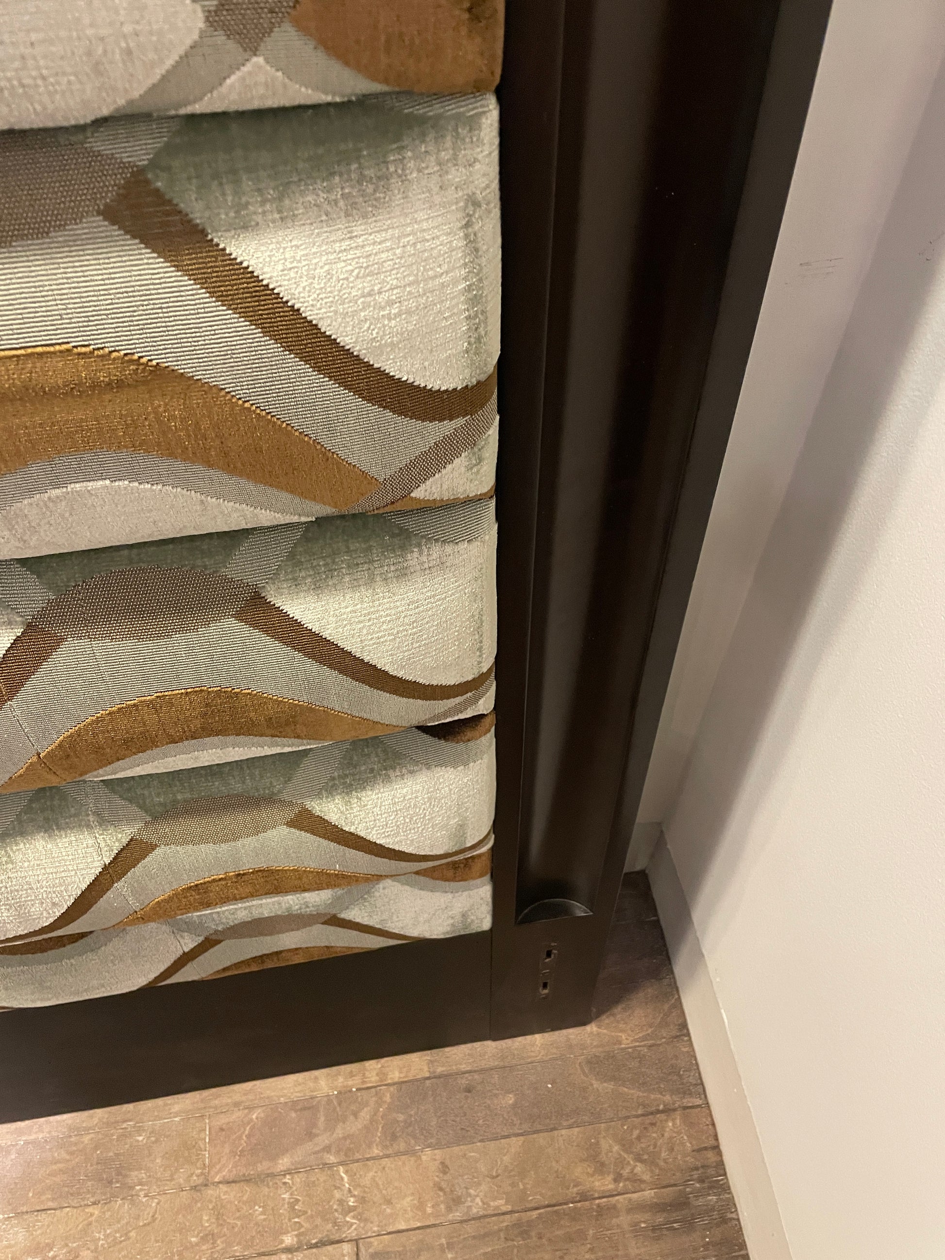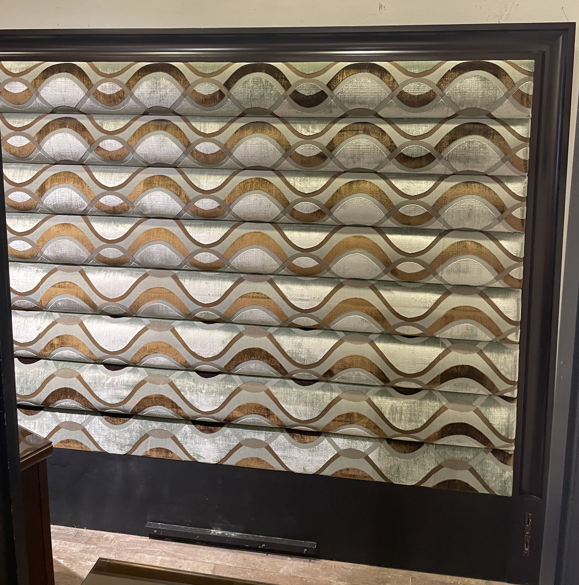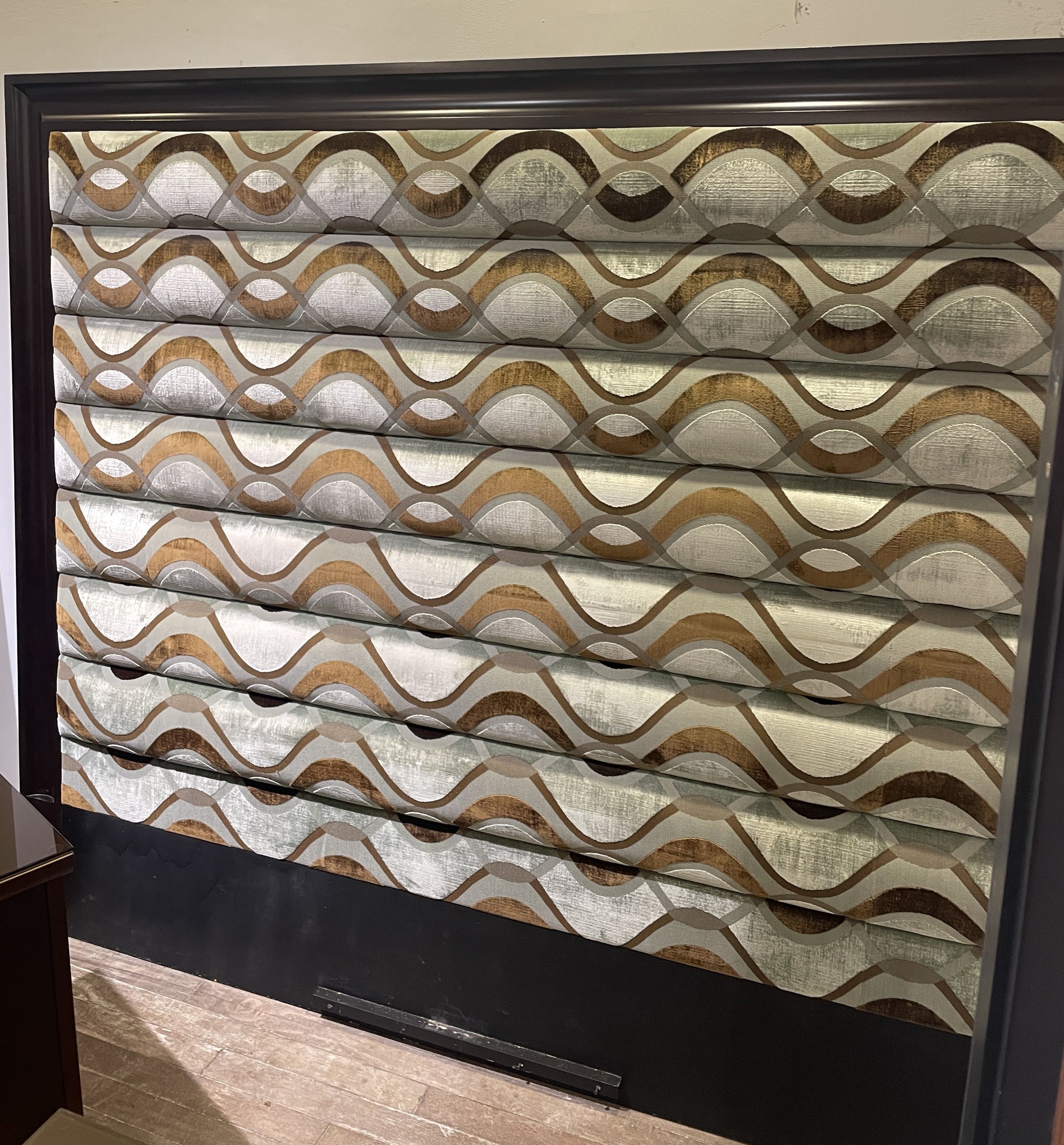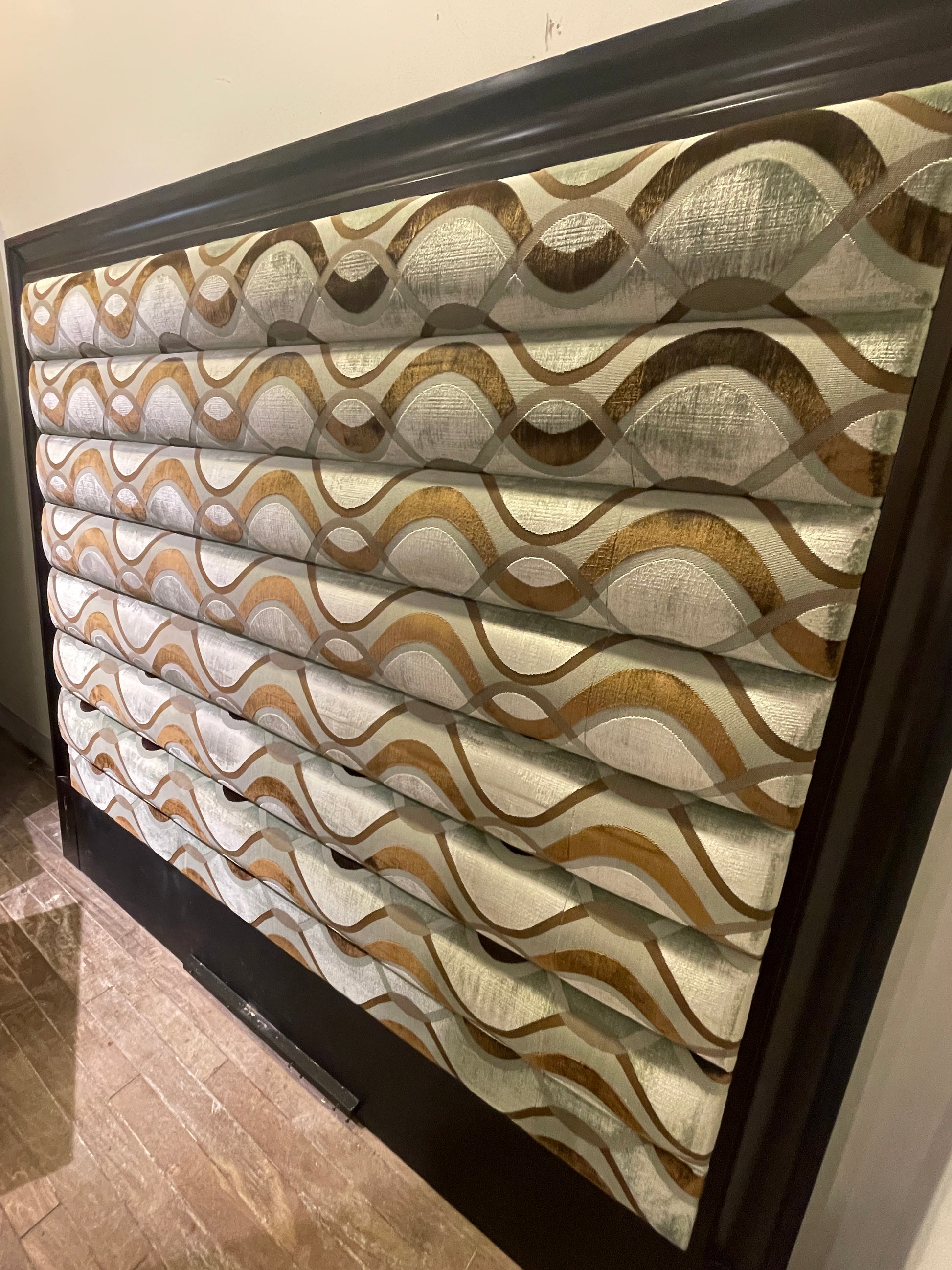 Upholstered king bed frame by the brand Scott Arthur Yerkey. Features a large, upholstered headboard with curvy line details in a brown and blue color with textured fabric. The outer edge of the headboard has a wooden frame in a very deep brown color. The bedframe includes the headboard, footboard, sideboards, rails, support, and center support.
