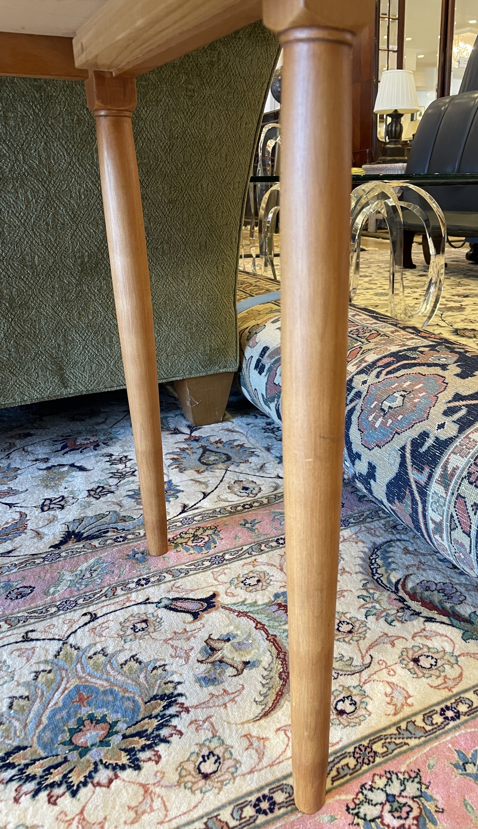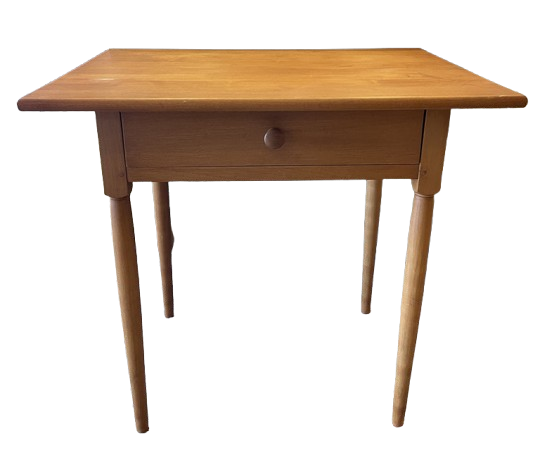 Light cherry shaker end table featuring a rectangular top and a singular drawer for storage. Complete by skinny, turned legs. There are some minor marks on the top. Shown in pictures.