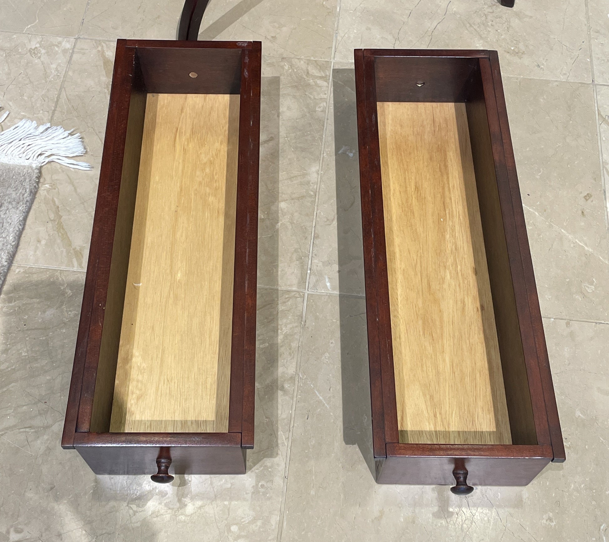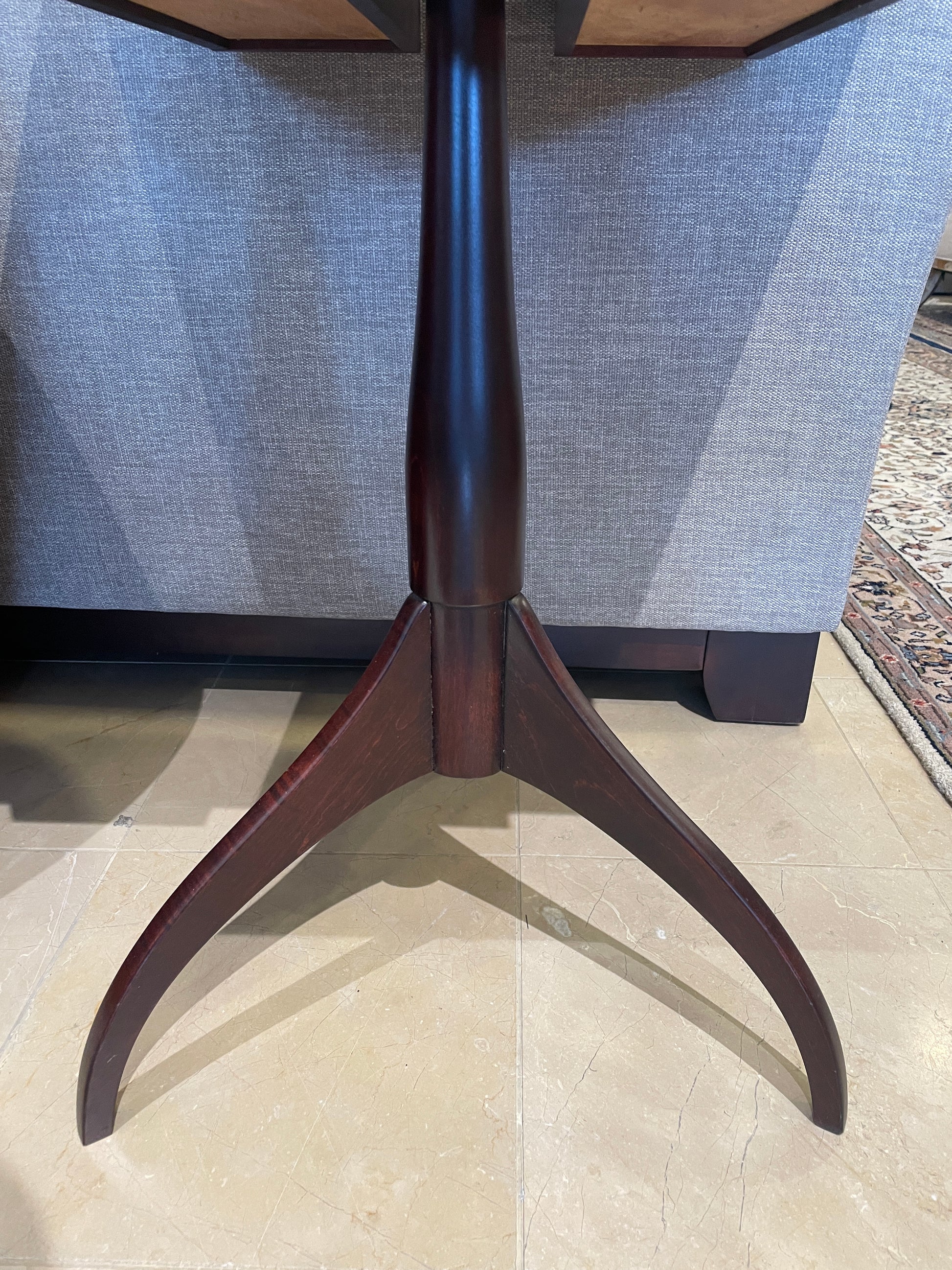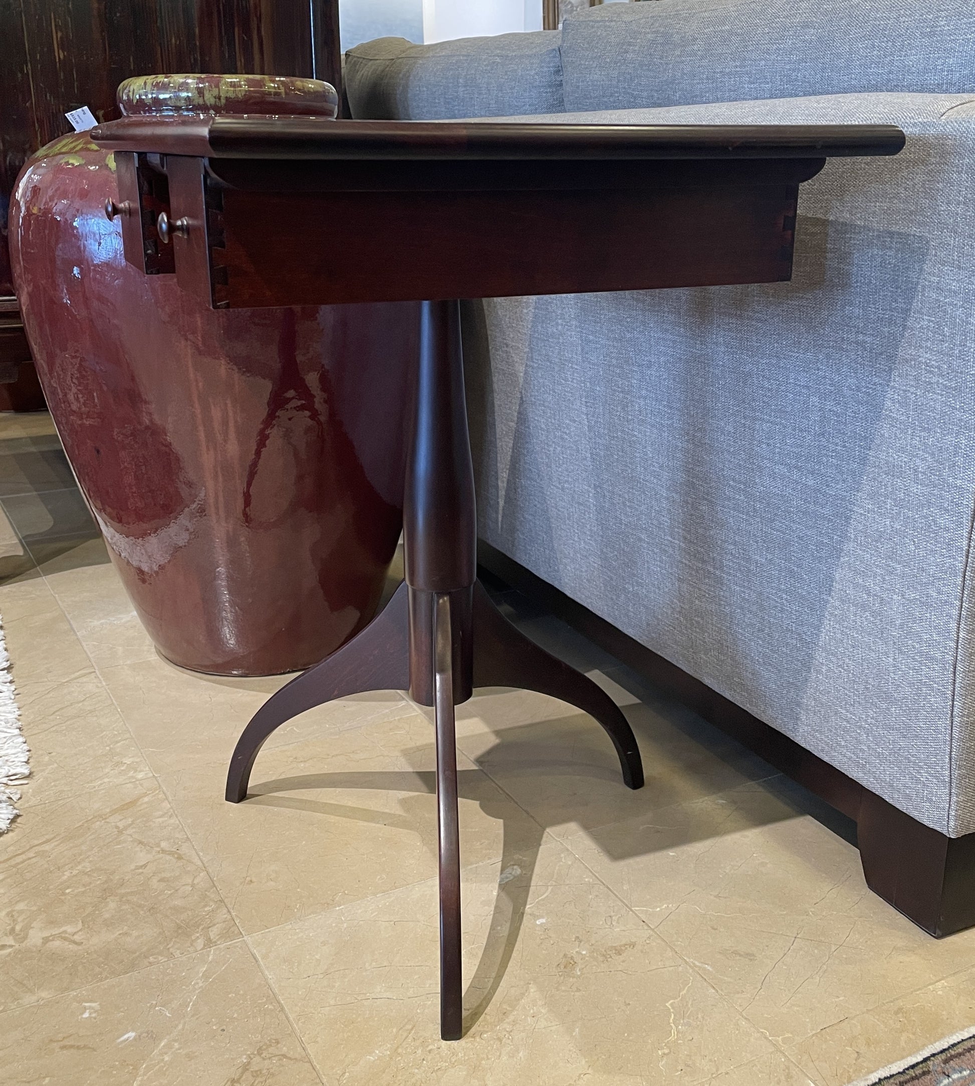 Shaker sewing table featuring a cherry finish and 2 long, skinny drawers for storage. The drawers slide out on each end and have round wooden knobs. the table is complete with simple, curved spider legs that fit to a turned post.