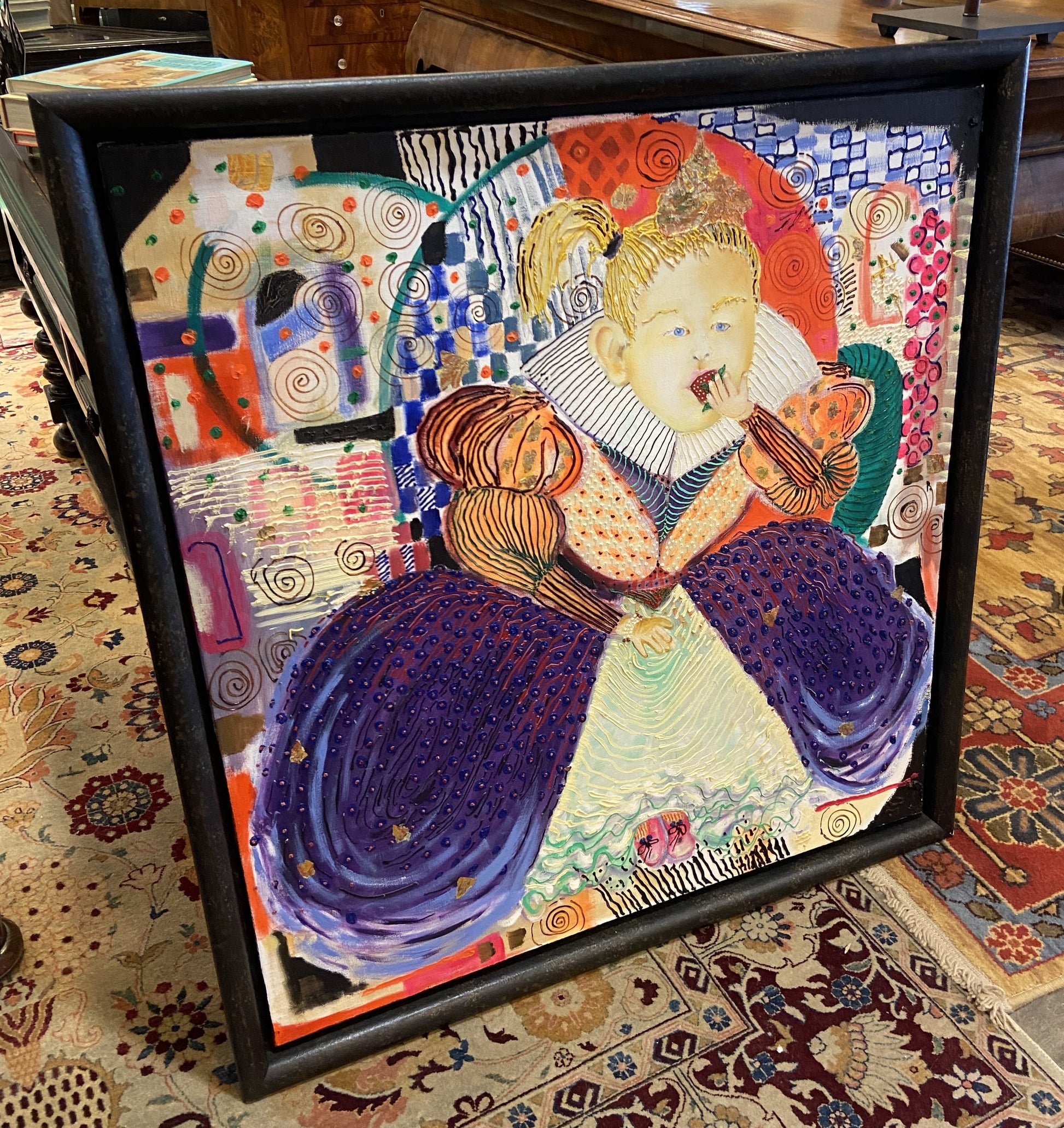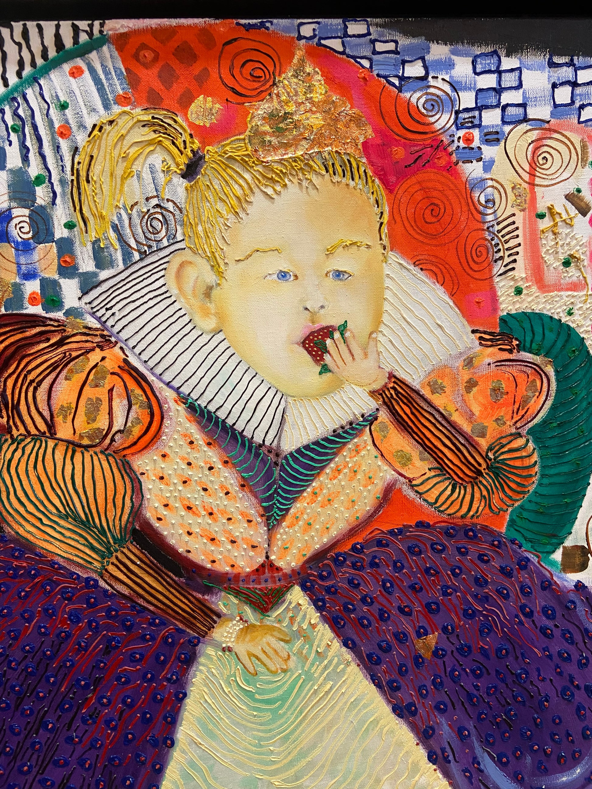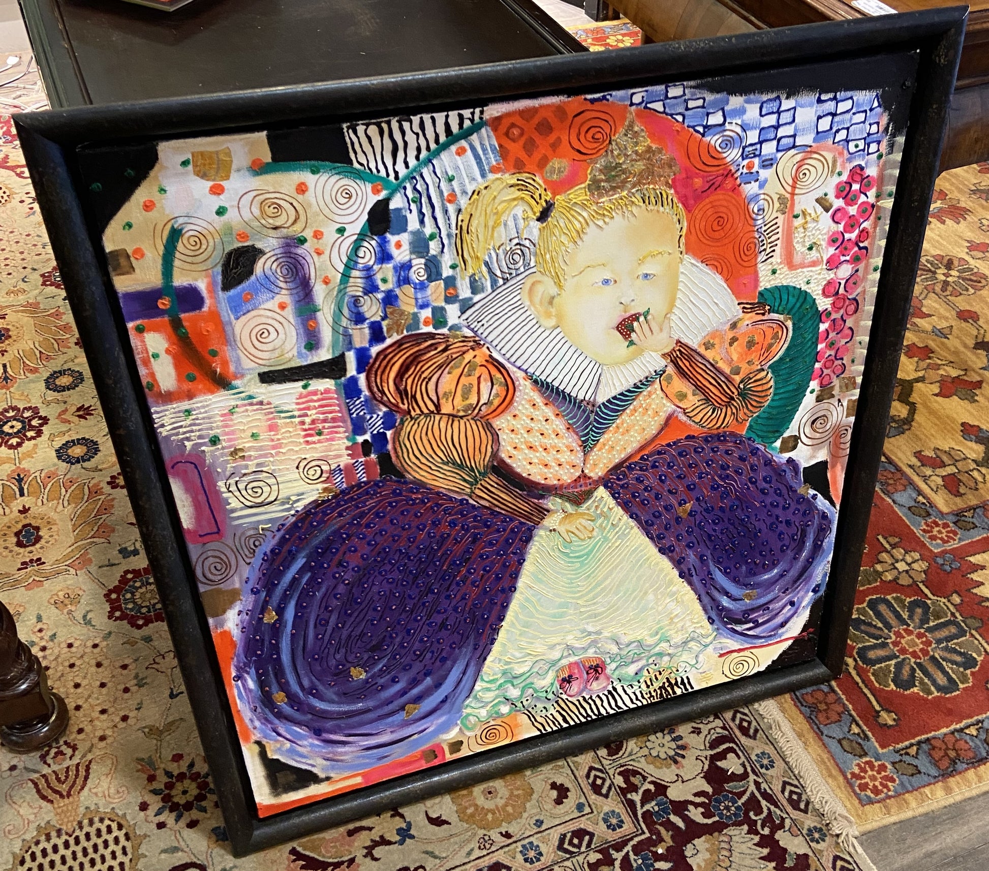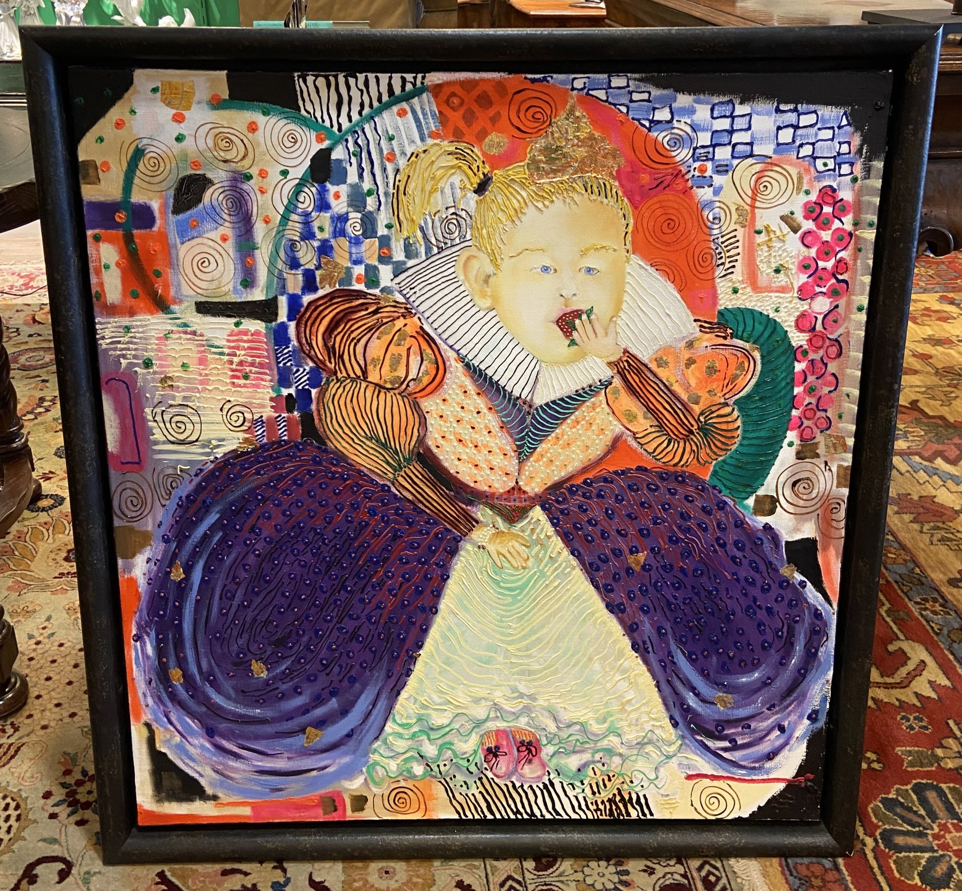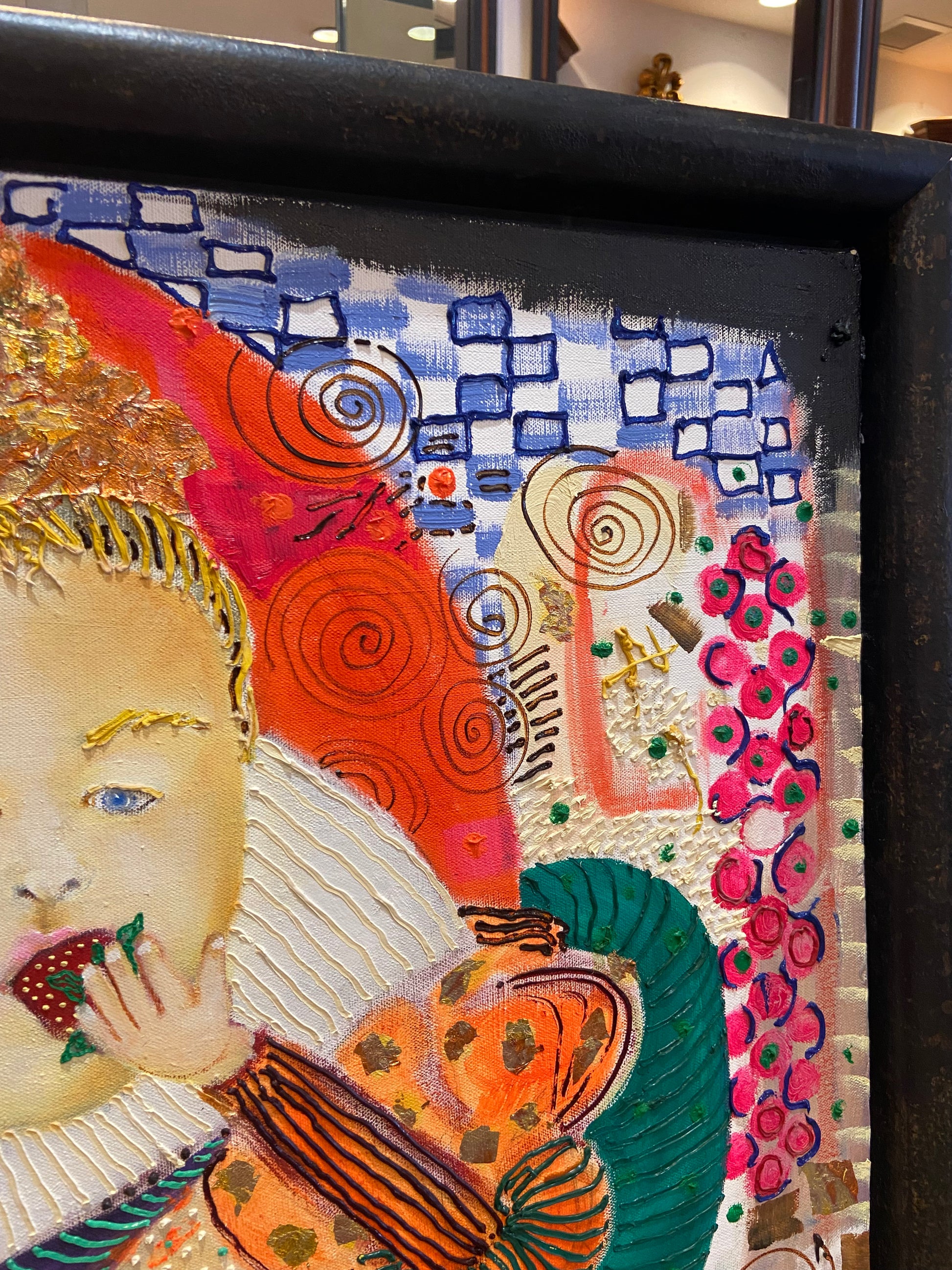 Colorful oil on canvas painting titled "The Strawberry Princess" by artist Sherri Lee Butler. Features a girl in a large dress with a gold foil crown eating a strawberry. Elevated paint details adorn the entirety of the piece giving it a rich, textured appearance. Colors include red, purple, pink, and yellow tones. The painting has a playful, eclectic appearance and is held in a black metal frame which allows its color to shine through. An informational card is present on the back of the frame.