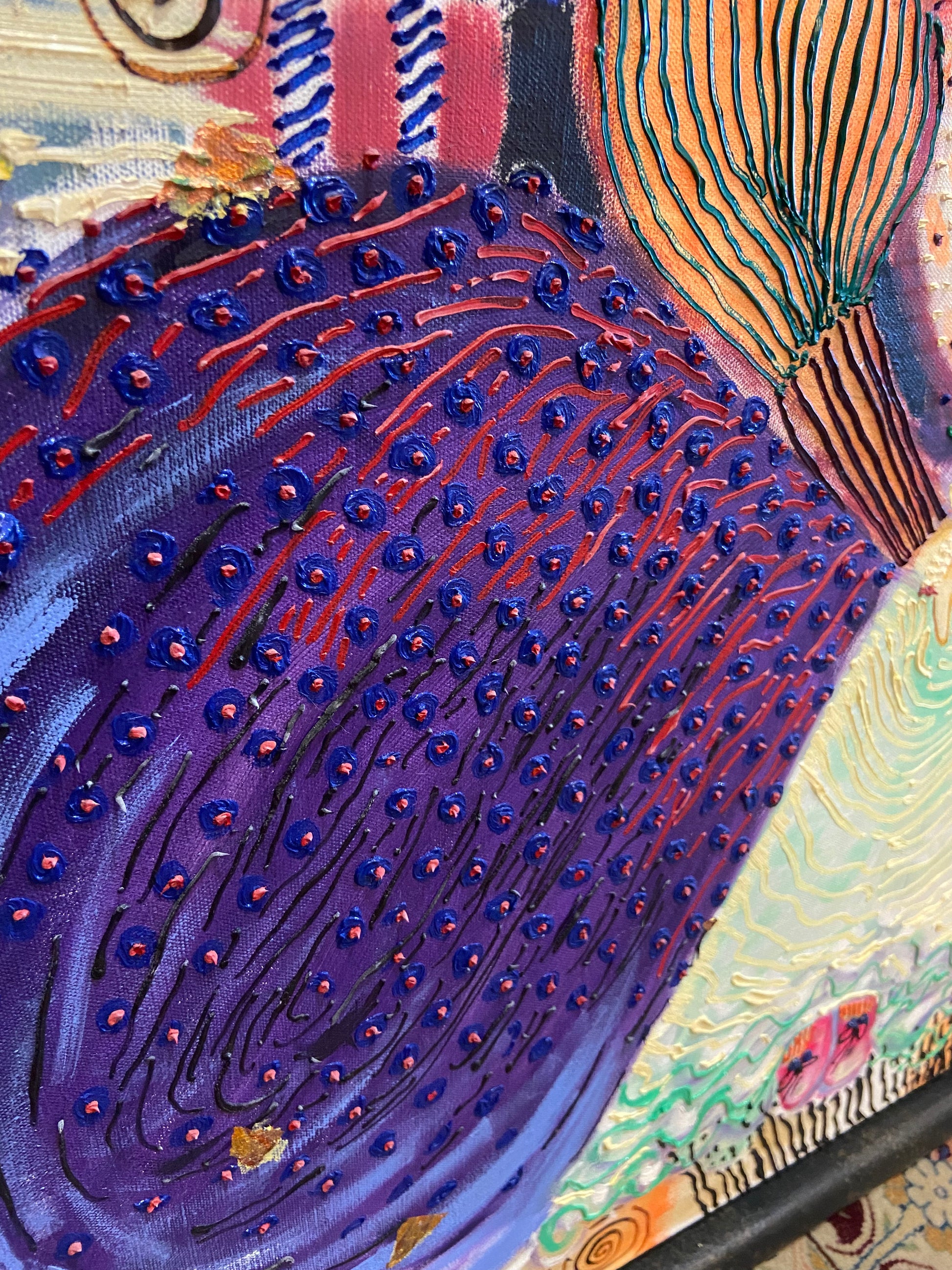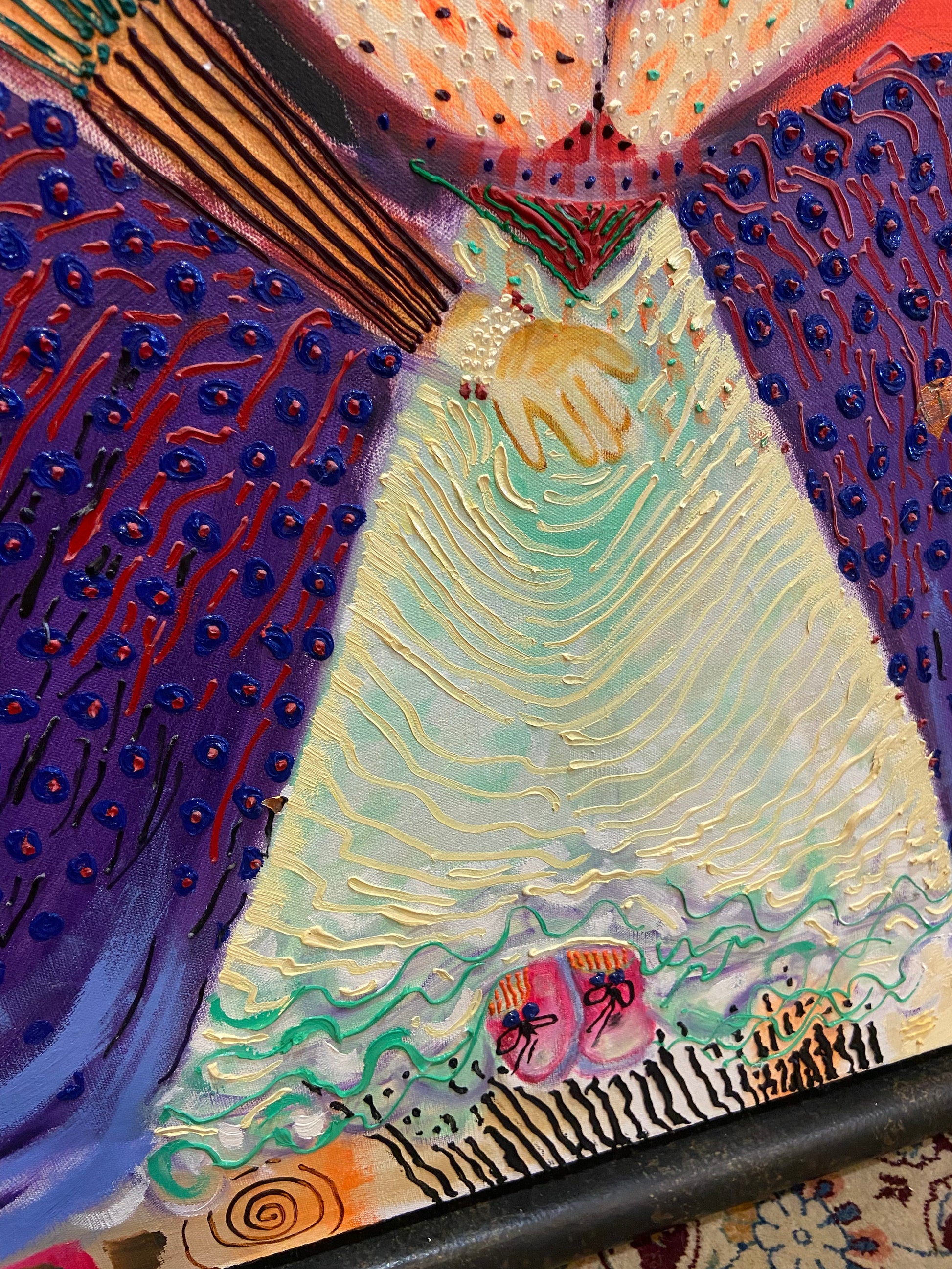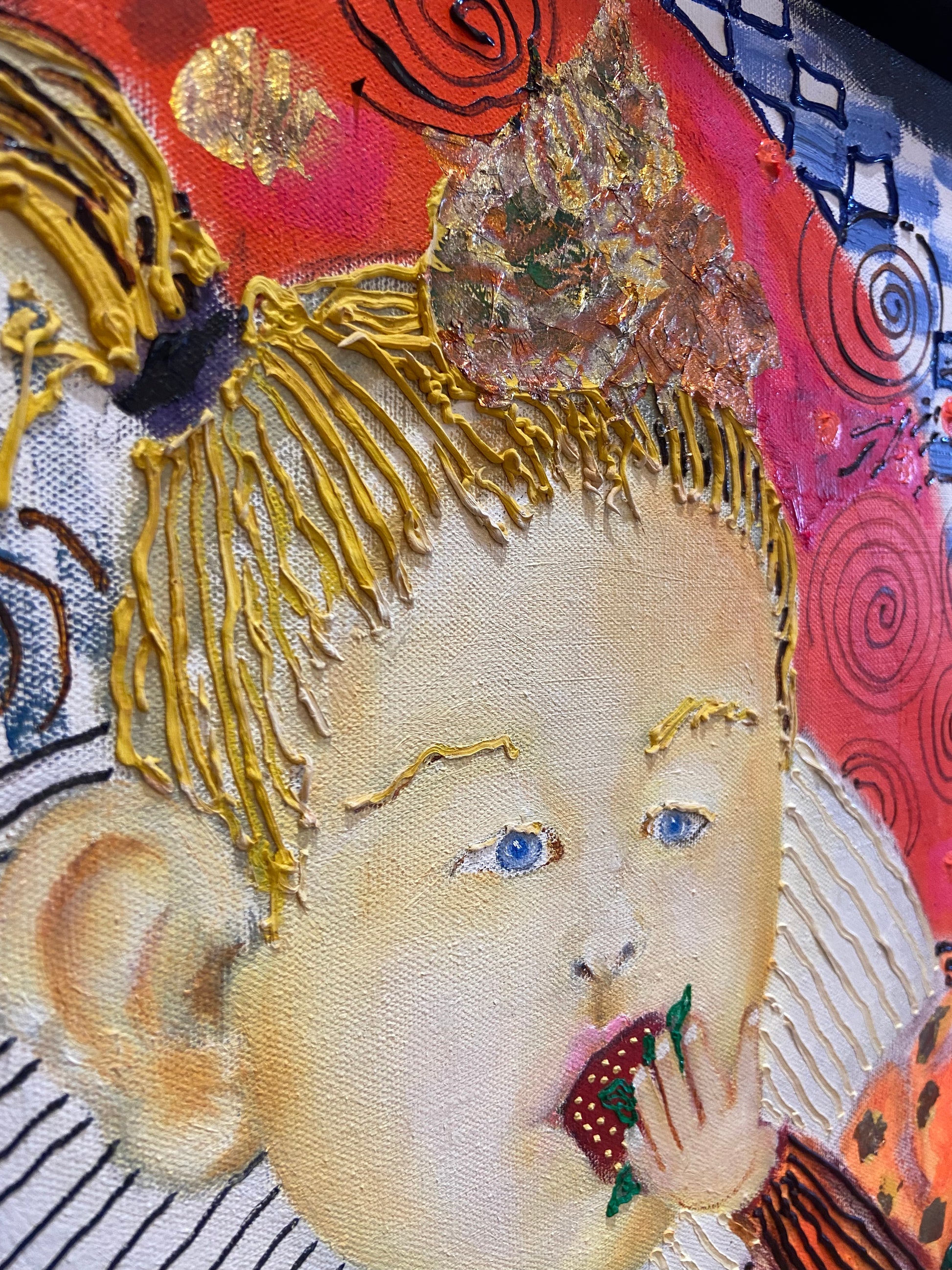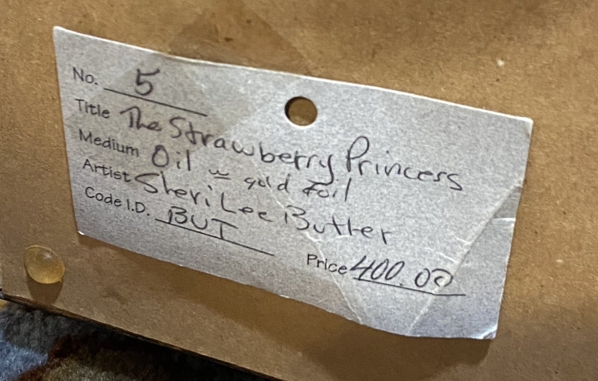 Colorful oil on canvas painting titled "The Strawberry Princess" by artist Sherri Lee Butler. Features a girl in a large dress with a gold foil crown eating a strawberry. Elevated paint details adorn the entirety of the piece giving it a rich, textured appearance. Colors include red, purple, pink, and yellow tones. The painting has a playful, eclectic appearance and is held in a black metal frame which allows its color to shine through. An informational card is present on the back of the frame.