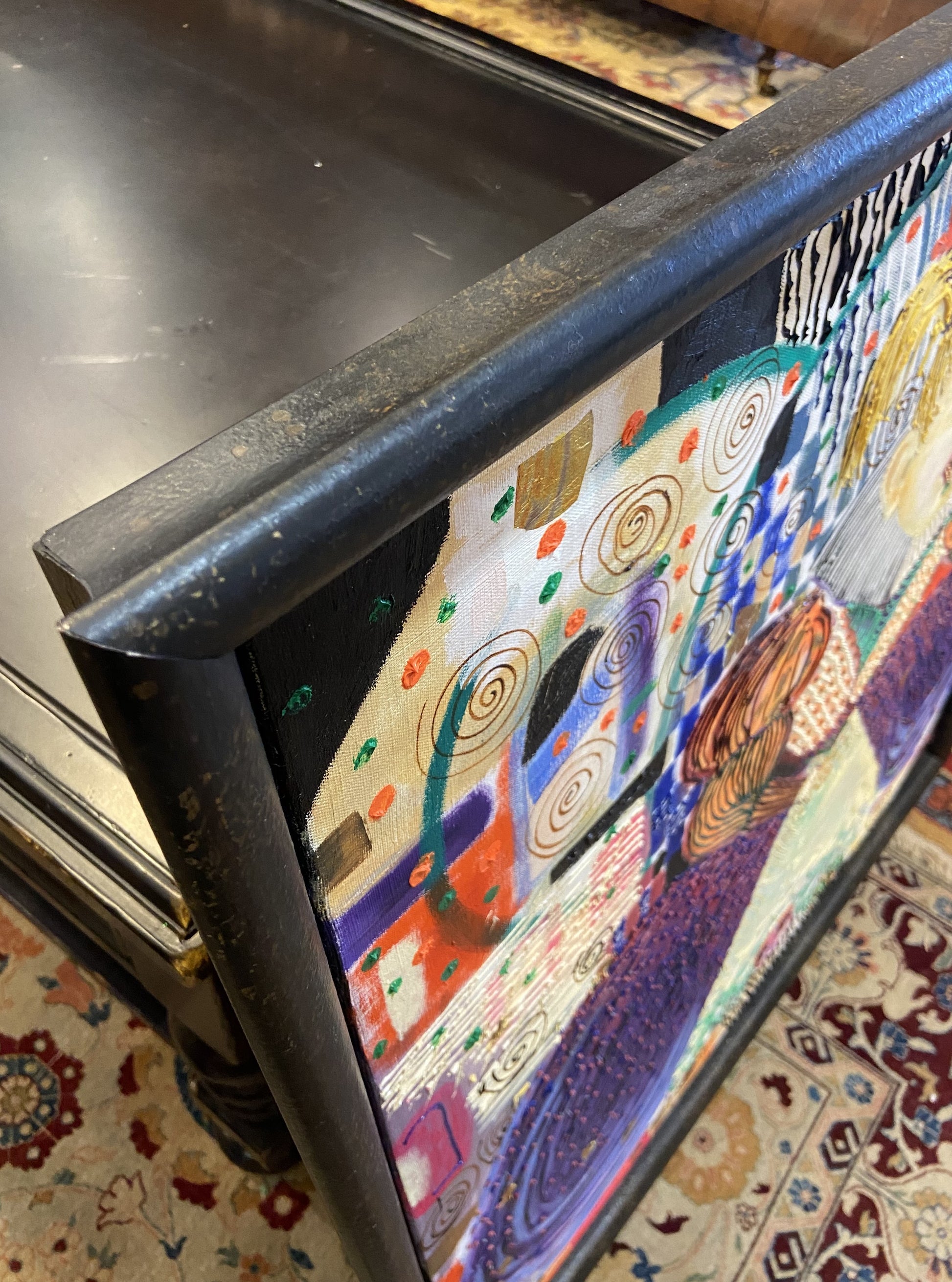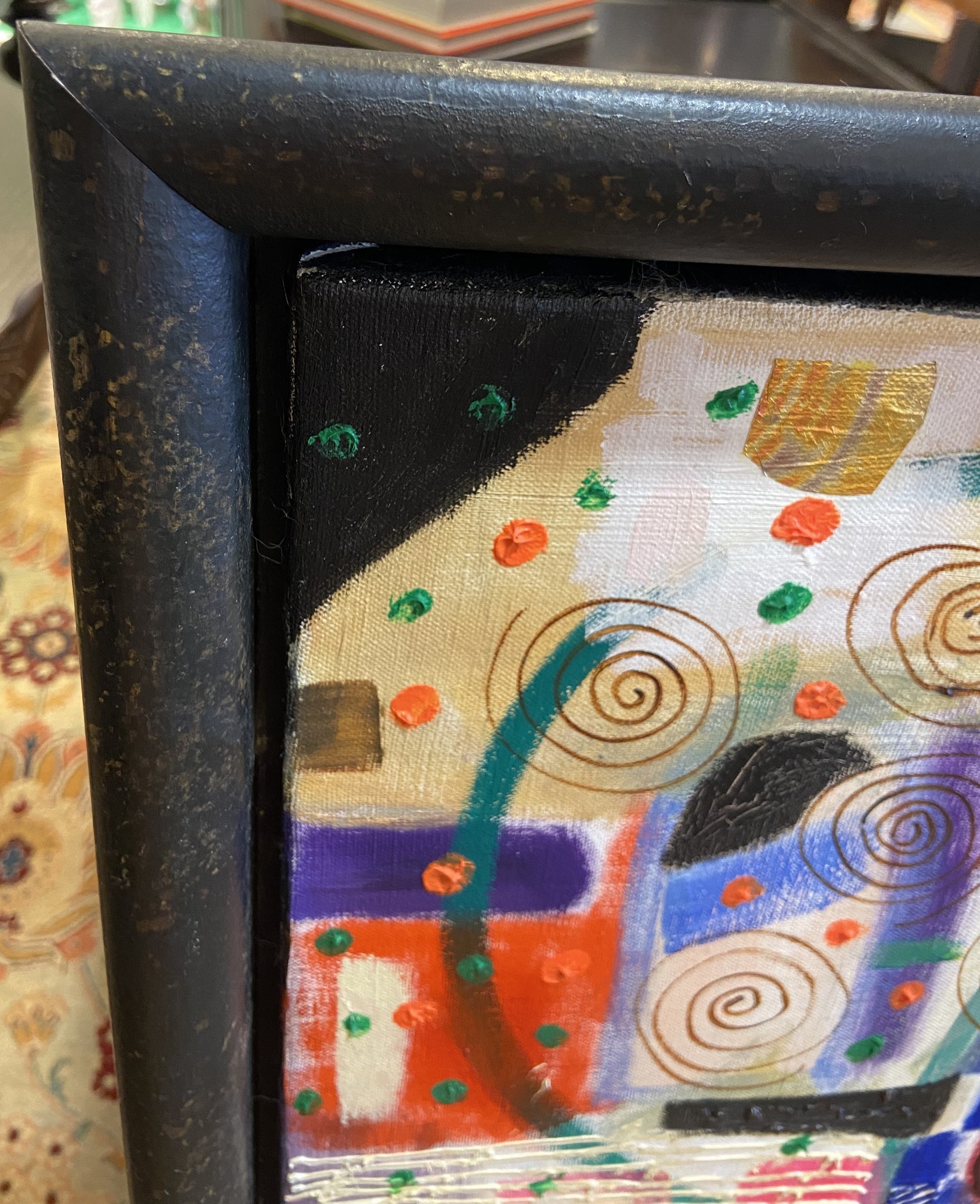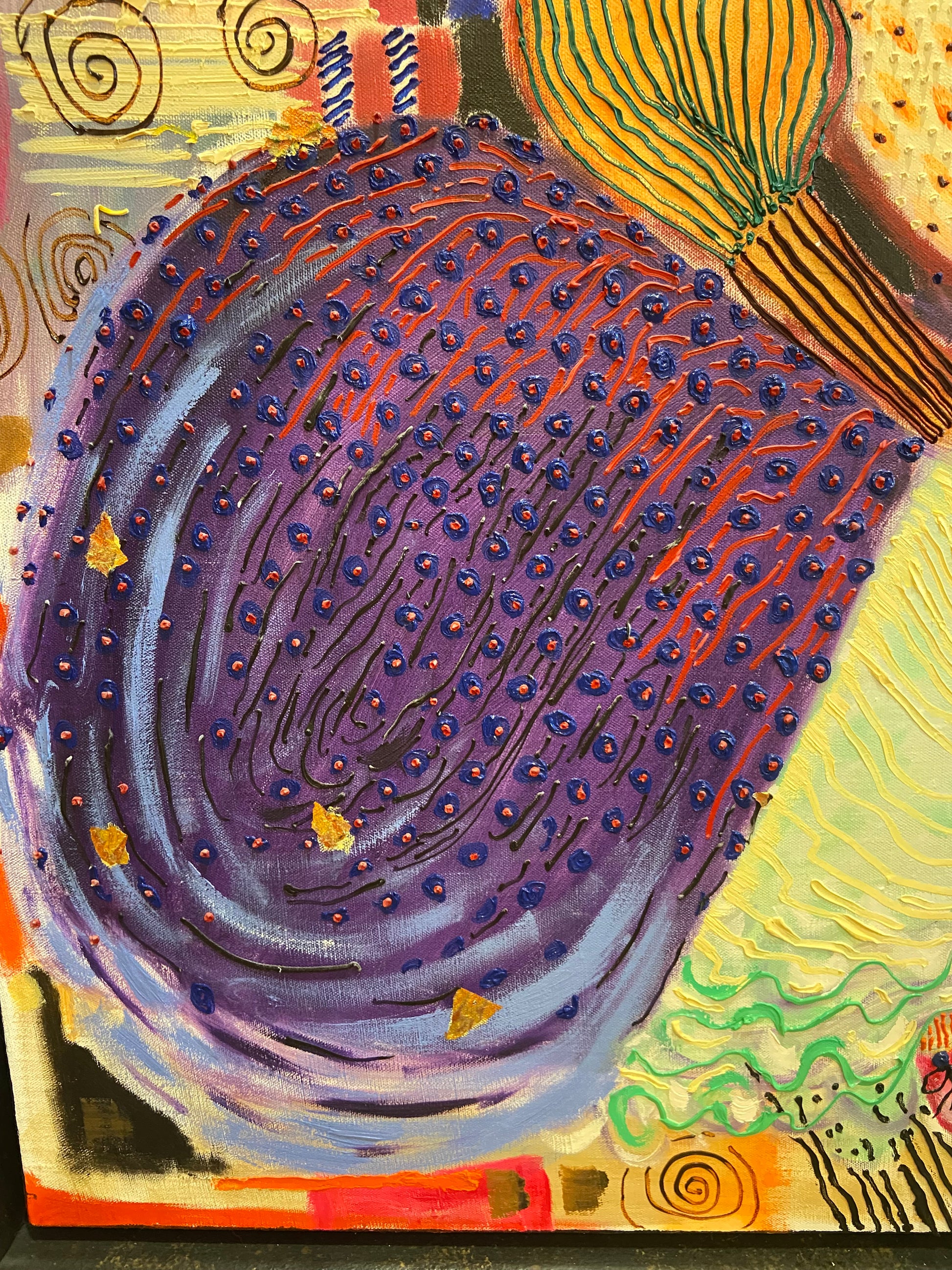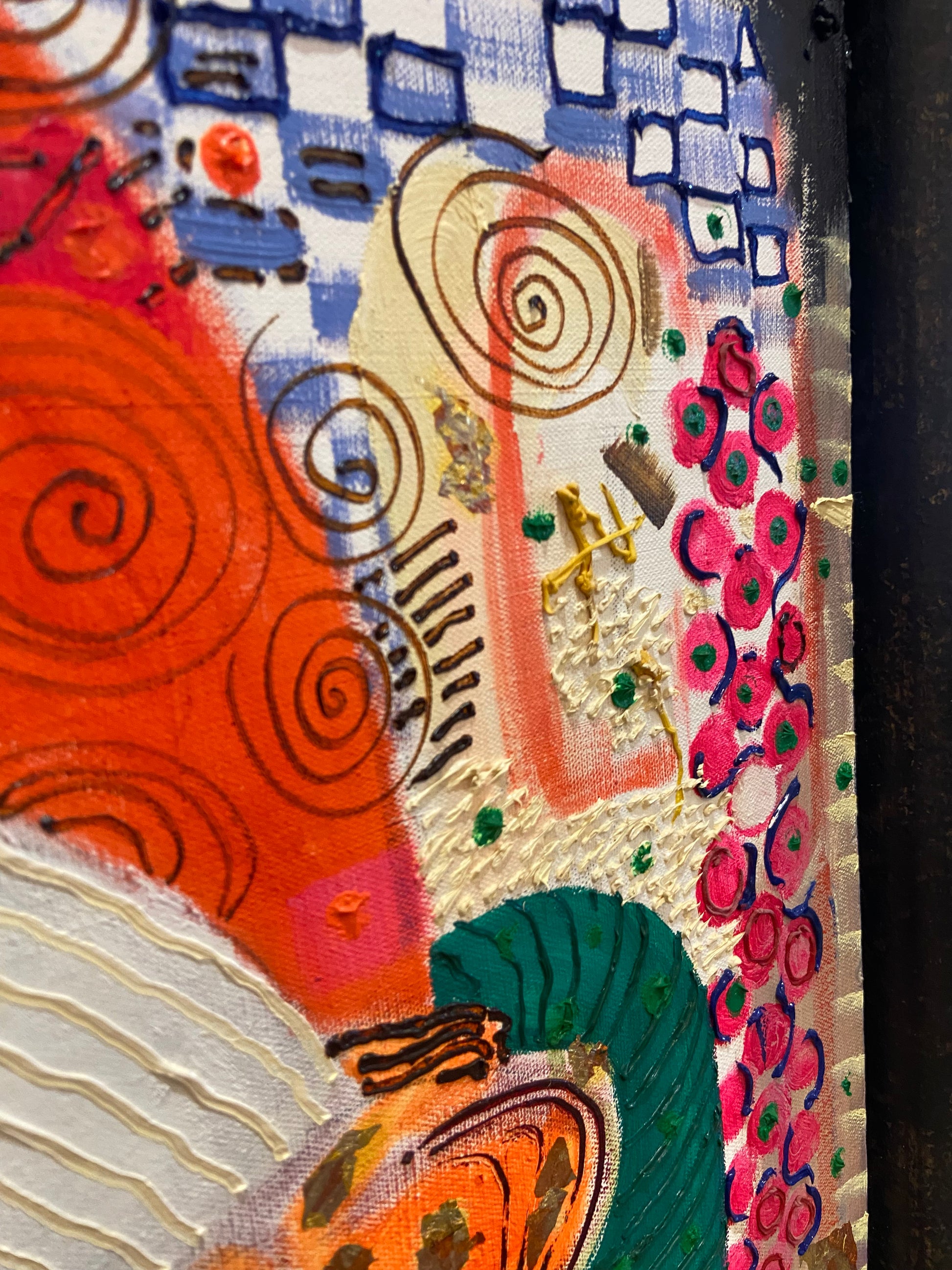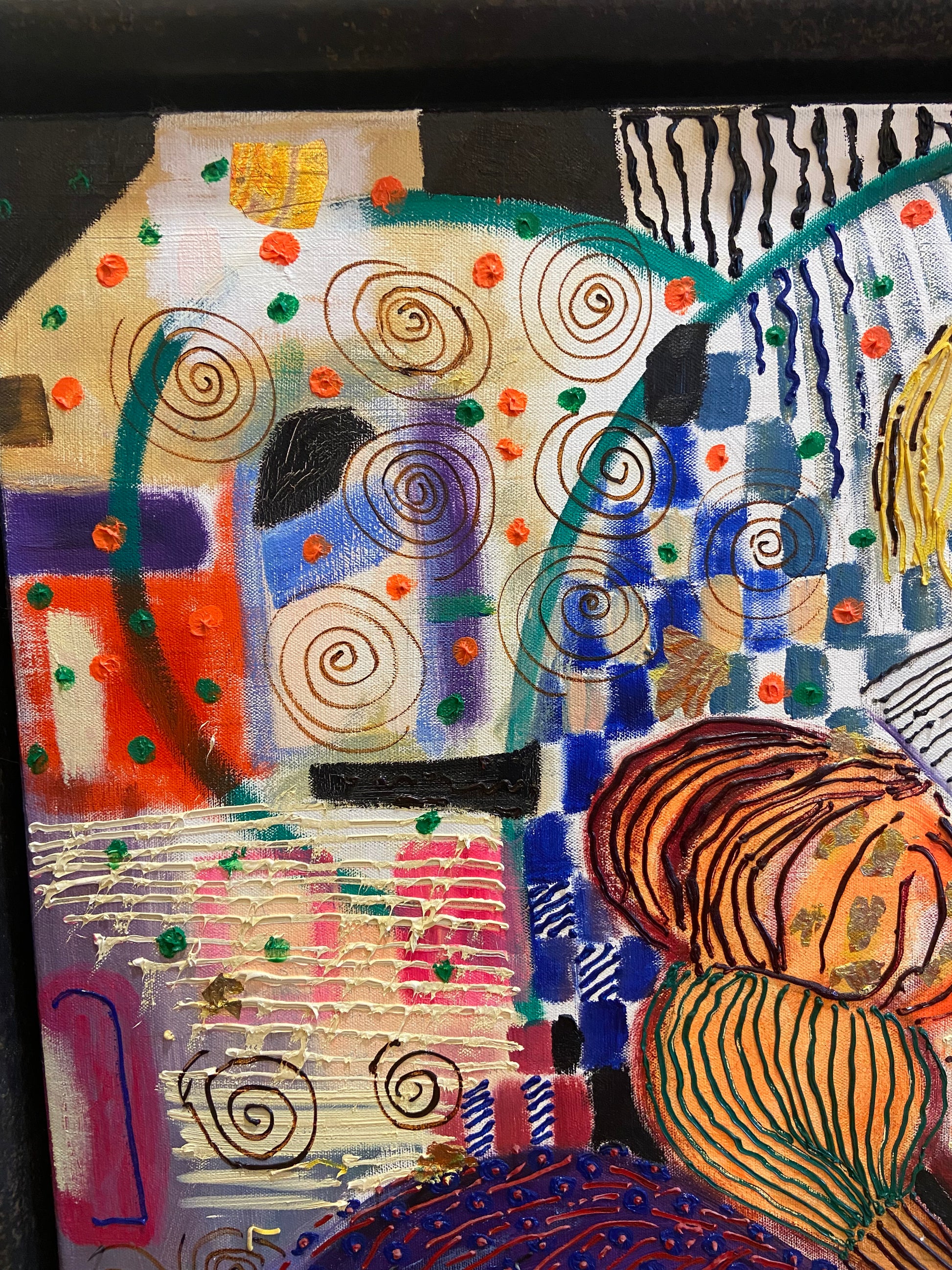 Colorful oil on canvas painting titled "The Strawberry Princess" by artist Sherri Lee Butler. Features a girl in a large dress with a gold foil crown eating a strawberry. Elevated paint details adorn the entirety of the piece giving it a rich, textured appearance. Colors include red, purple, pink, and yellow tones. The painting has a playful, eclectic appearance and is held in a black metal frame which allows its color to shine through. An informational card is present on the back of the frame.