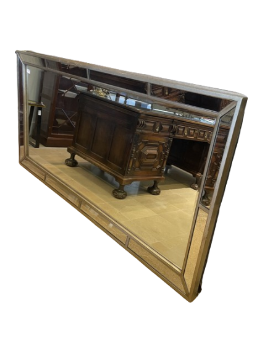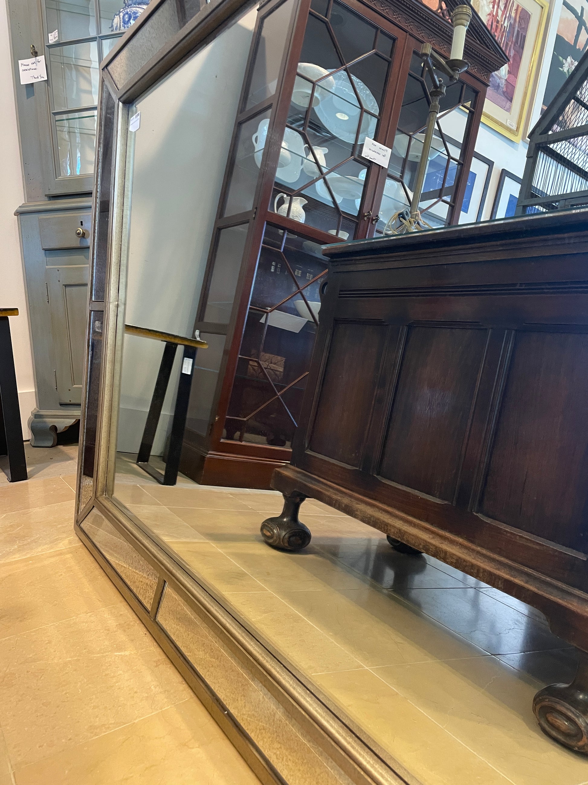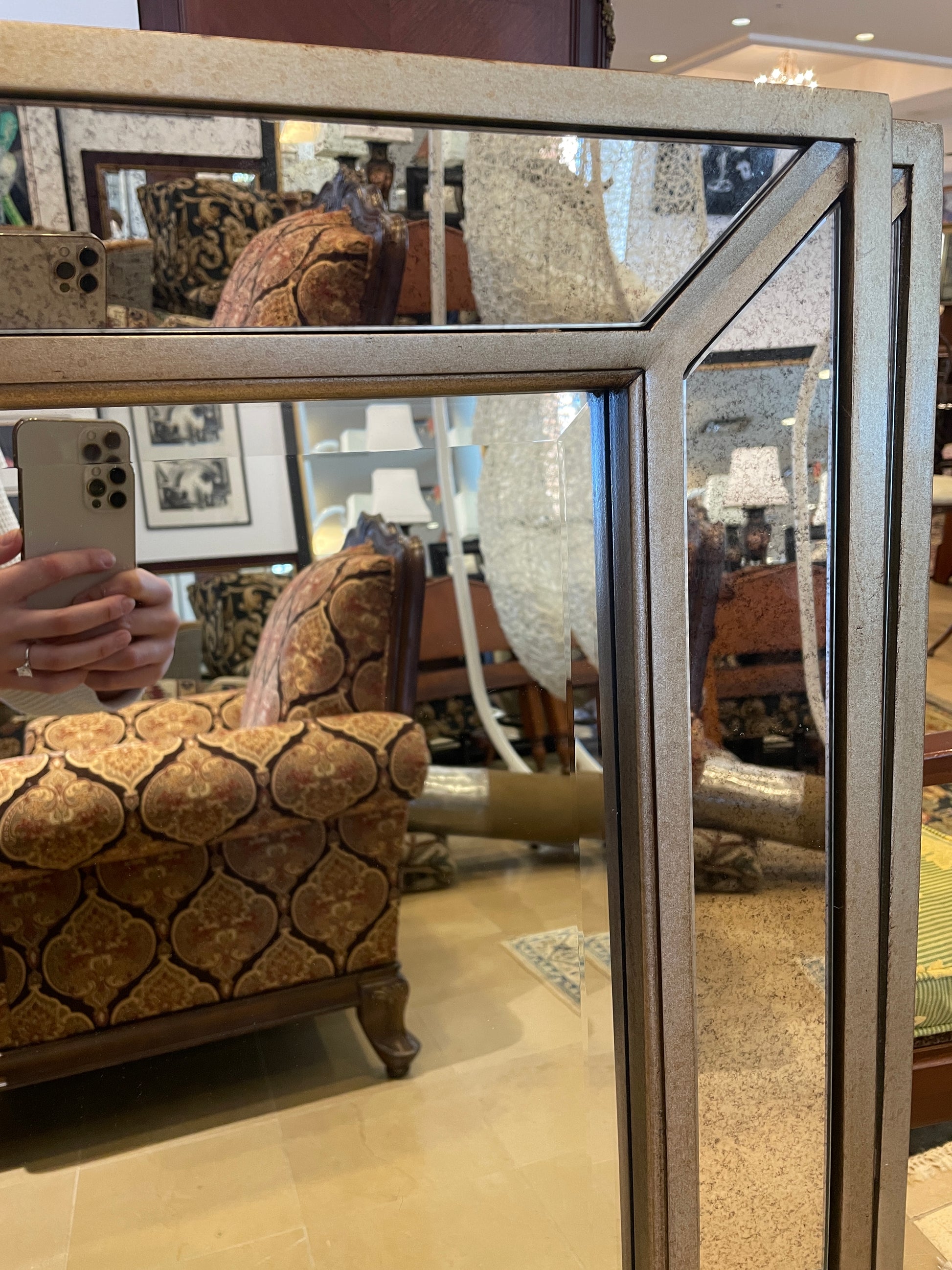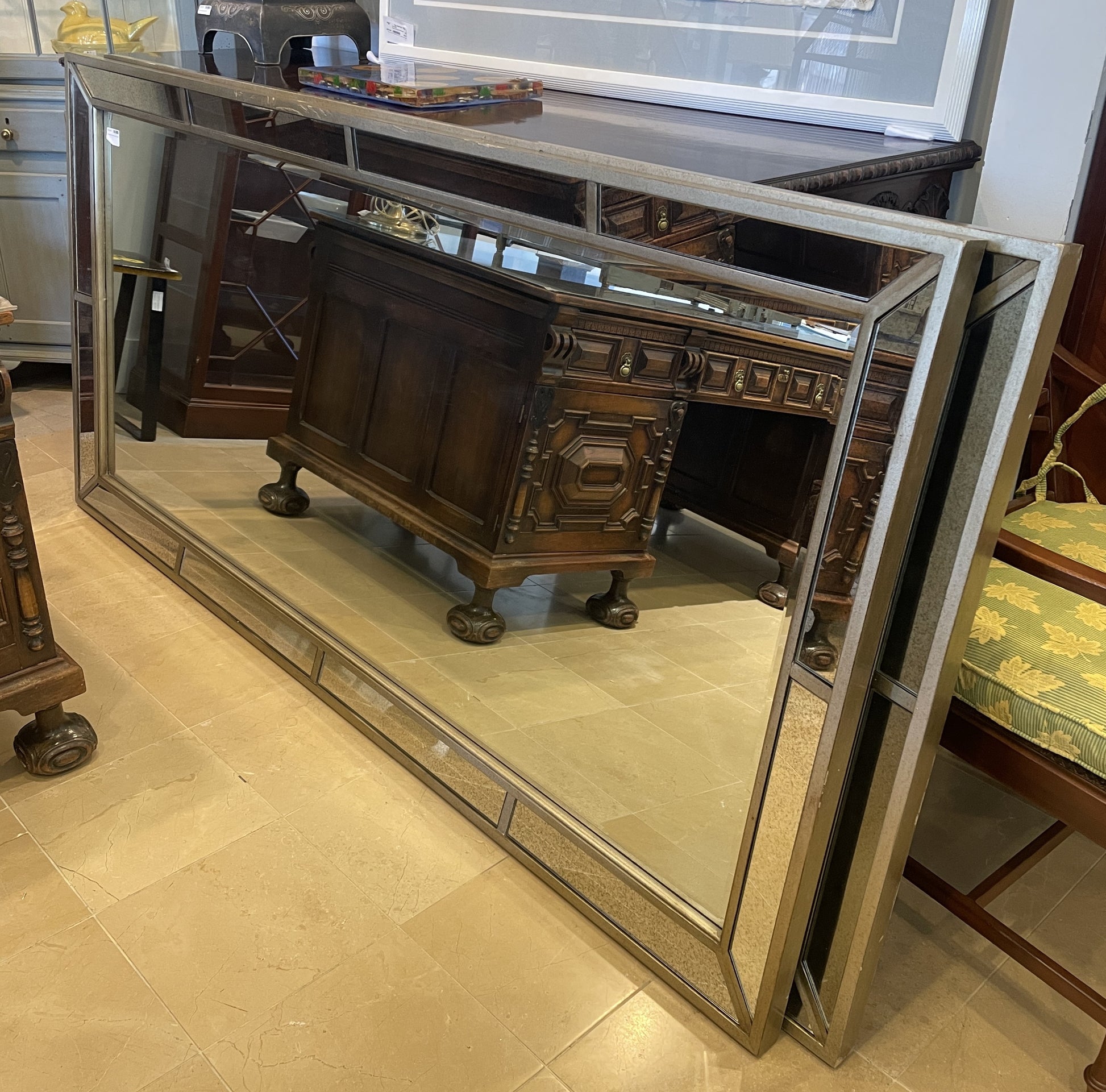 Full-length, rectangular mirror by the brand Shingmark, featuring beveled glass framed by antiqued mirrors outlined with silver-finished wood trim. Meant to rest vertically on a wall (currently positioned horizontally due to limited space). Two mirrors are available and are in similar condition.