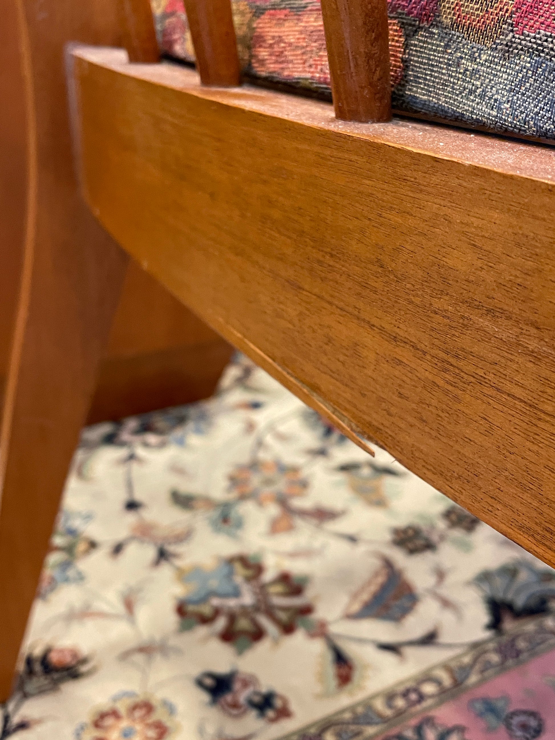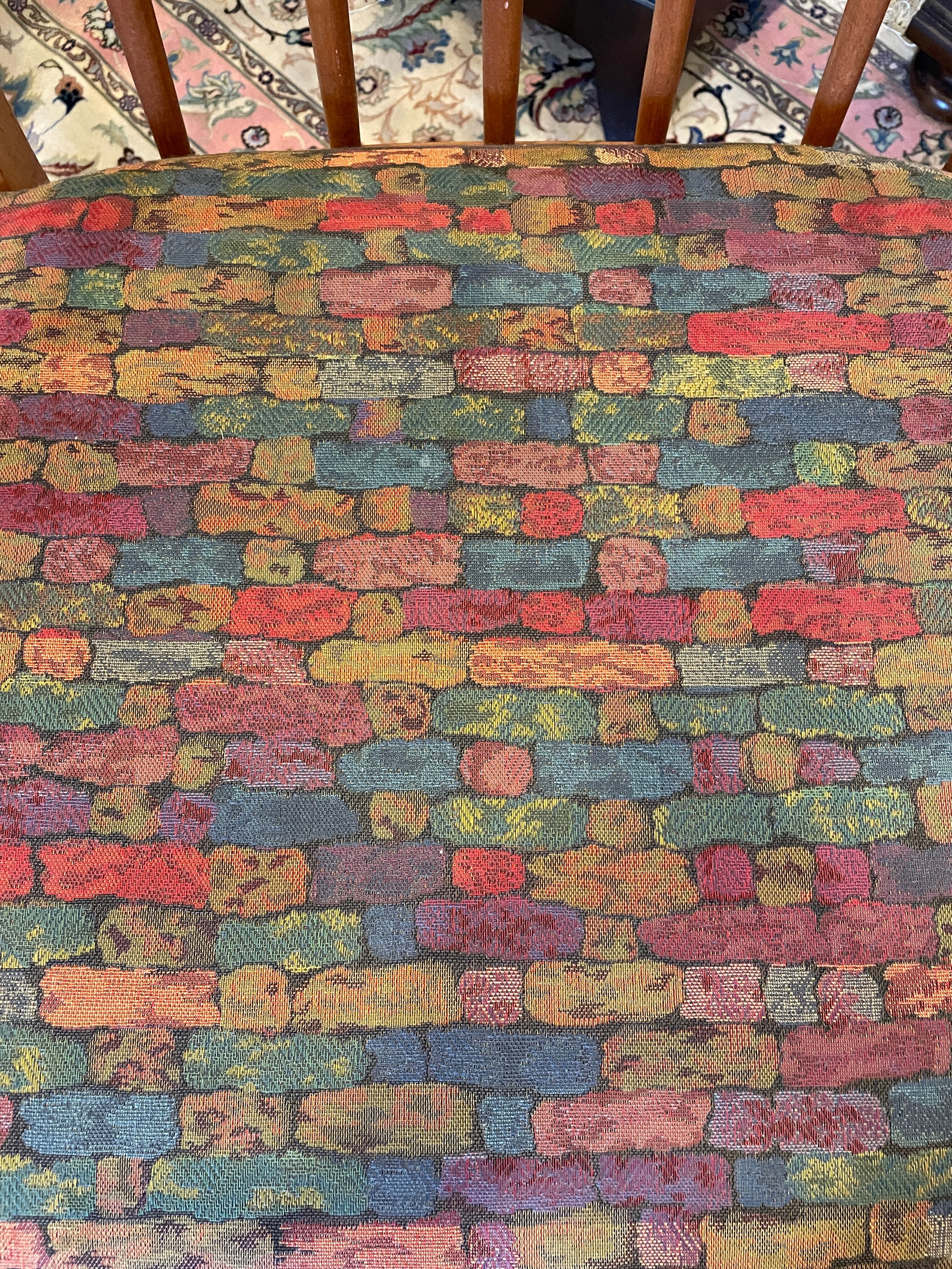 Sieling set of six dining chairs. These charming chairs sit upon a warm medium toned wooden frame with a banister back. The upholstered portion of each seat has a fun brick-like pattern in a rainbow of mellowed colors. Two of the chairs have angular arms with a channel carved into the top. The legs of the chairs are squared with a slight taper towards the foot. A playful and comfortable set of chairs that's sure to elevate any space with a mid-century modern flare.