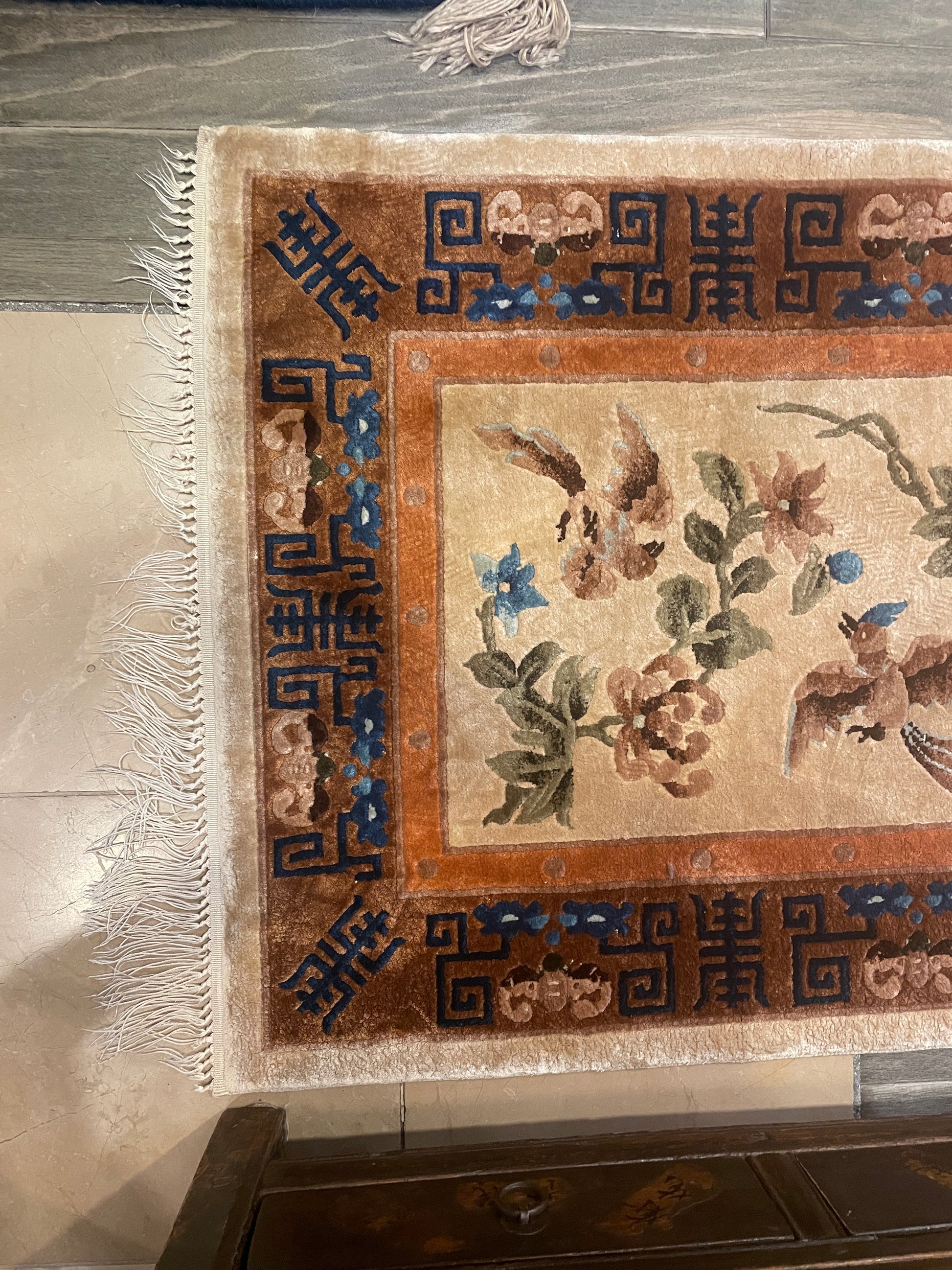 Beautiful Silk Chinese sculpted rug. This small rug features a beautiful botanical design in its center with a bird as the focal point. The outside border of the rug is accented with geometric designs and flowers. The colors of this rug are mainly neutral with beige and brown being the base, and accents of green and blue pop on the flowers and plants. The border of this rug is a cream color, and a matching fringe ornaments the short sides of the piece. This beautiful rug has a luxurious feel with its shiny silk and stunningly elegant design.