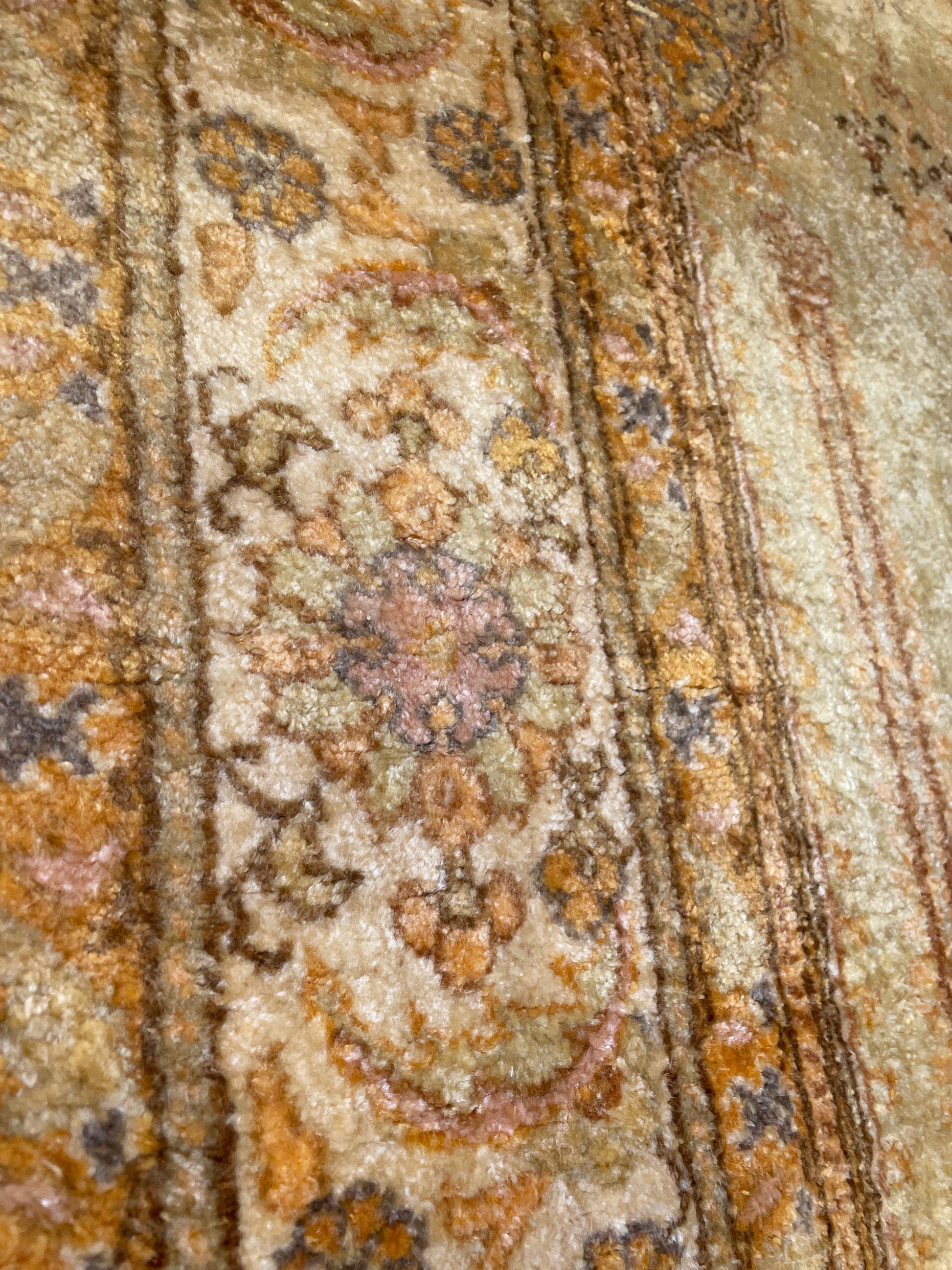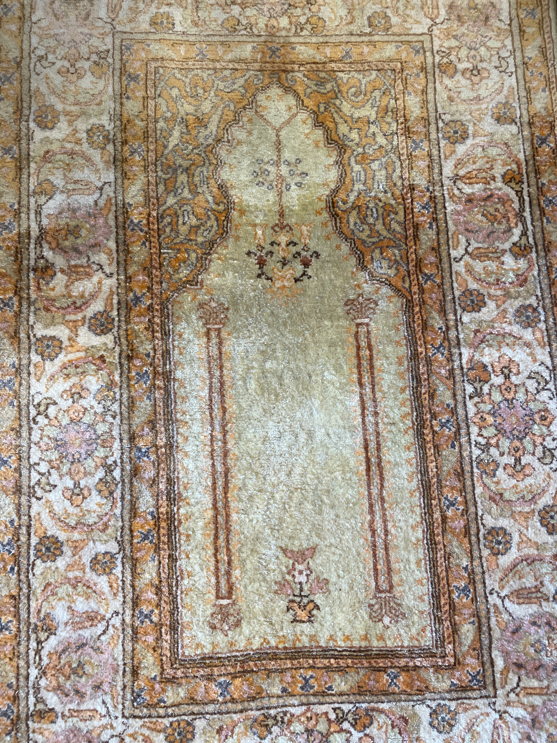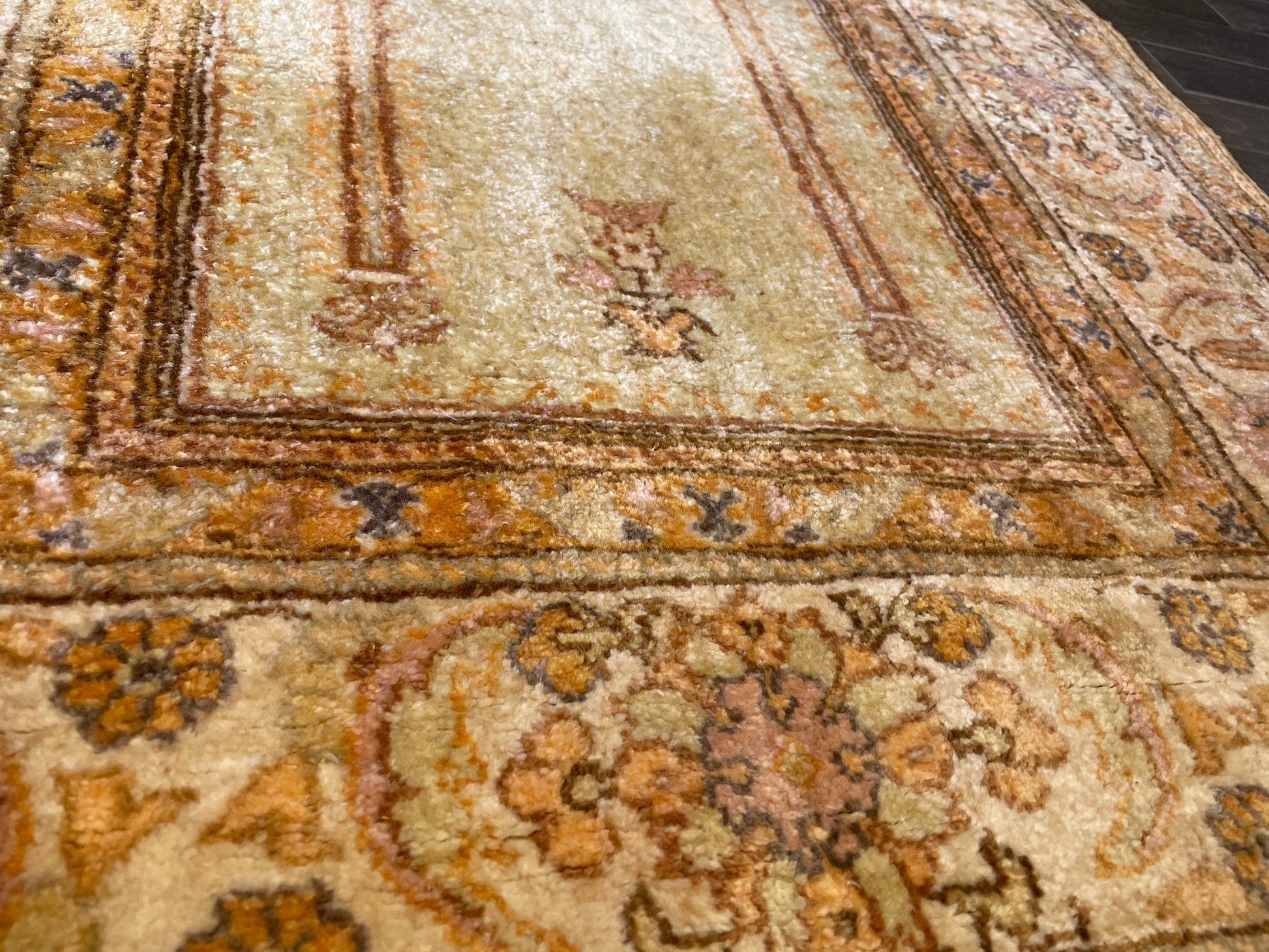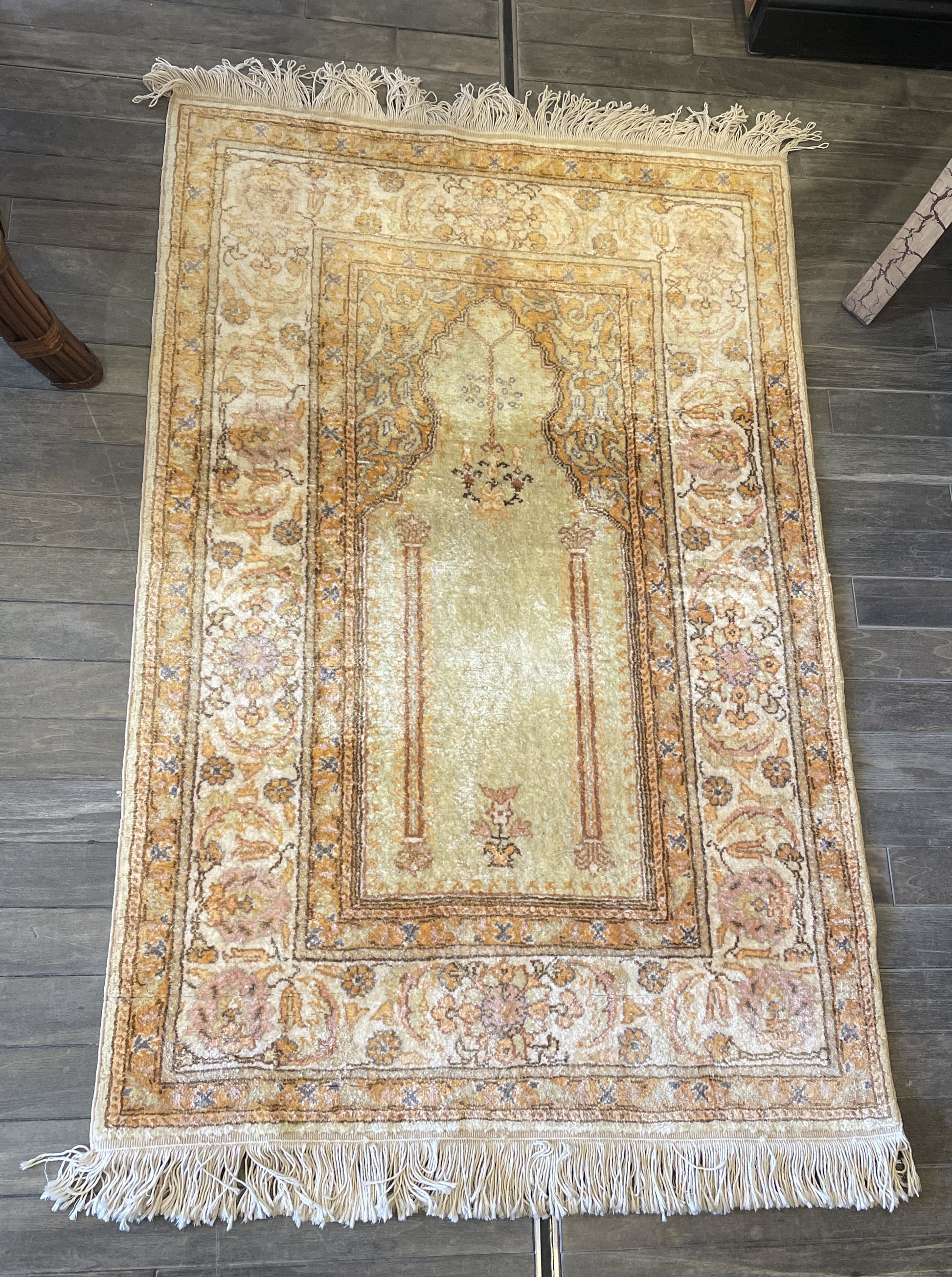 Silk hand knotted prayer rug. This beautiful prayer rug features a variety of floral and arabesque designs. The rug is mainly different shades of gold, with some tan and pops of blue as well. The shorter ends have white fringe. A beautiful and elegant prayer rug.