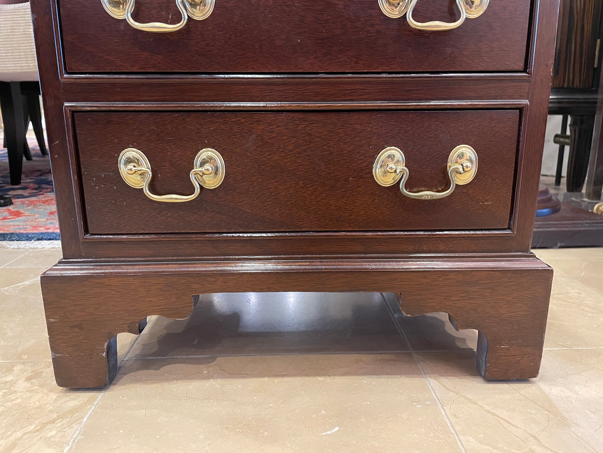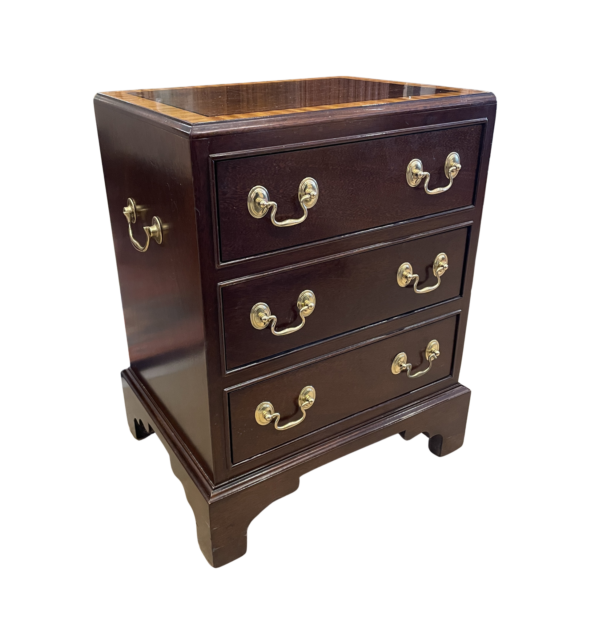 Elegant inlayed small three drawer chest. This beautiful petite piece features three drawers accented with brass handles. The dark mahogany wood surface contrasts with the light wood inlay that borders the top of this piece. The sides of this chest also have handles that match those on the front. The piece sits on a simply detailed base with squared feet. A beautiful traditional style piece that will elevate any space.