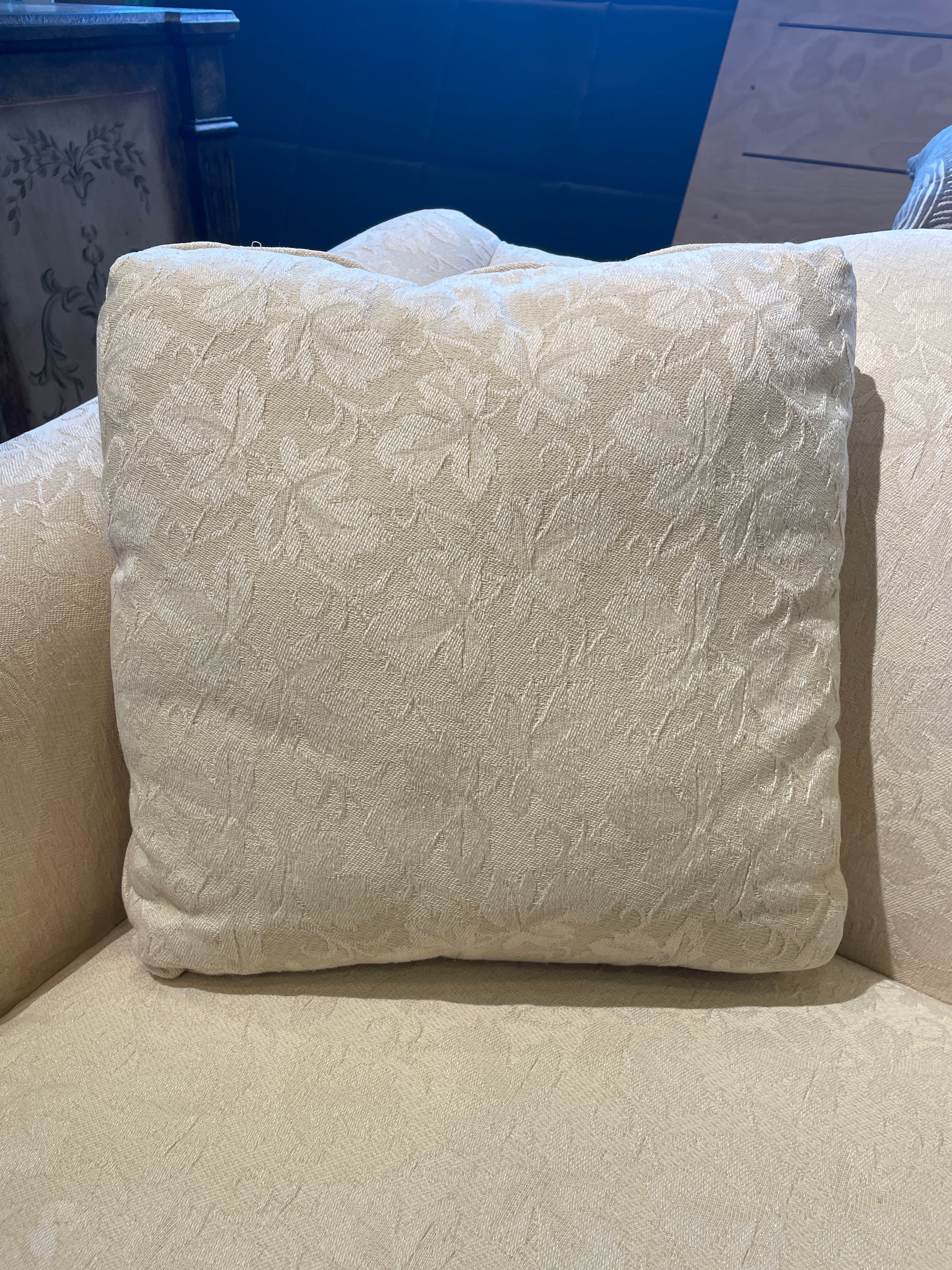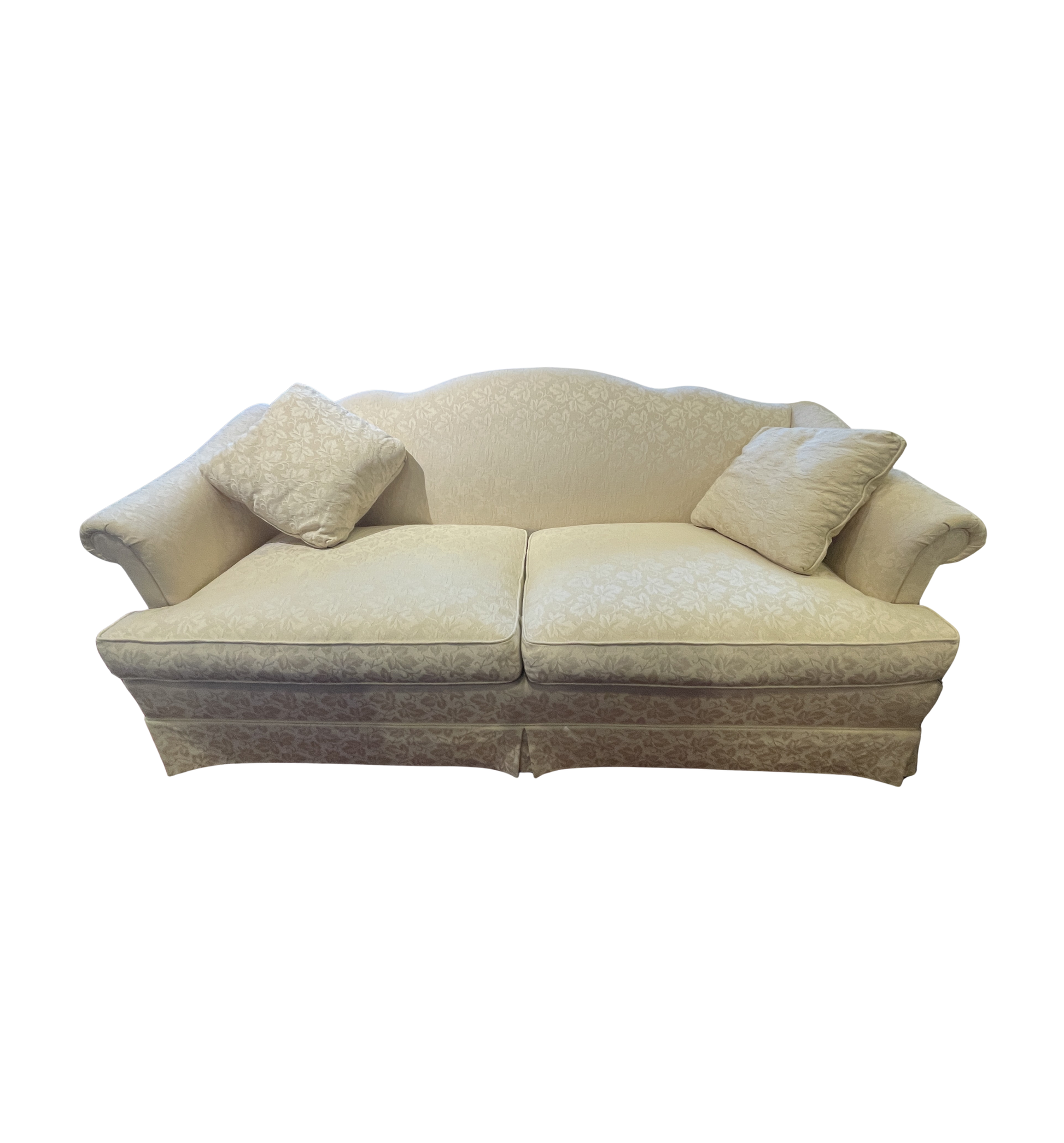 Sovereign by Hickory Chair Co. damask camel back sofa. This elegant sofa in cream features beautiful damask details. The base of the sofa includes a camel style back, and panel style arms that slope downward slightly from back to front. The bottom of the sofa is covered with a matching fabric apron that reaches the floor. The two couch cushions include the same damask design along with the two small pillows. The damask pattern has a shiny appearance and features a repeating leaf motif accented with swirling details. A gorgeous piece that is sure to add a classic touch to any space.
