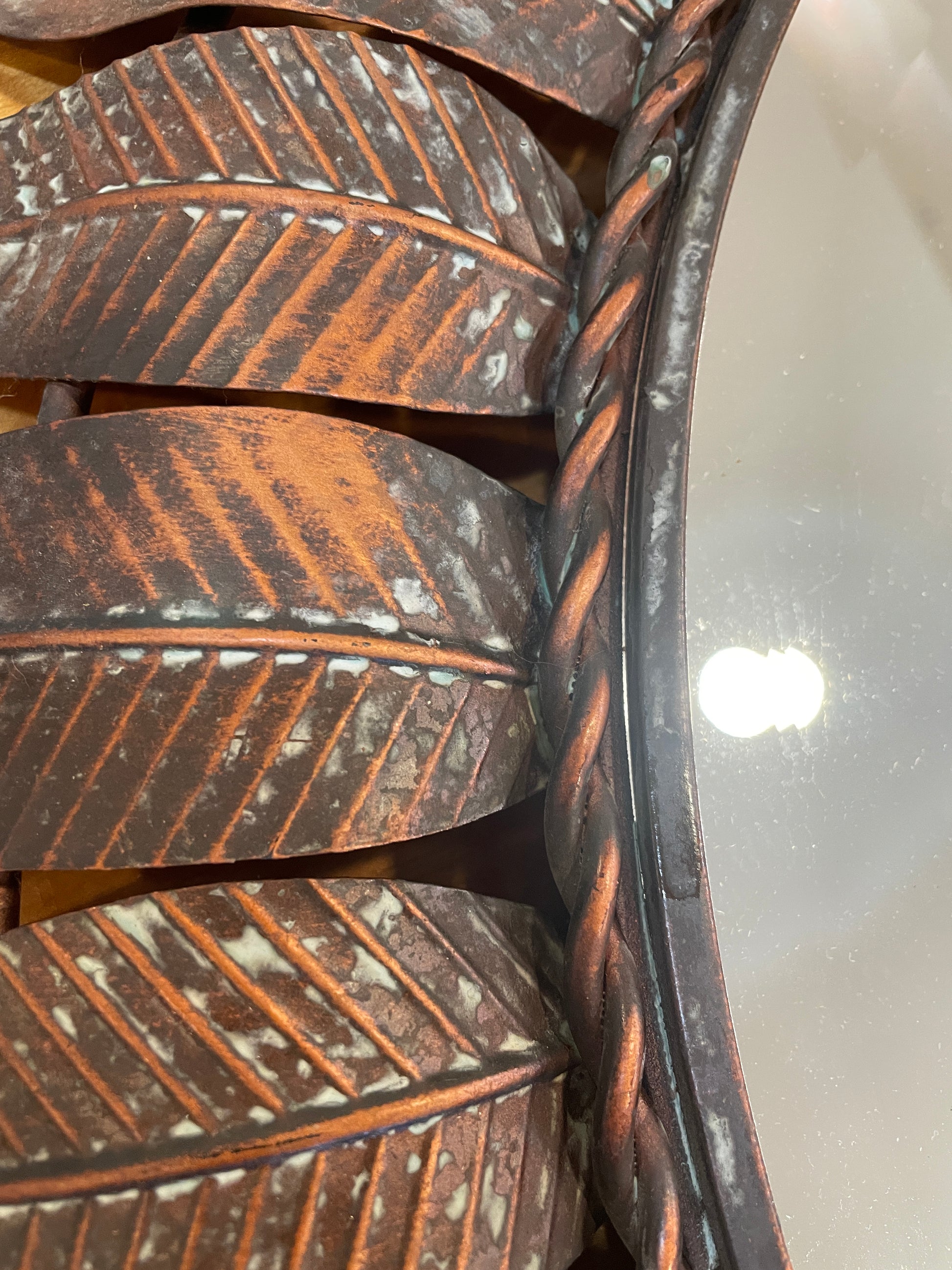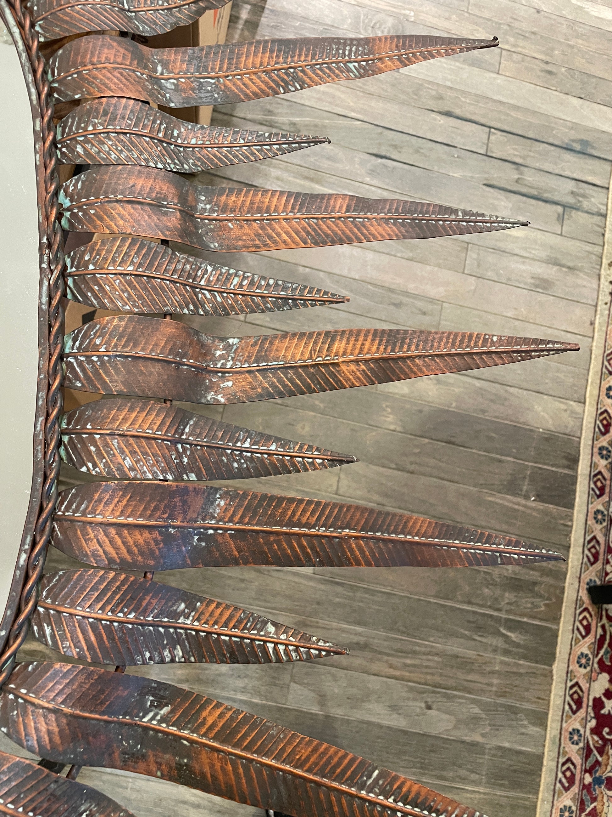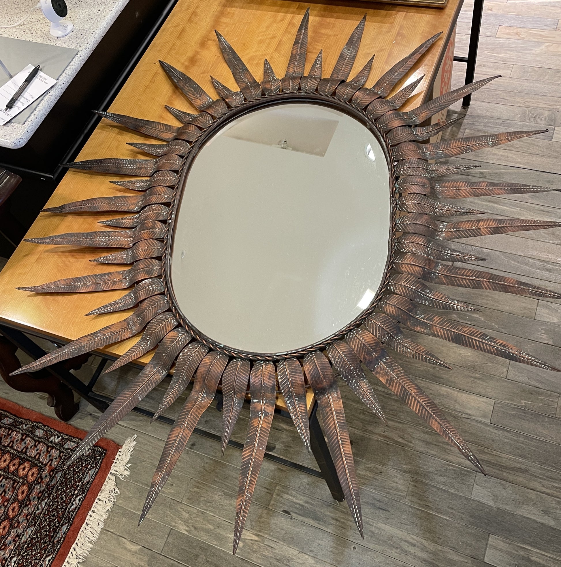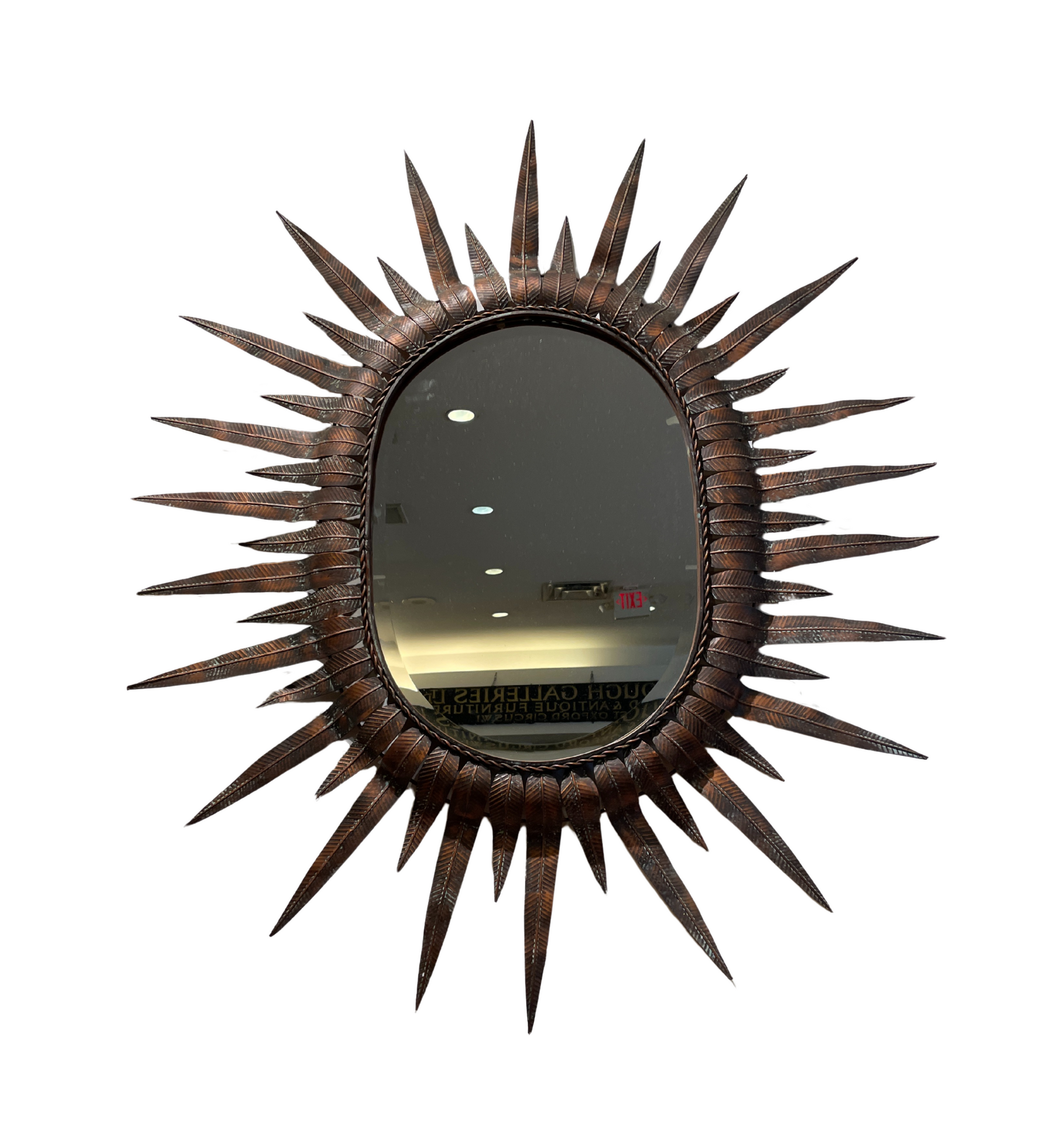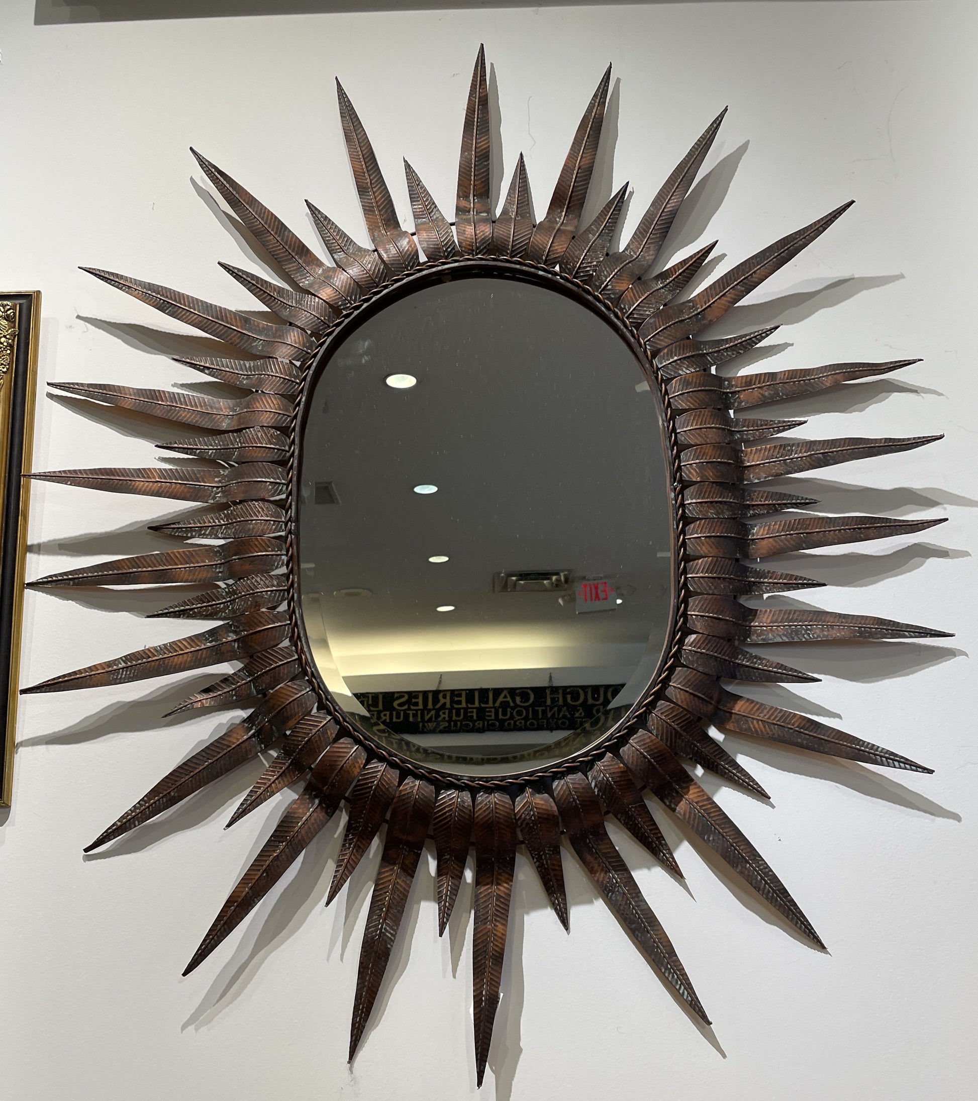 Spanish style oval sunburst mirror. This mirror features an eclectic frame with made of metal with a faux copper patina finish. The shape of the mirror is oval, and the frame is a sunburst shape that features leaf-like points of alternating lengths. The inner border of the frame is accented with a twisted design. This unique mirror is sure to make a statement in any space.