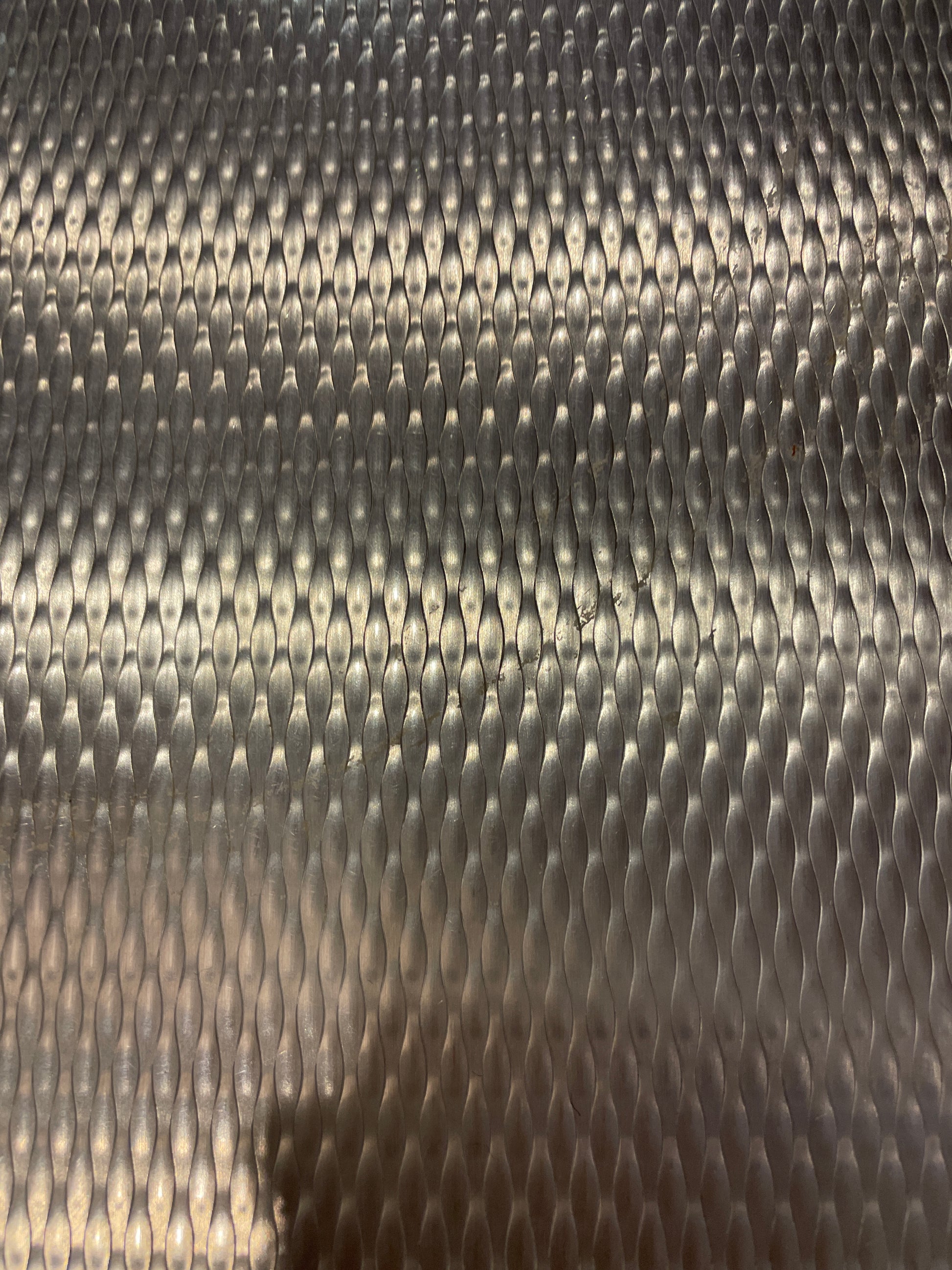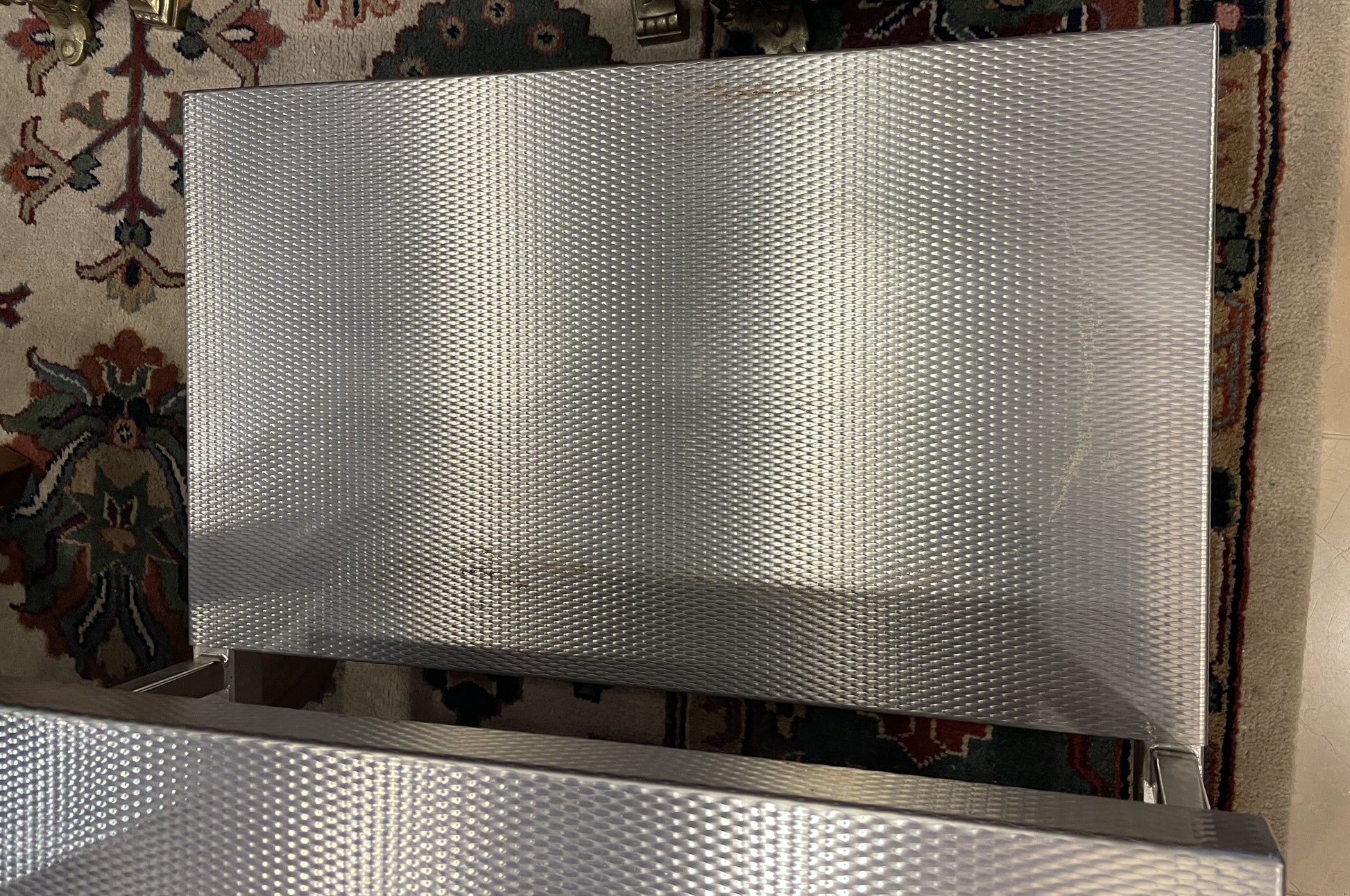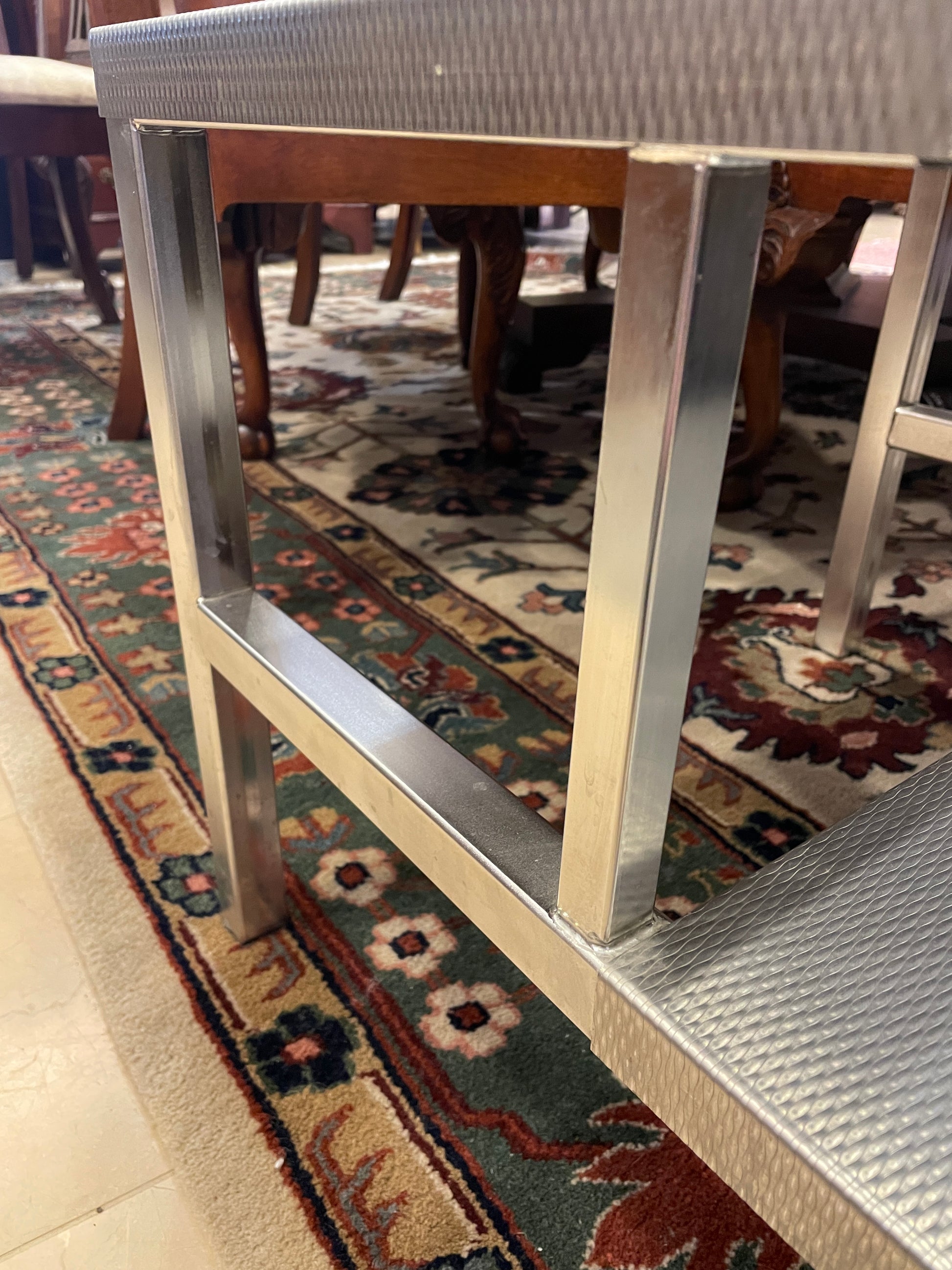 Unique stainless steel surgical double tier step stool. This sleek stool in shades of silver was originally designed for a surgical setting, but its industrial design is perfect for home decor too. This stool has never seen an operating room, rather its home was a modern kitchen, but with its versatile silver color and geometric design, this piece is sure to elevate a variety of settings. The textured stainless steel guarantees that this stool is sturdy and reliable. An uncommon find that is sure to add individualistic charm to any space.
