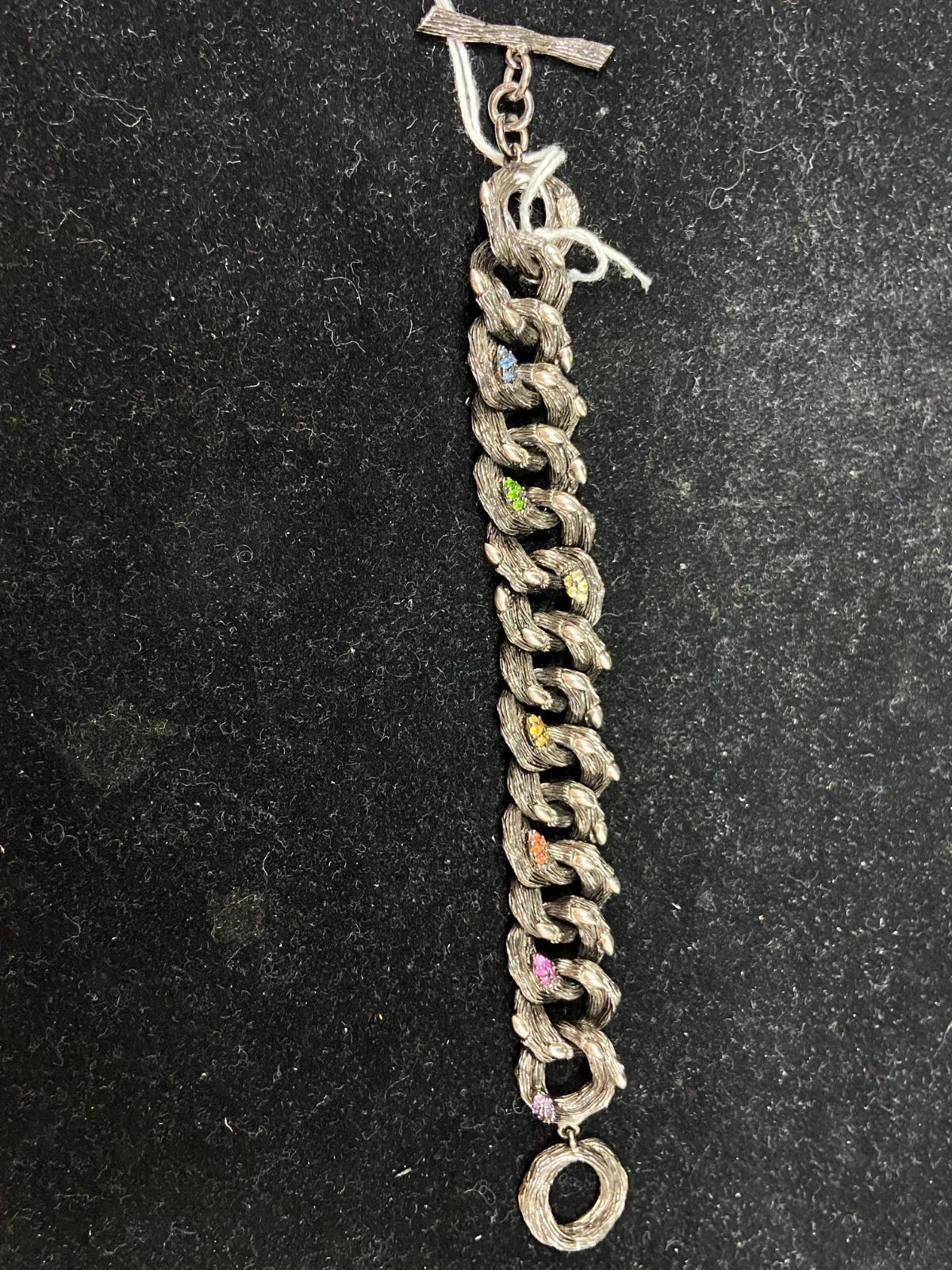 Silver bracelet made by Stephen Dueck Company. Cable chain features small gem flowers of various colors. Bracelet has a toggle clasp.