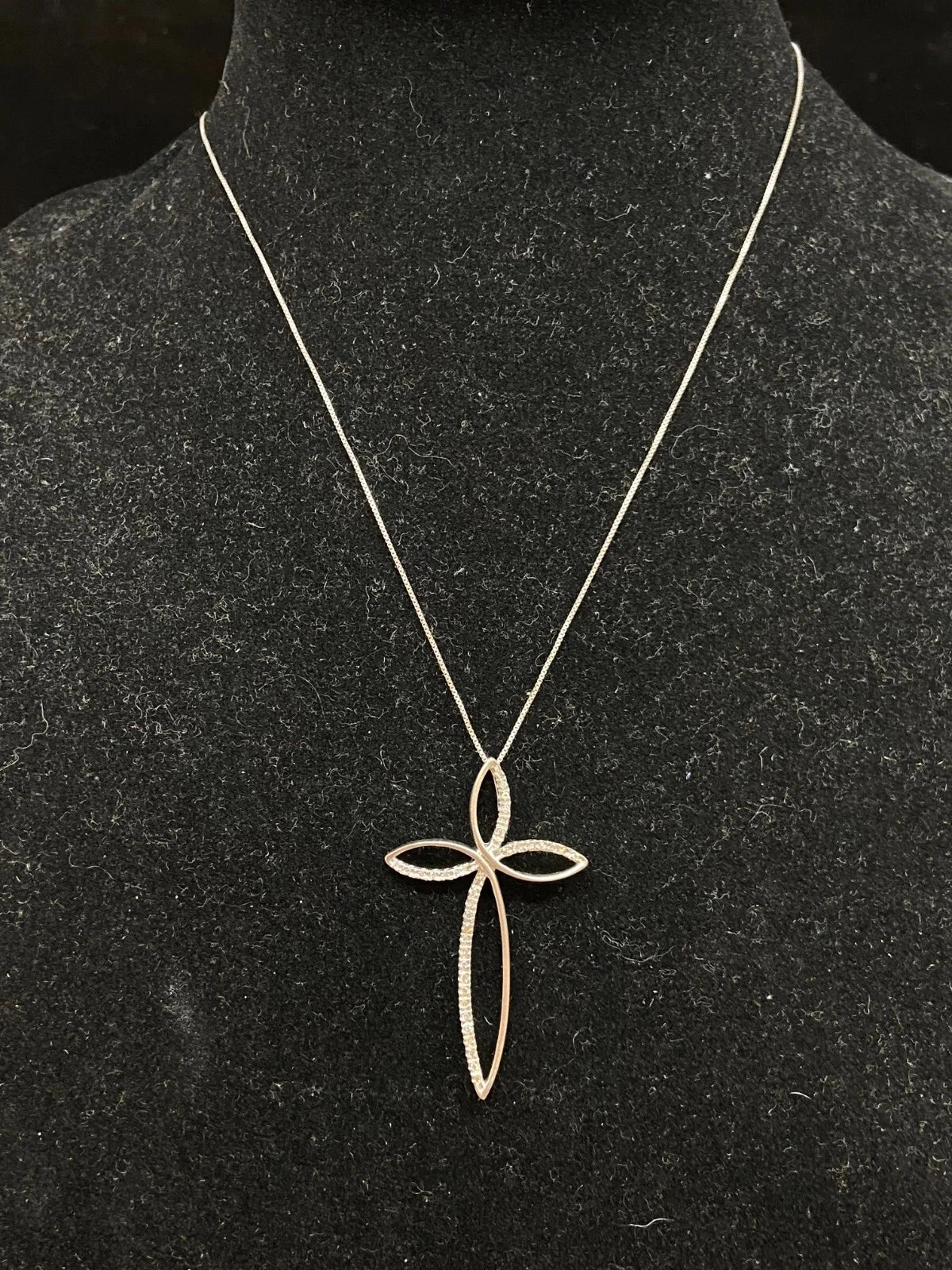 Necklace features a sterling silver cross pendant with a diamond in the middle. The cross is on a sterling silver chain.