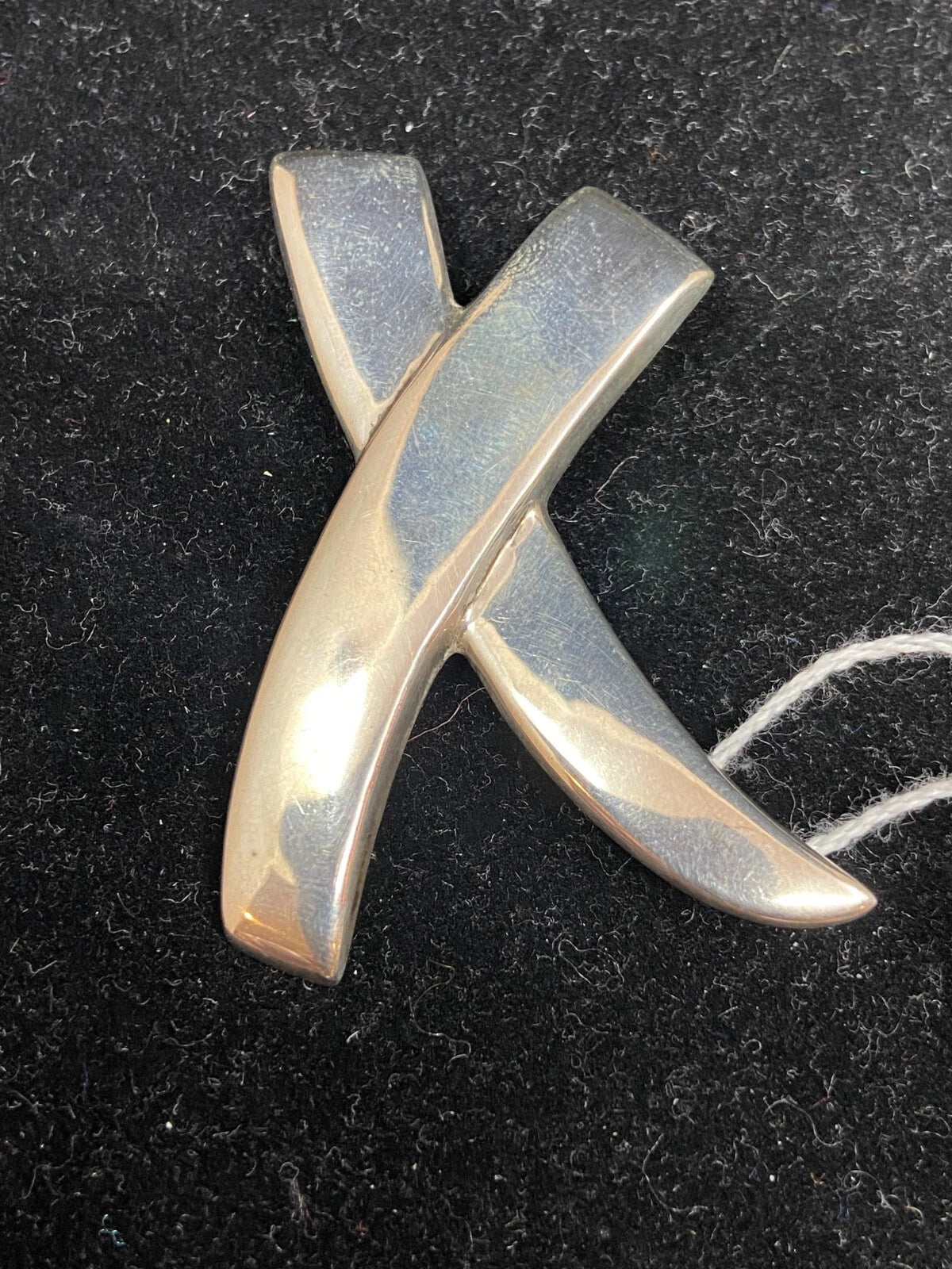 Sterling silver pin. Pin is an "X" shape. Silver is shiny.