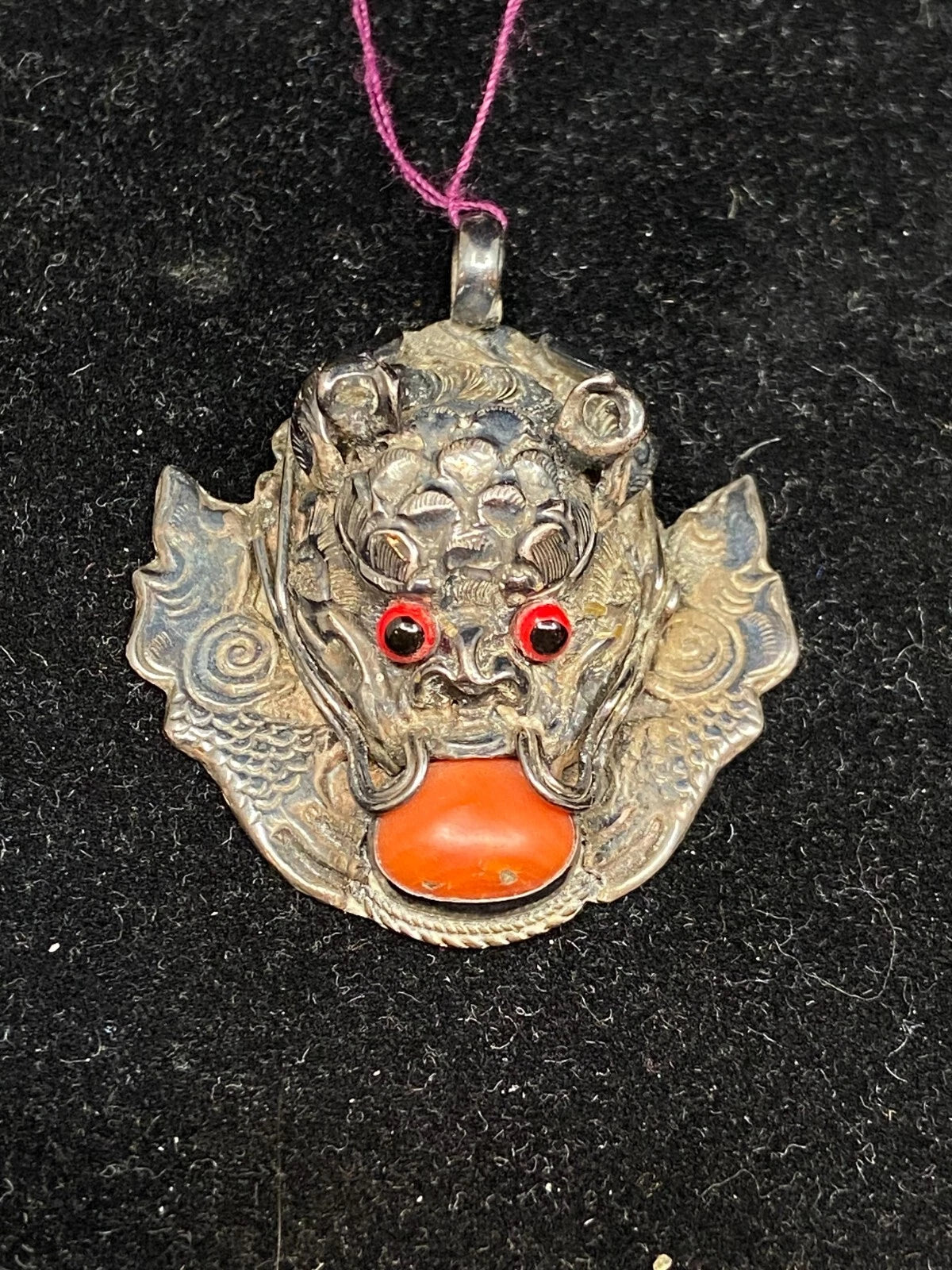 Pendant of a dragon head with red eyes. The dragon has a orange gem by its mouth and is made of sterling silver.