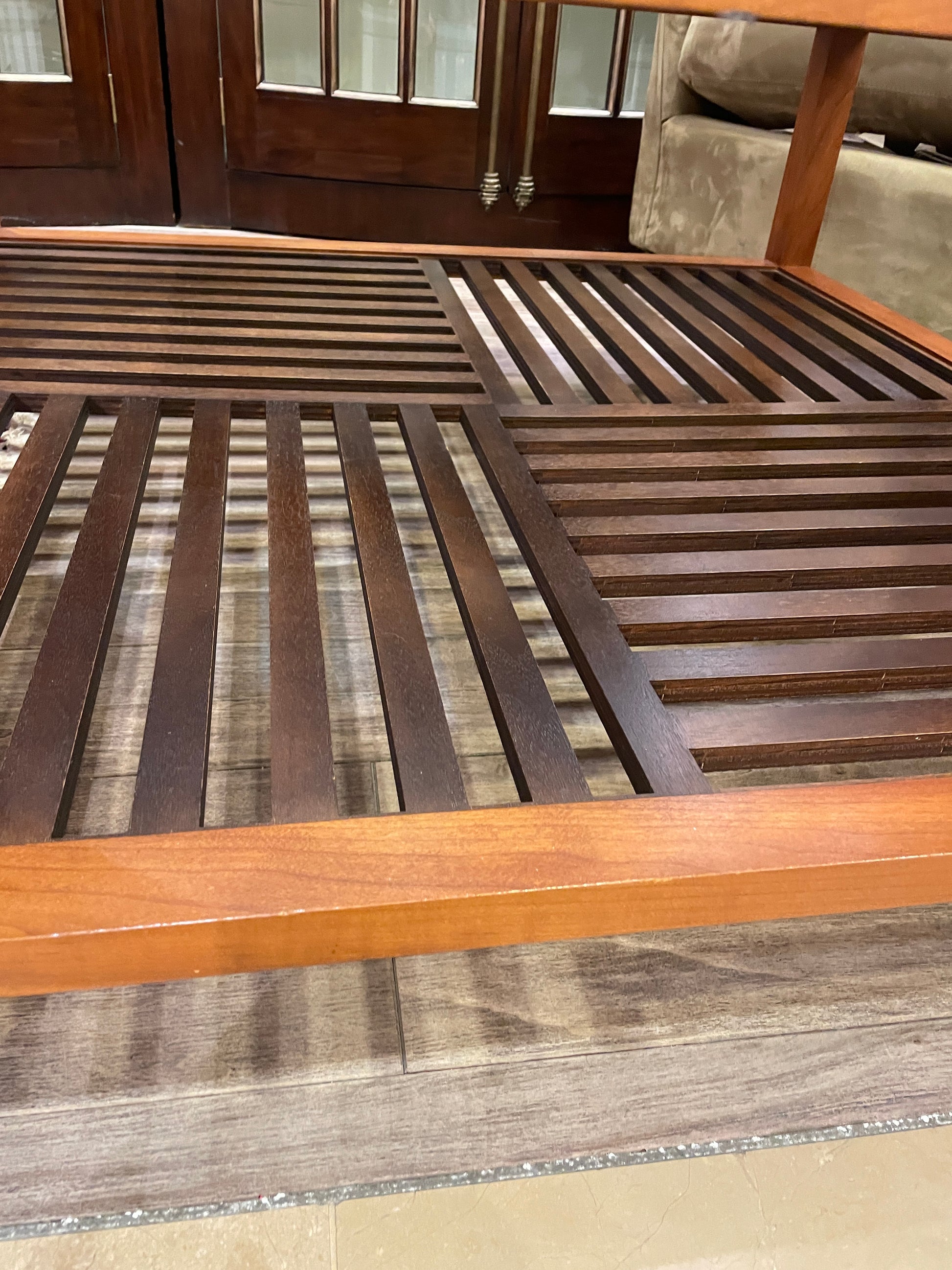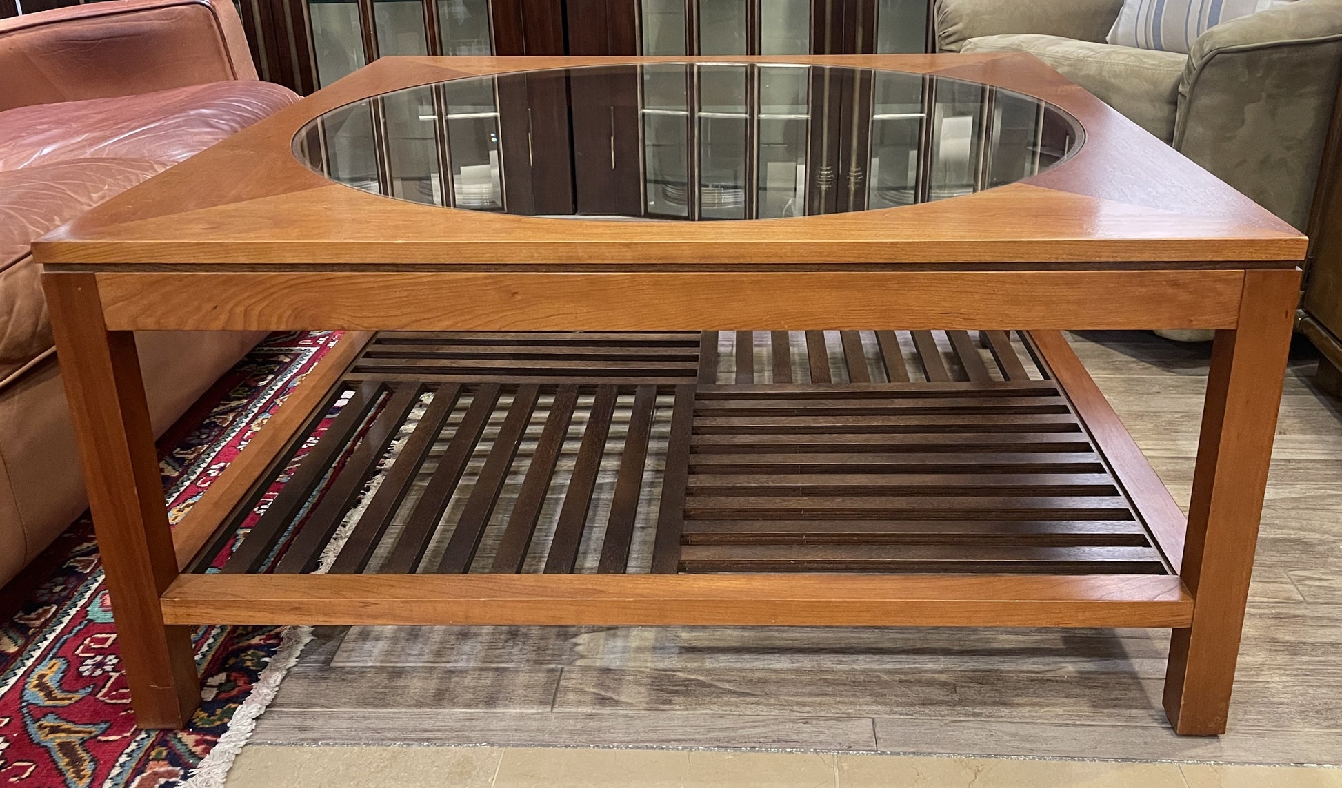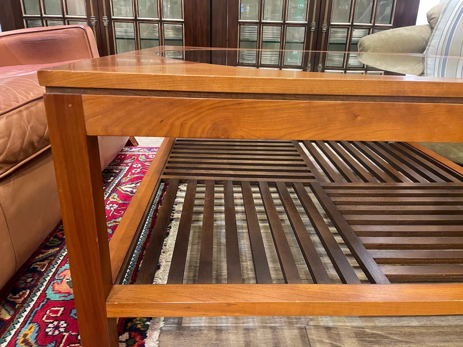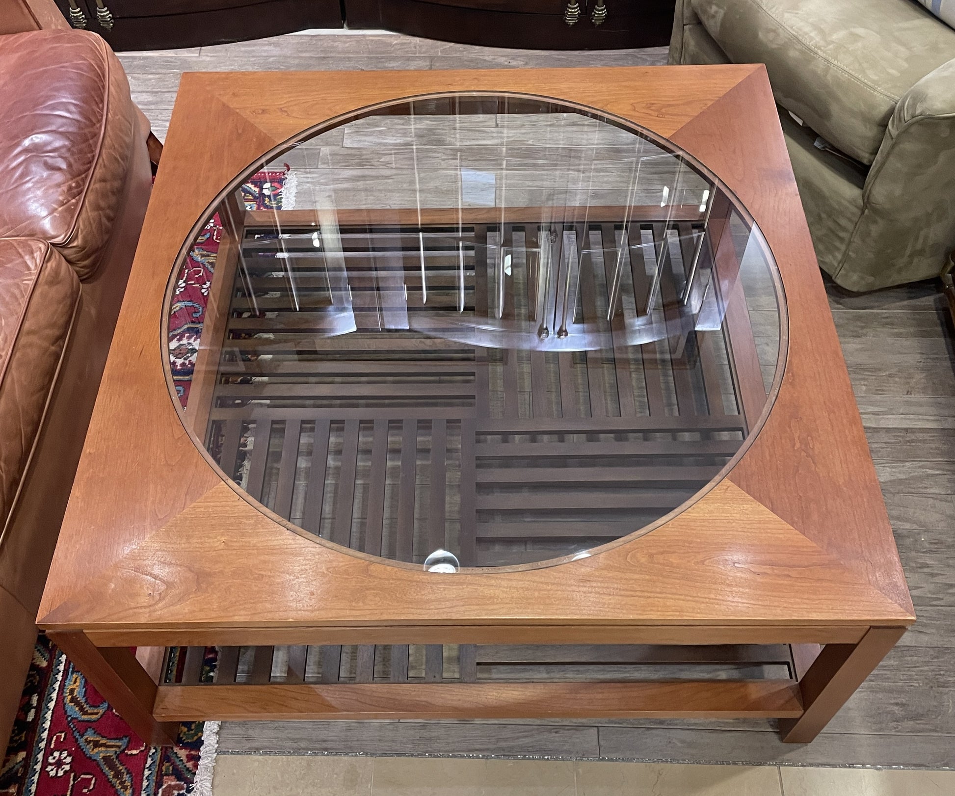 Stickley metropolitan coffee table. This beautiful cherry wood table features a unique circular glass inlay on the tabletop. The table frame is square in shape and has a slatted lower tier which contrasts the glass inlay beautifully. A stunning piece full of charm and transitional style.