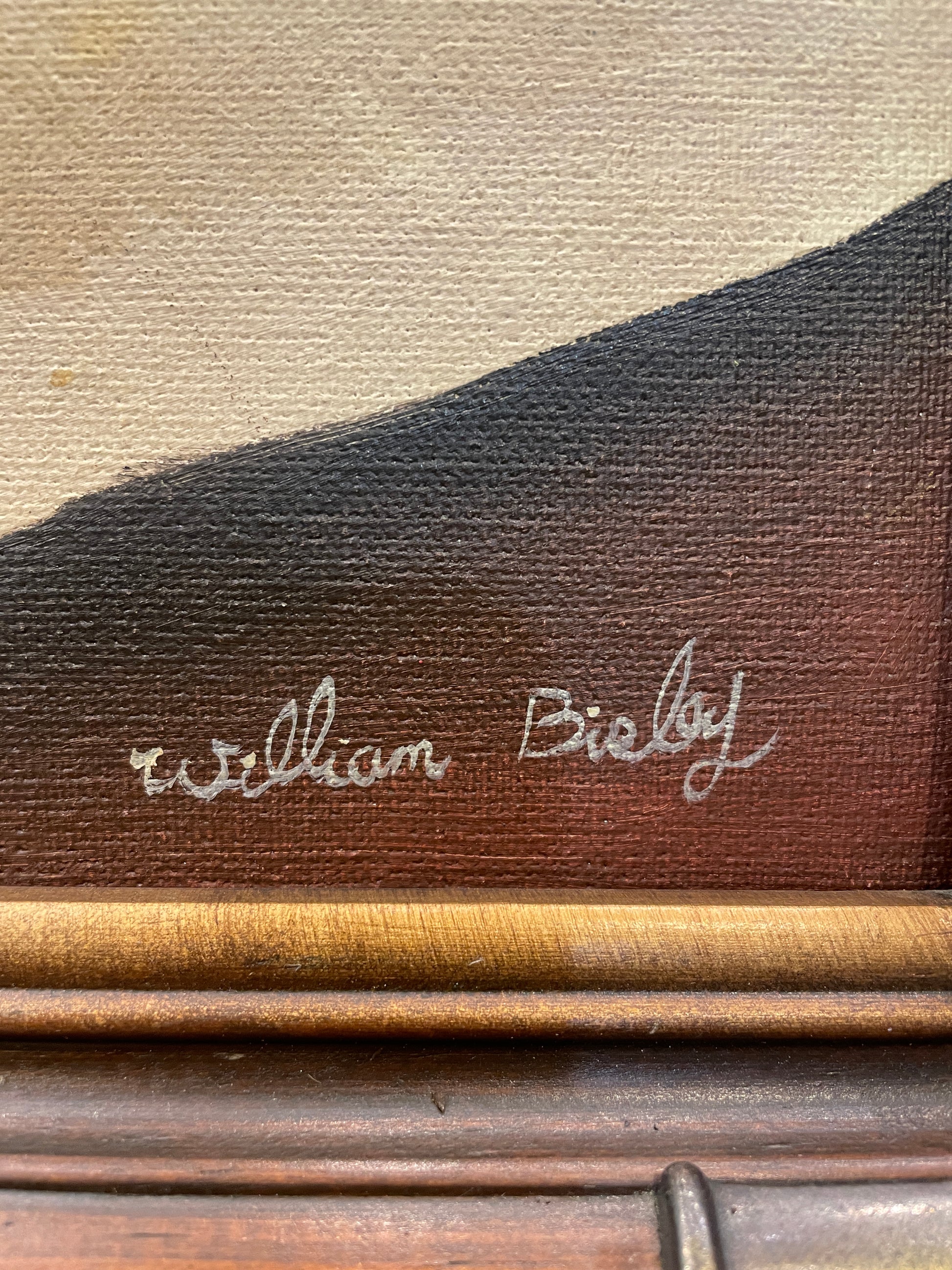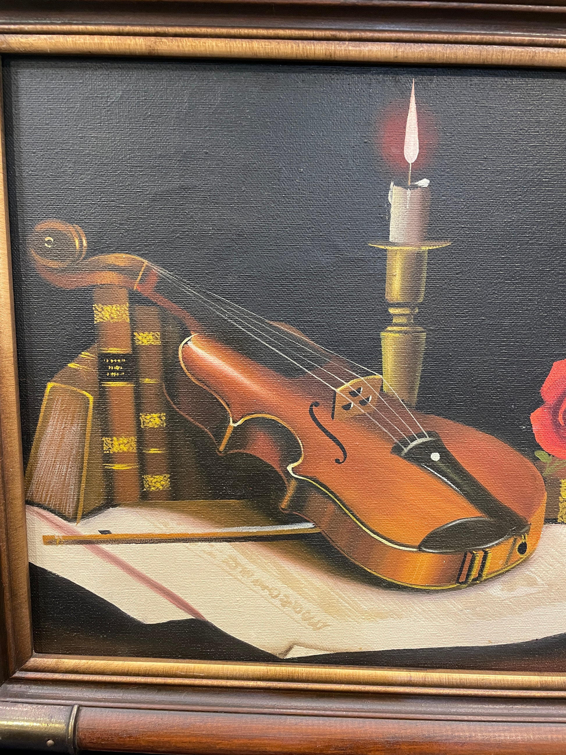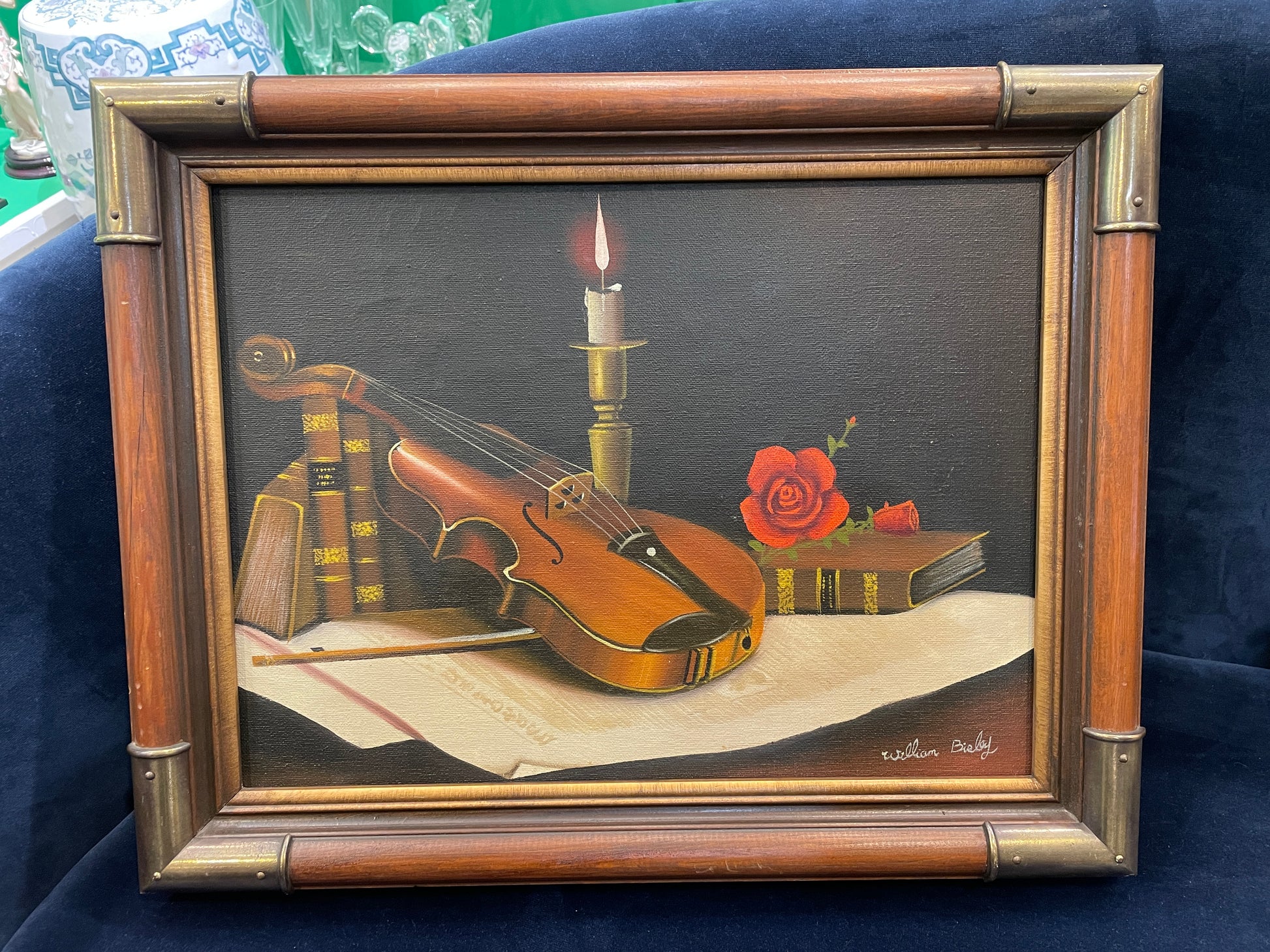 Still life on canvas of violin, signed William Bieley. Signed lower right. This beautiful oil on canvas painting depicts a violin sitting on a blanket of sheet music. The violin's neck is resting on a small stack of books. Behind the violin sits a single lit candle on a gold colored candlestick. To the right of the violin sits one more book that has a red rose resting atop it. The painting has a dark background that allows the items in the front to really pop with their vibrant warm toned colors. The piece is held in a wooden frame with brass corner caps. A beautiful still life that would be perfect for a violinist or other music lovers.