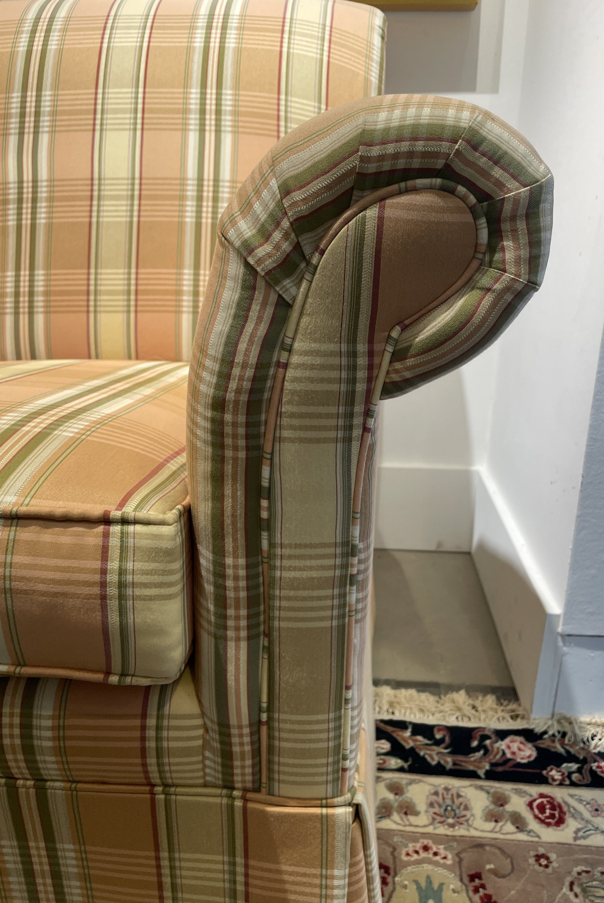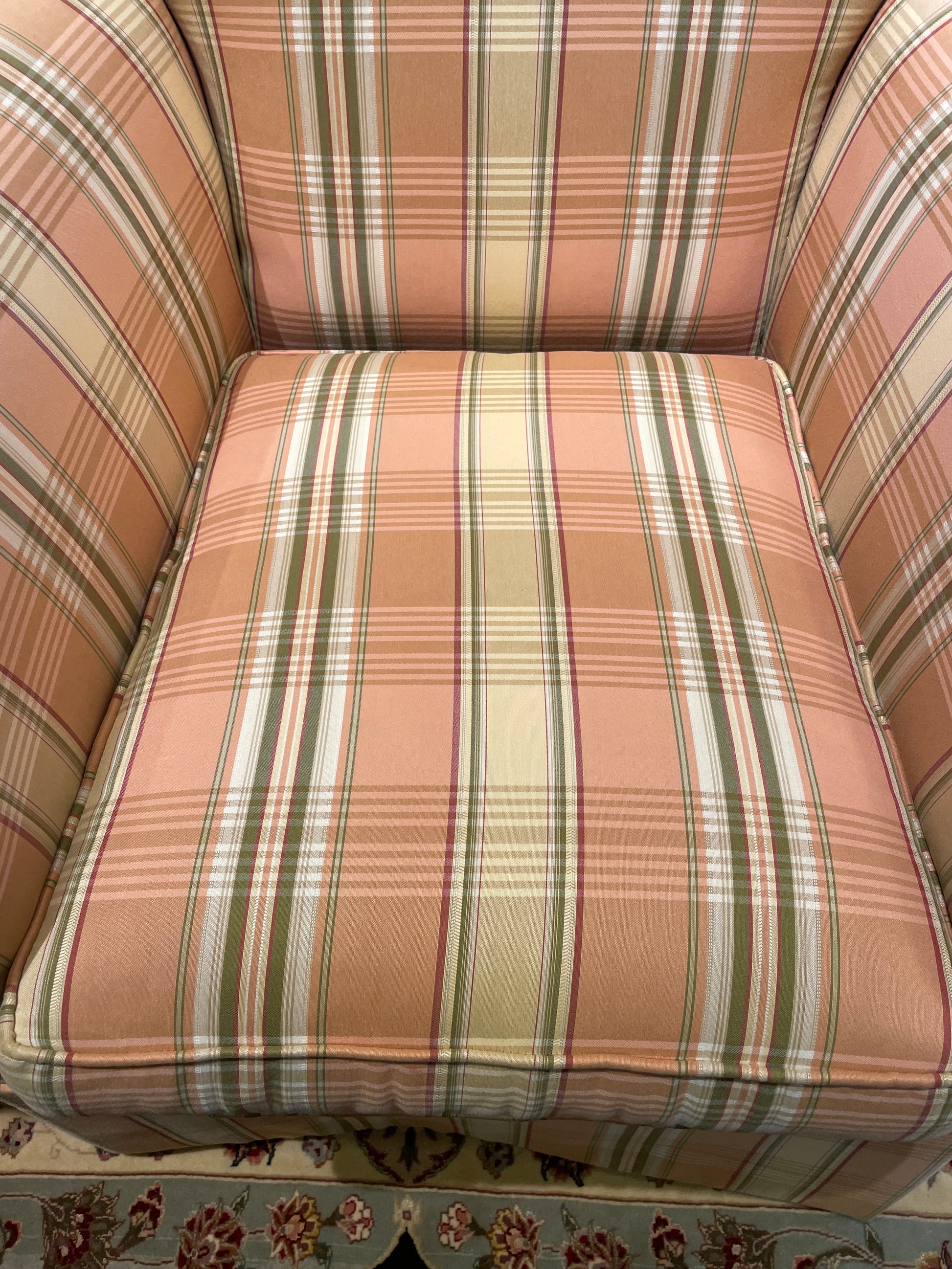 Ethan Allen striped chair. This charming chair features a classic design with pleated arms and a rolled back. The chair is upholstered with a playful plaid striped fabric in shades of pink, cream, and green. The chair sits on four dark-toned legs, which are obscured with an apron. An adorable, traditional style chair with colorful appeal perfect for a living room or den.