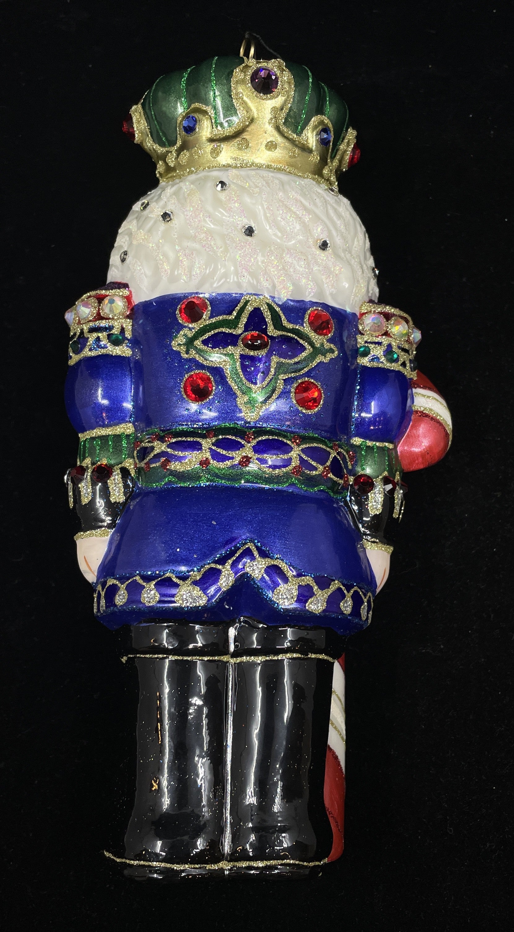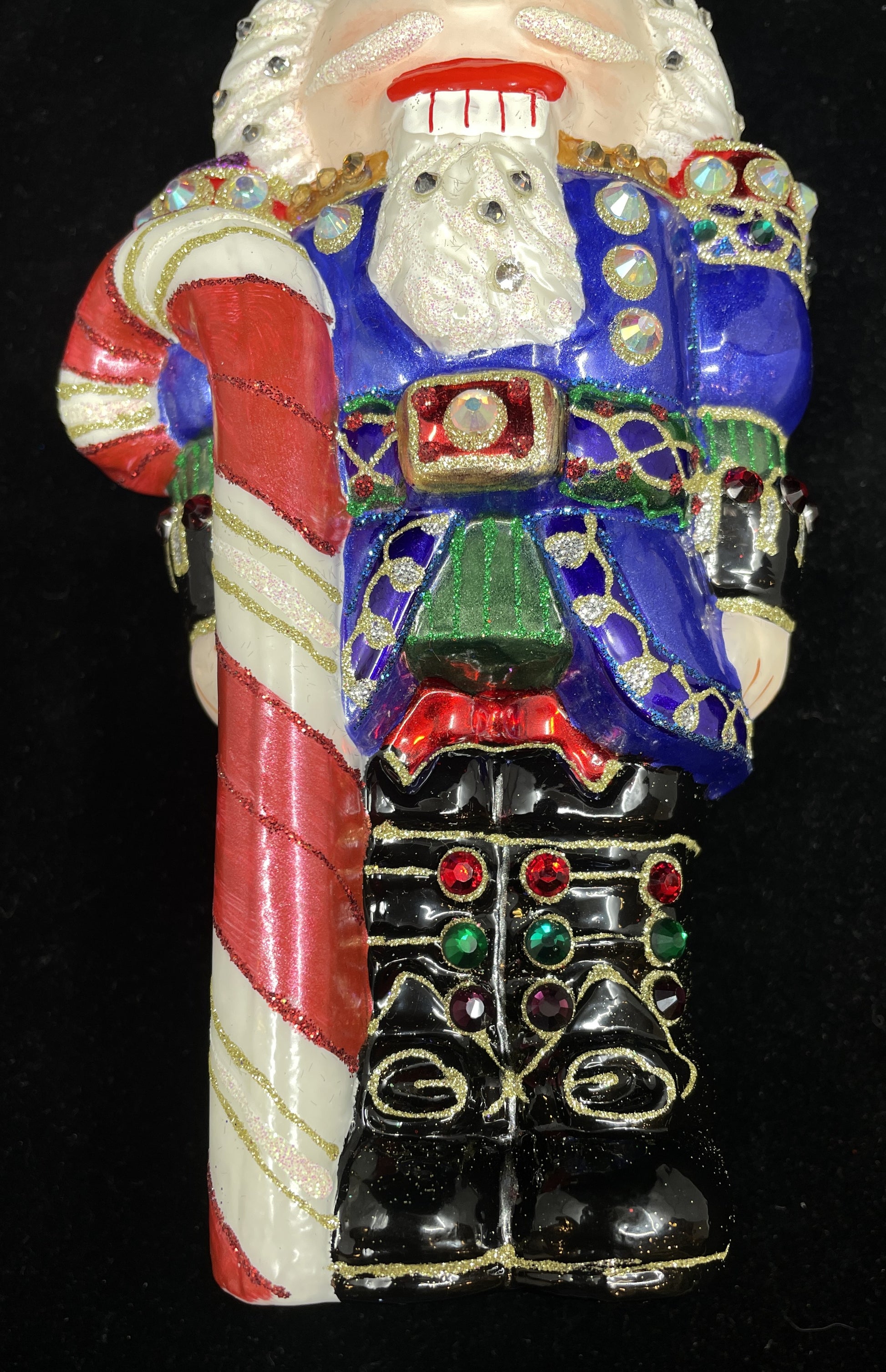 Jay Strongwater Nutcracker ornament. This beautiful hand-painted, hand-blown glass ornament depicts a nutcracker dressed in a cobalt blue jacket, green crown, and holding a candy cane. The nutcracker has white hair that is accented with matching glitter details for added texture. His blue jacket and black pants are adorned with glittering details and stunning Swarovski crystals. His green crown has a gold band and red ribbons that connect at the top. The candy cane is accented with swirling glittery details as well. This eye-catching ornament is sure to add classic festive charm to any tree.