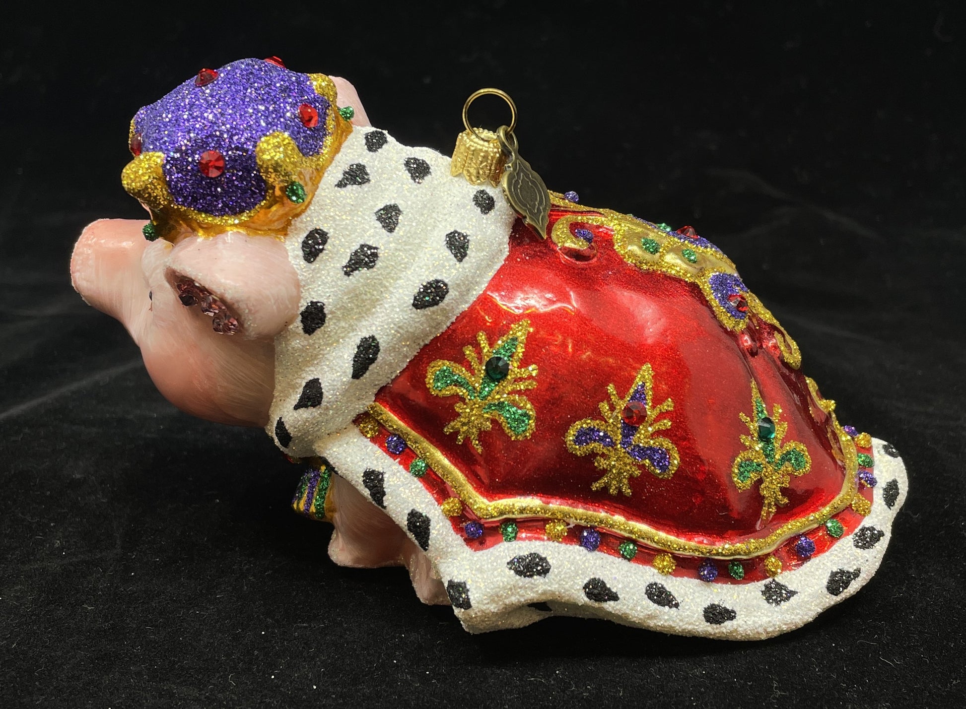 Jay Strongwater pig prince ornament. This beautiful hand-painted, hand-blown glass ornament is adorned with sparkling Swarovski crystals and shimmering glitter. The piece has a charming design of a pink pig wearing a crown and regal cape. His crown is gold with a purple cap adorned with green and red crystal accents. His cape is red with green and gold fleur-de-lis and a white trim with black spots. The pig himself is accented white "snow" iridescent glitter around his snout along with pink Swarovski crystals the insides of his ears. A playful piece that's sure to add whimsical and regal charm to any tree.