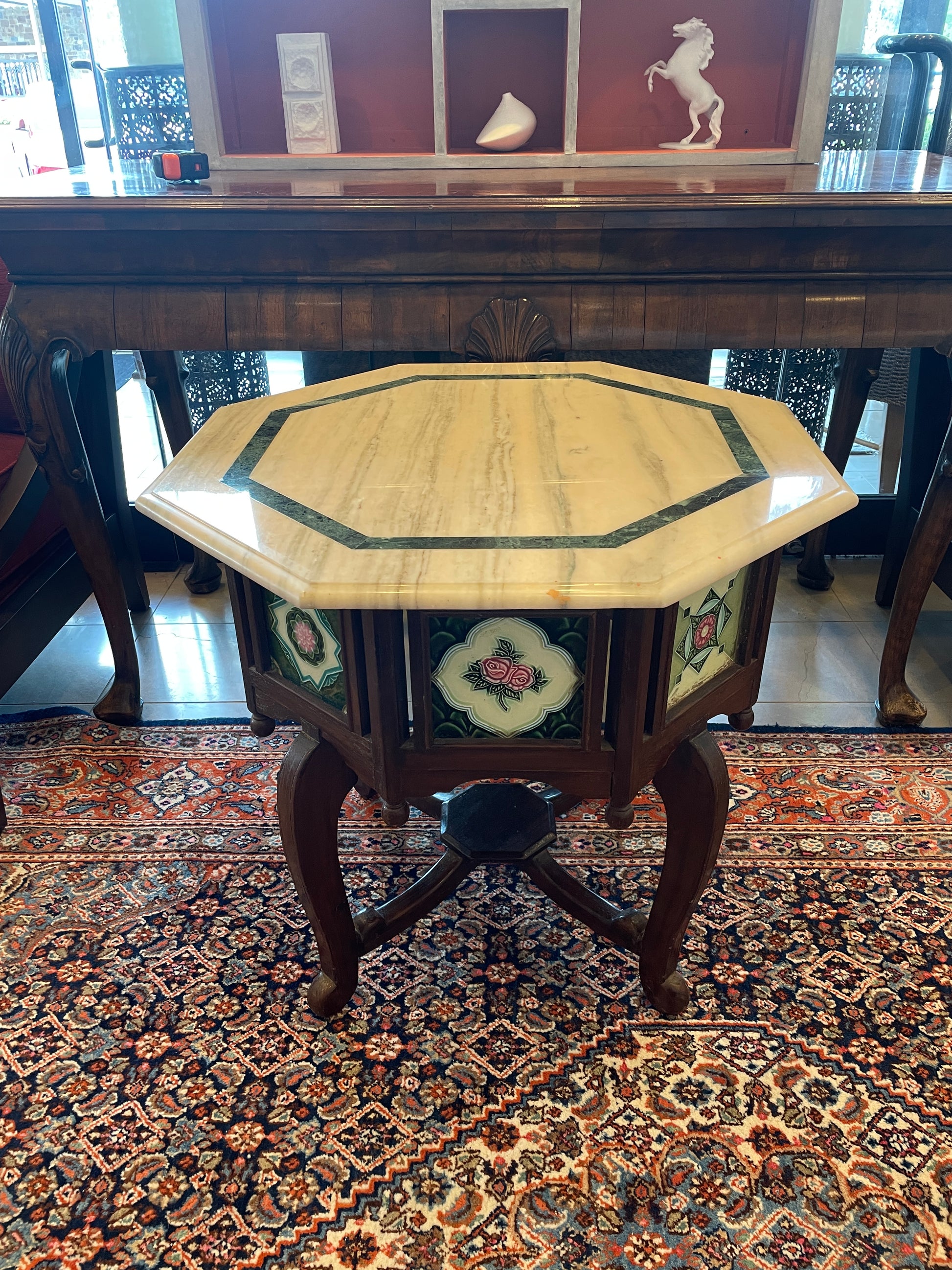 A beautifully crafted hexagonal table made from teak wood, featuring intricate tile inserts on each side. The tabletop is adorned with a marble surface surrounded by a green marble inlay, enhancing its elegance. The table's design is both functional and decorative, making it a perfect addition to any living space.