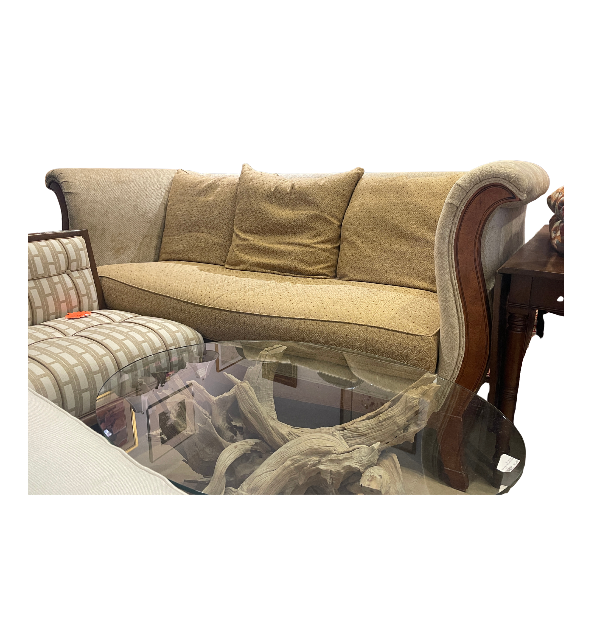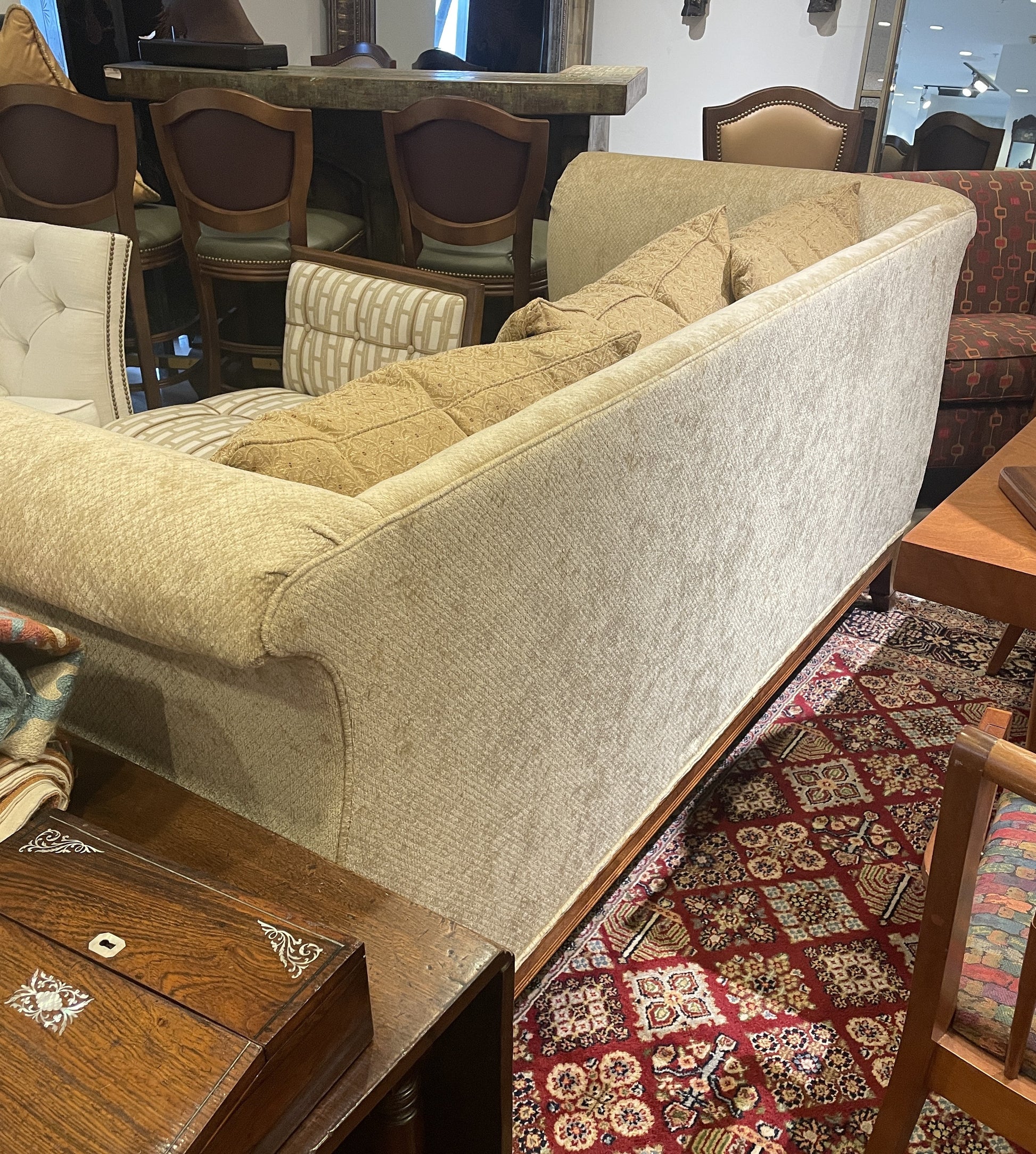 Thomasville settee or sofa. This large and charming piece has a beautiful tan color palette on a medium toned wooden frame. The frame is covered with soft, plush upholstery in a light tan color that covers all of the frame aside from wooden details on the front of the arms and base. The arms have an elegant curve that elevate the otherwise boxy shape of the sofa. The arms lead down to bracket feet with a beautiful tapered appearance. Atop the base are the beautiful cushions to this piece. The sofa has one long seat cushion, and three pillow-like back cushions. The cushions all have the same subtle interlocking floral design with a tan base, slightly lighter tan flower, and brown center dot. A charming traditional style piece that boasts both size and elegance.