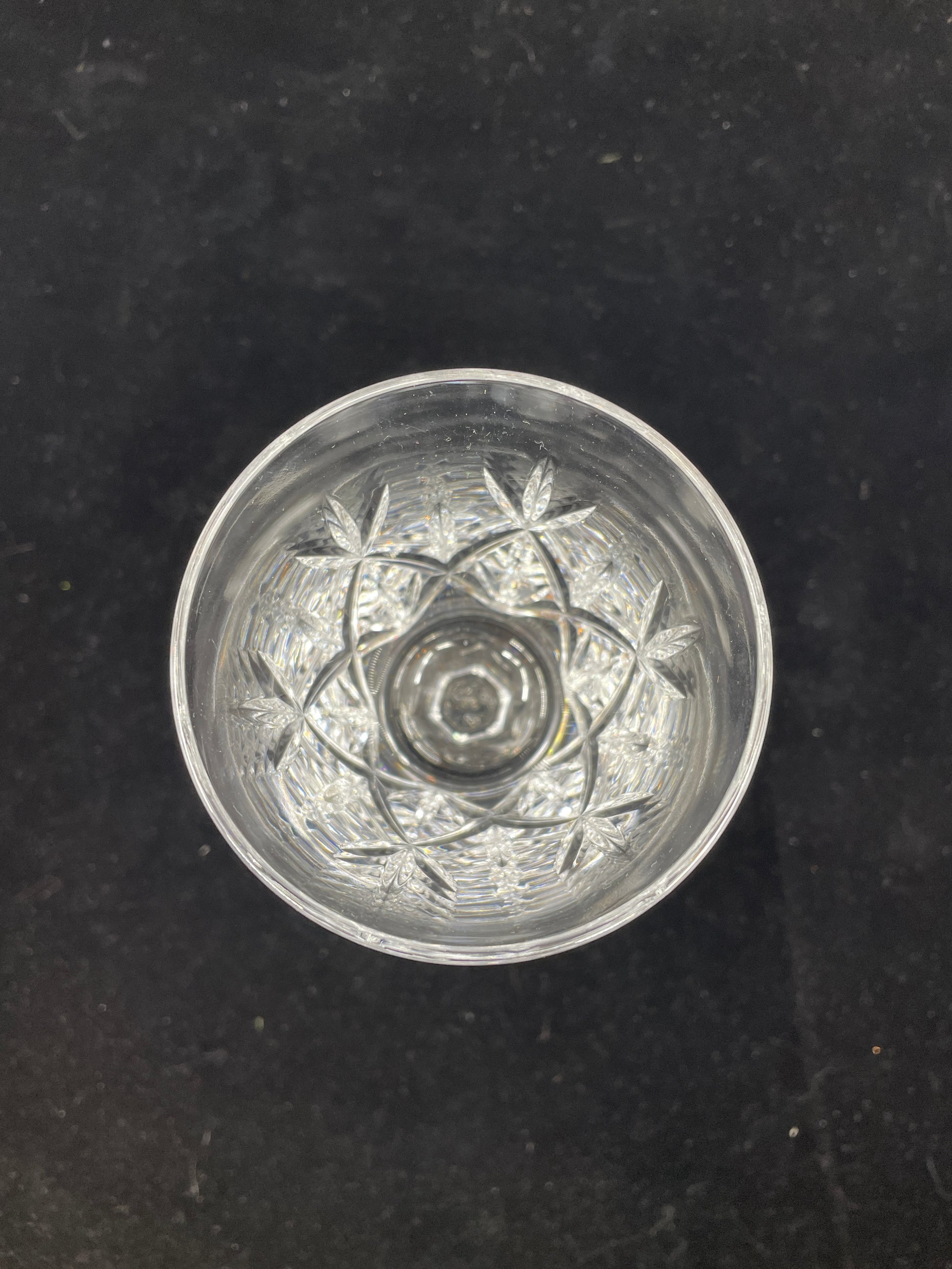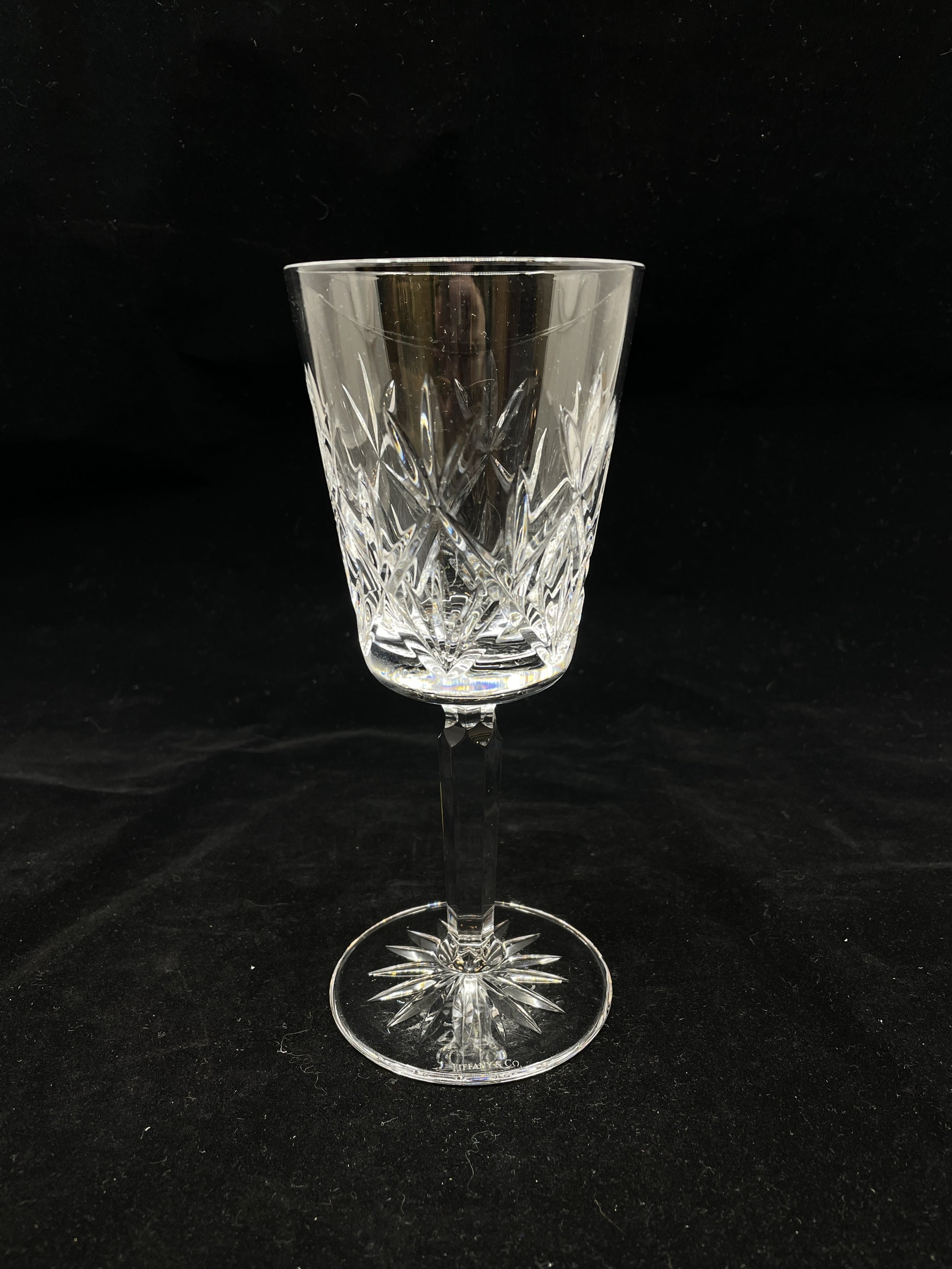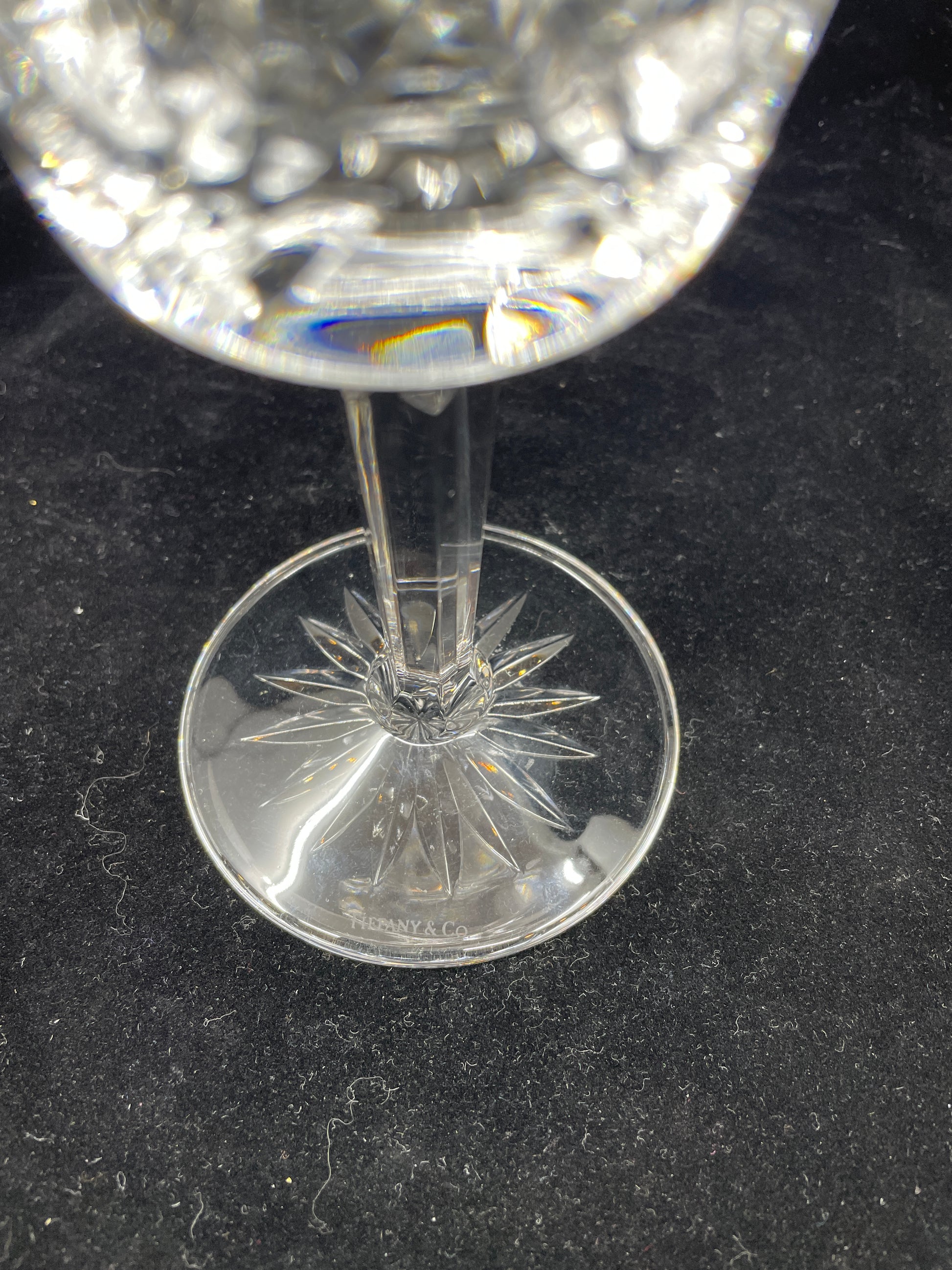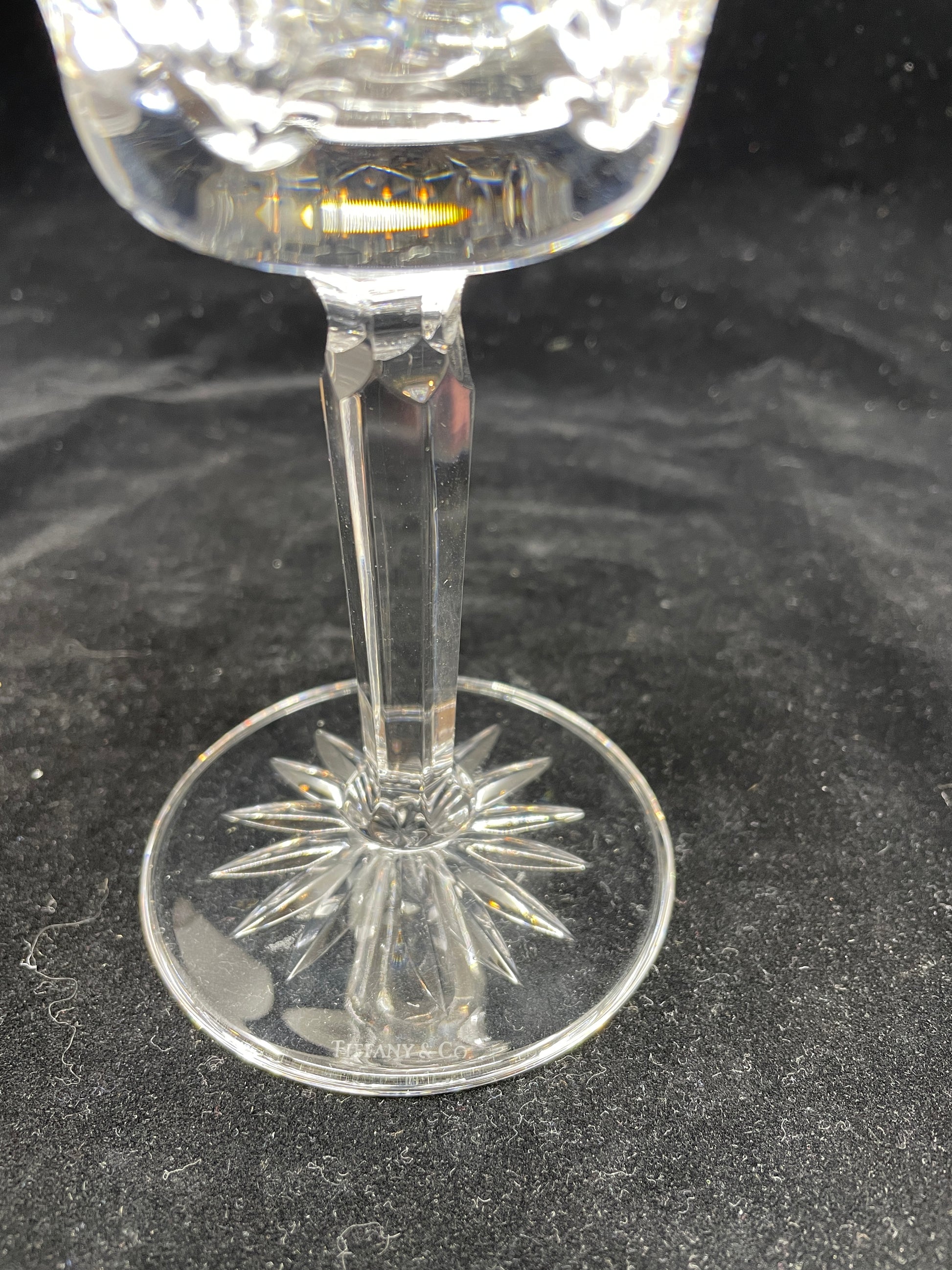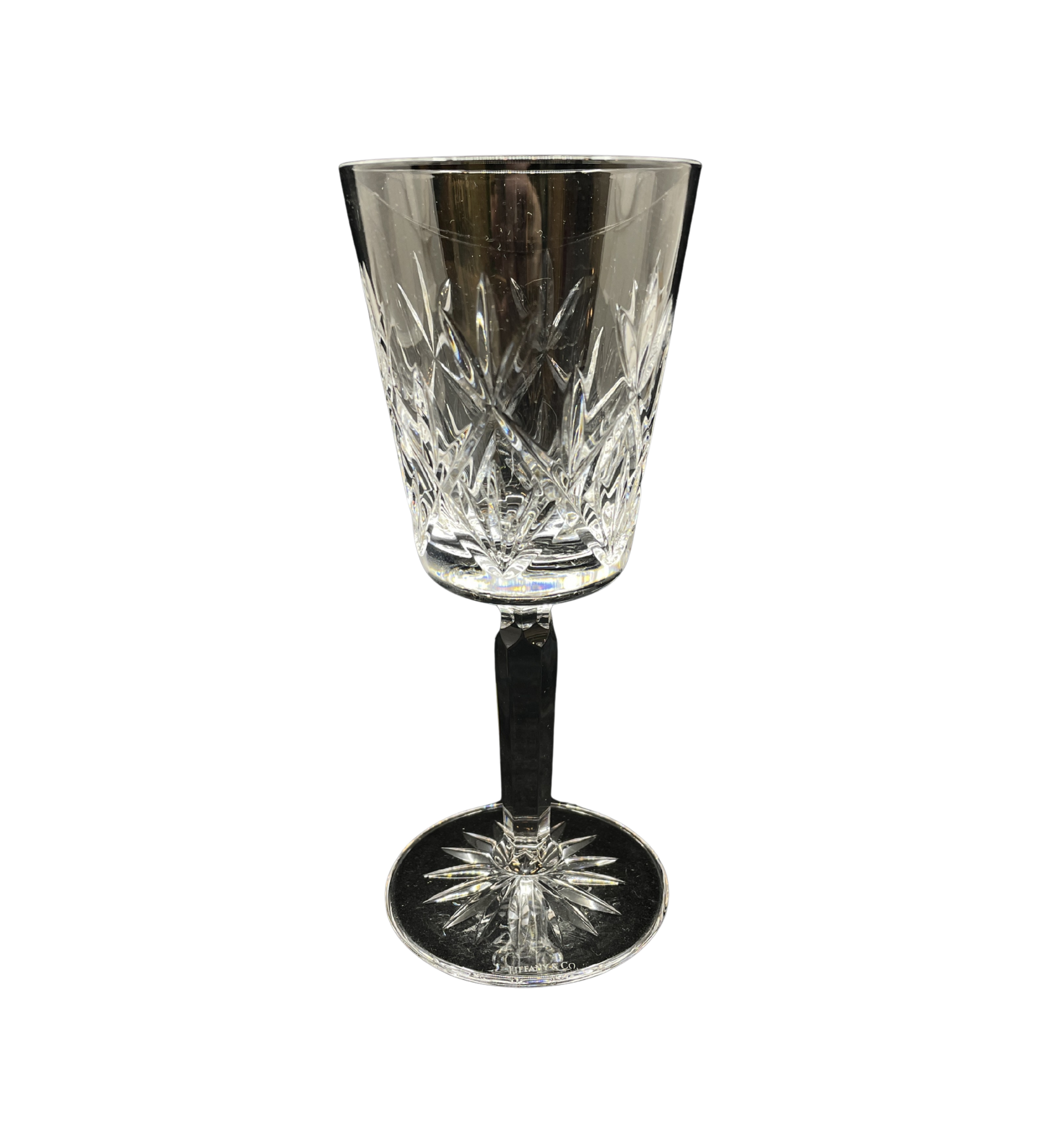 Tiffany and Co Sybil claret. This beautiful clear crystal claret has a stunning contemporary cut glass design. The foot of the glass has a star design, which holds up a multifaceted short stem. The bowl of the glass gradually tapers as it reaches the top for a sleek and elegant shape. A stunning glass that's sure to elevate any setting.