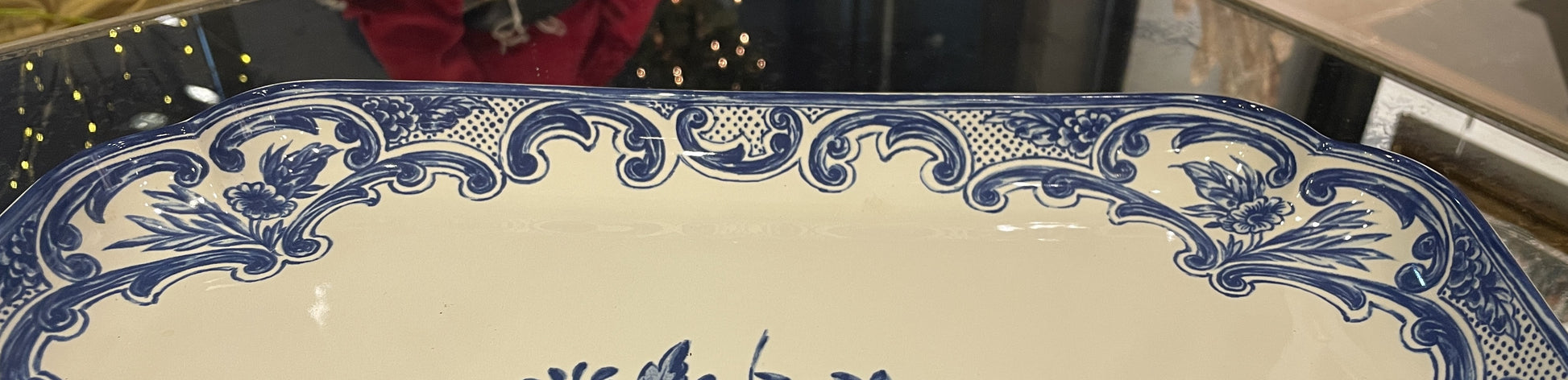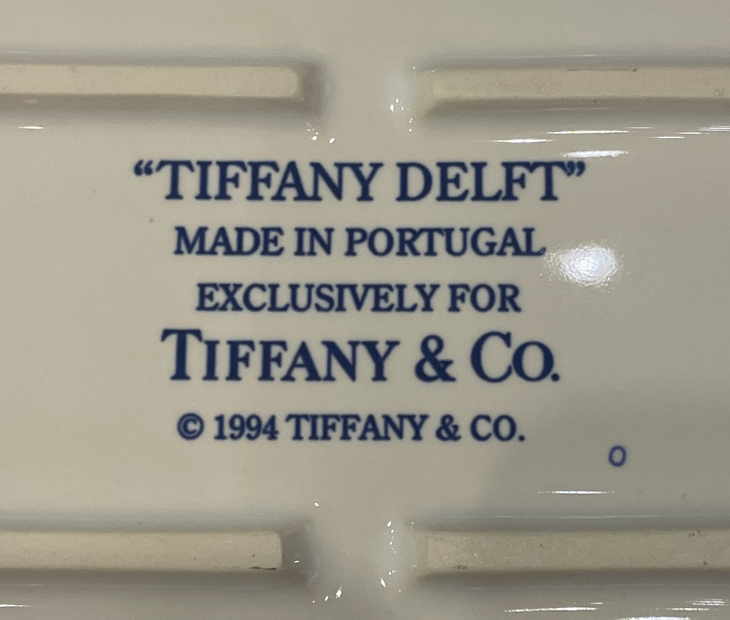 Tiffany Delft blue platter with box. Stamped on the bottom. This beautiful rectangular platter features stunning delft blue details on the edges and center of the piece. The center design includes floral details and leaves. The edges include more small florals surrounded with scrollwork and dotted details. The blue details contrast beautifully with the otherwise white platter. The piece has a shallow rim and scalloped corners. A beautiful piece full of detail and charm.
