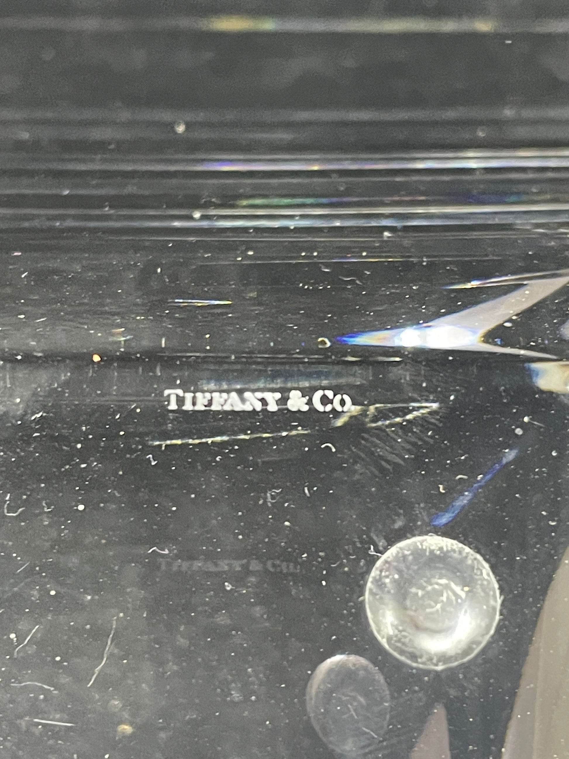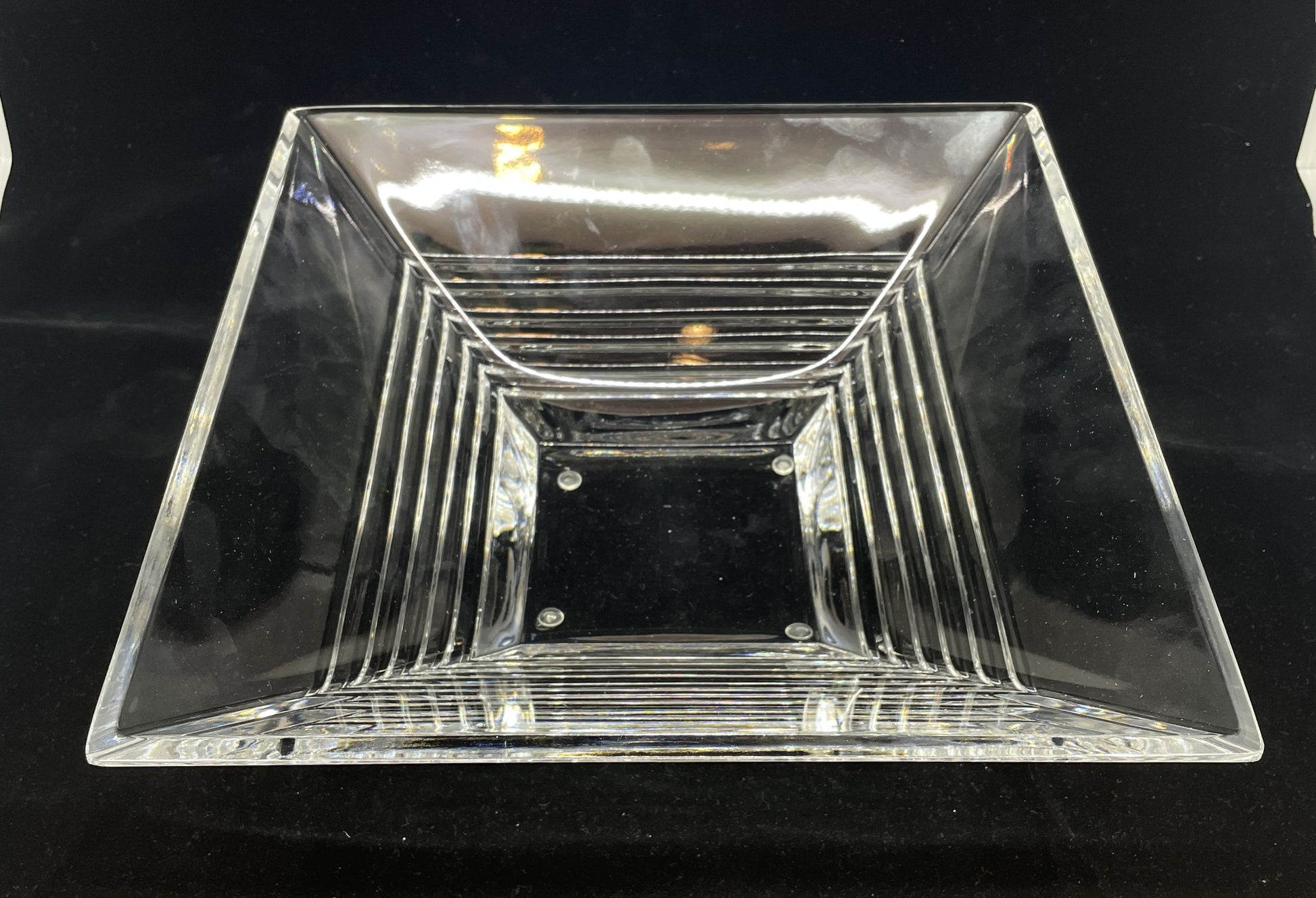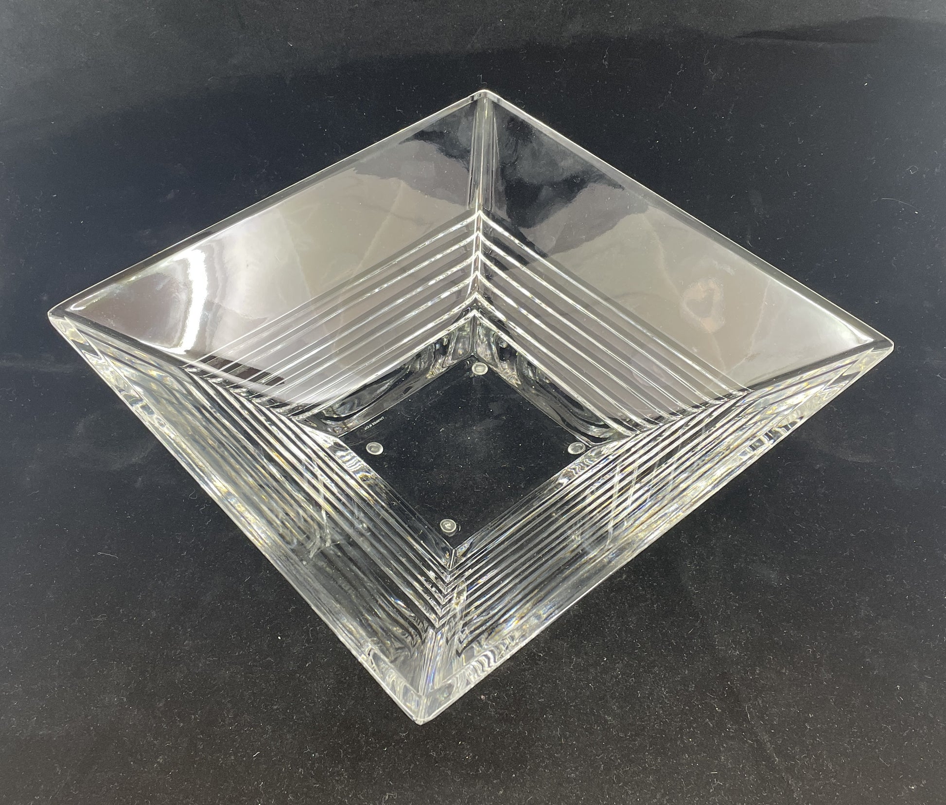 Tiffany square metropolis bowl. Logo etched on the base. This beautiful bowl has horizontal lines that follow the shape of the bowl. The angular details gives this piece a modern feel, but it truly has a timeless design that is sure to complement any space.