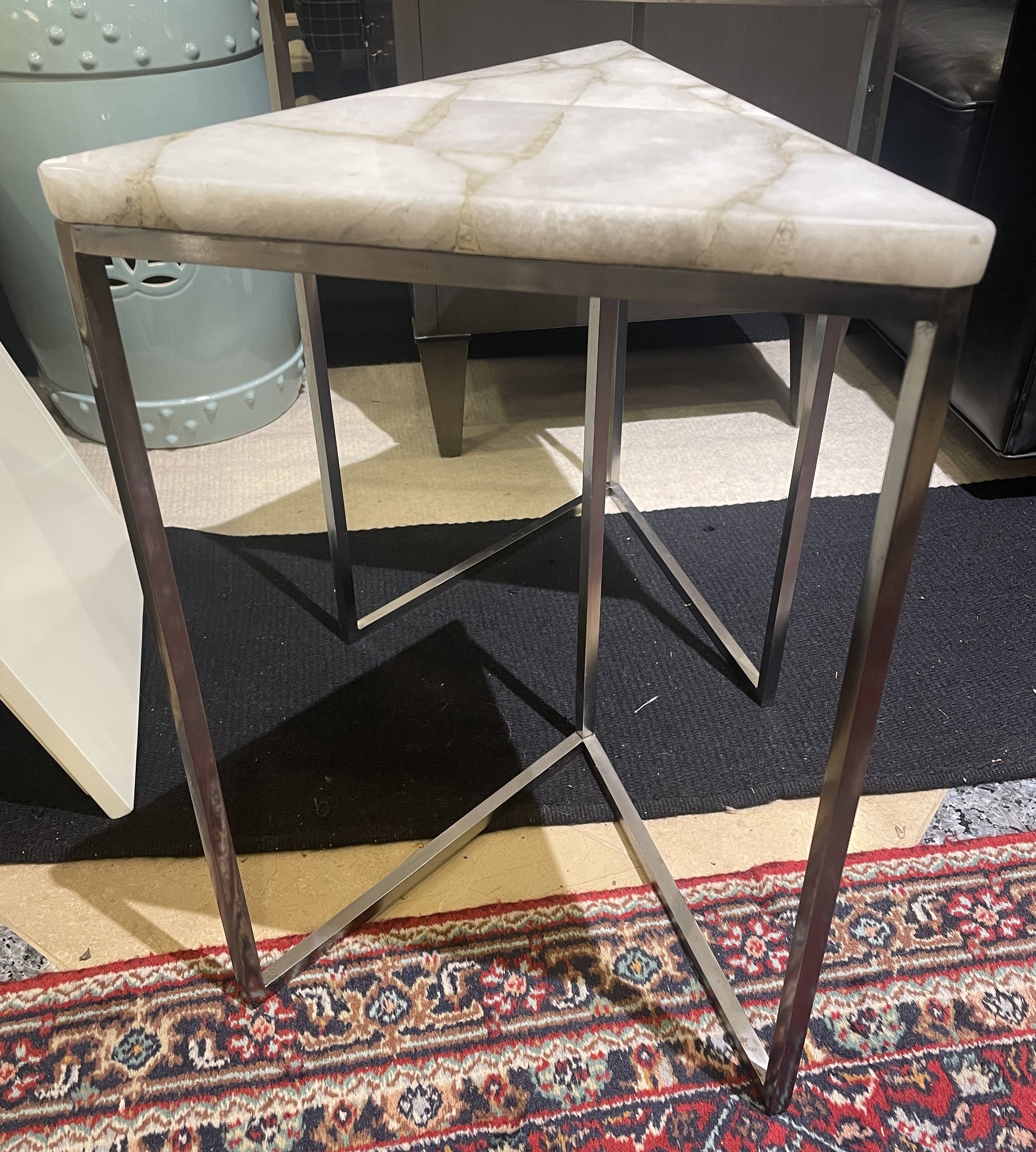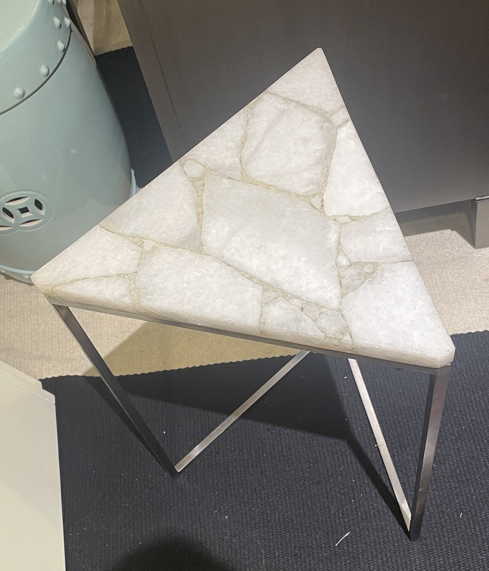 Tozai triangular nesting tables with marble top. This beautiful set of nesting tables has a sleek and modern design. The tables have the same design with a slightly different size. They each have a unique triangular shape in both their base and tabletop. The chrome base has three legs that lead down to a V-shaped stretcher. The open portion of the V is what allows the two tables to slot in together. Each table has a gorgeous white marble tabletop with gray marbleization which complements the silver colored base beautifully. A unique and charming set of nesting tables that is both functional and sleek.
