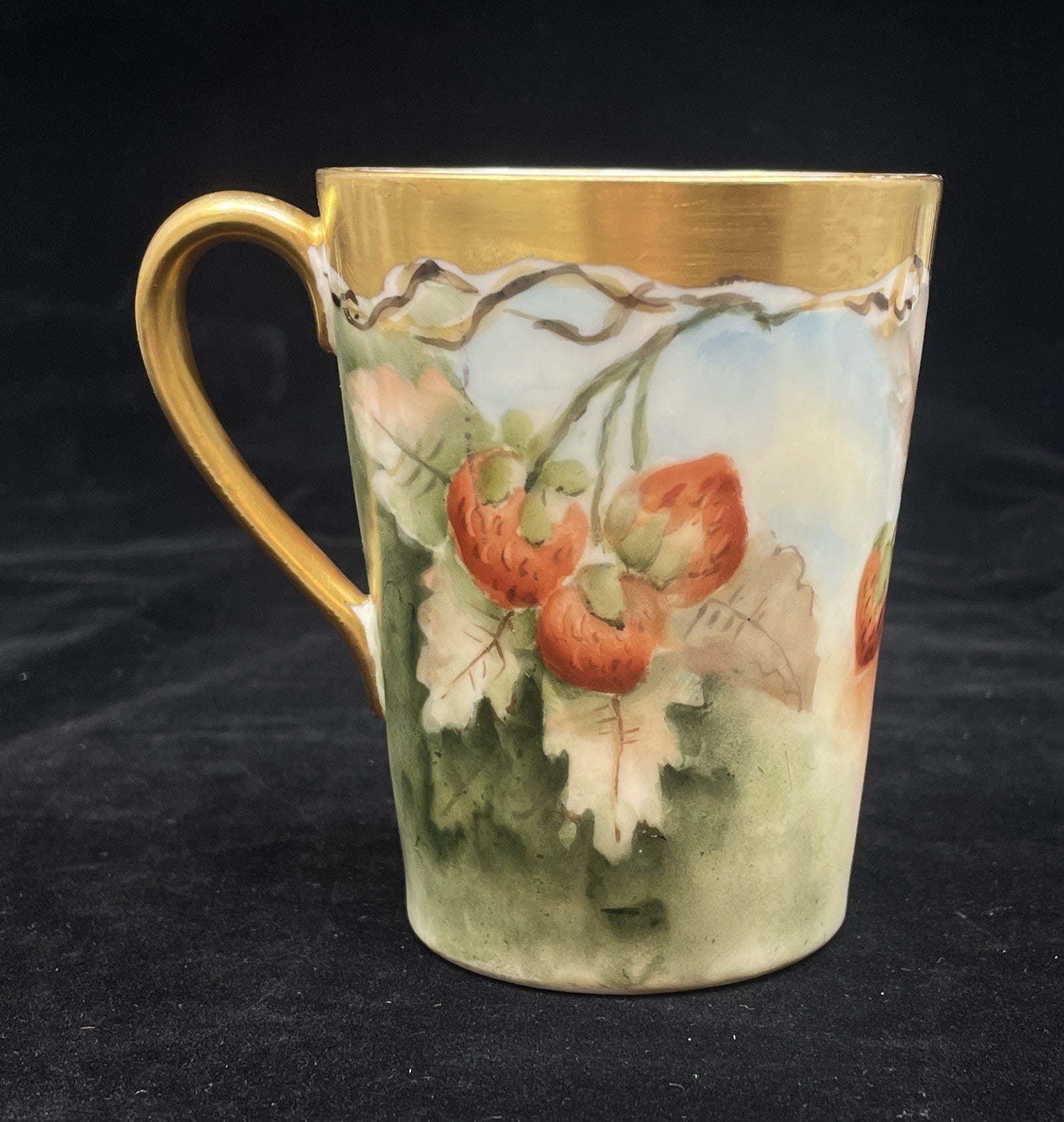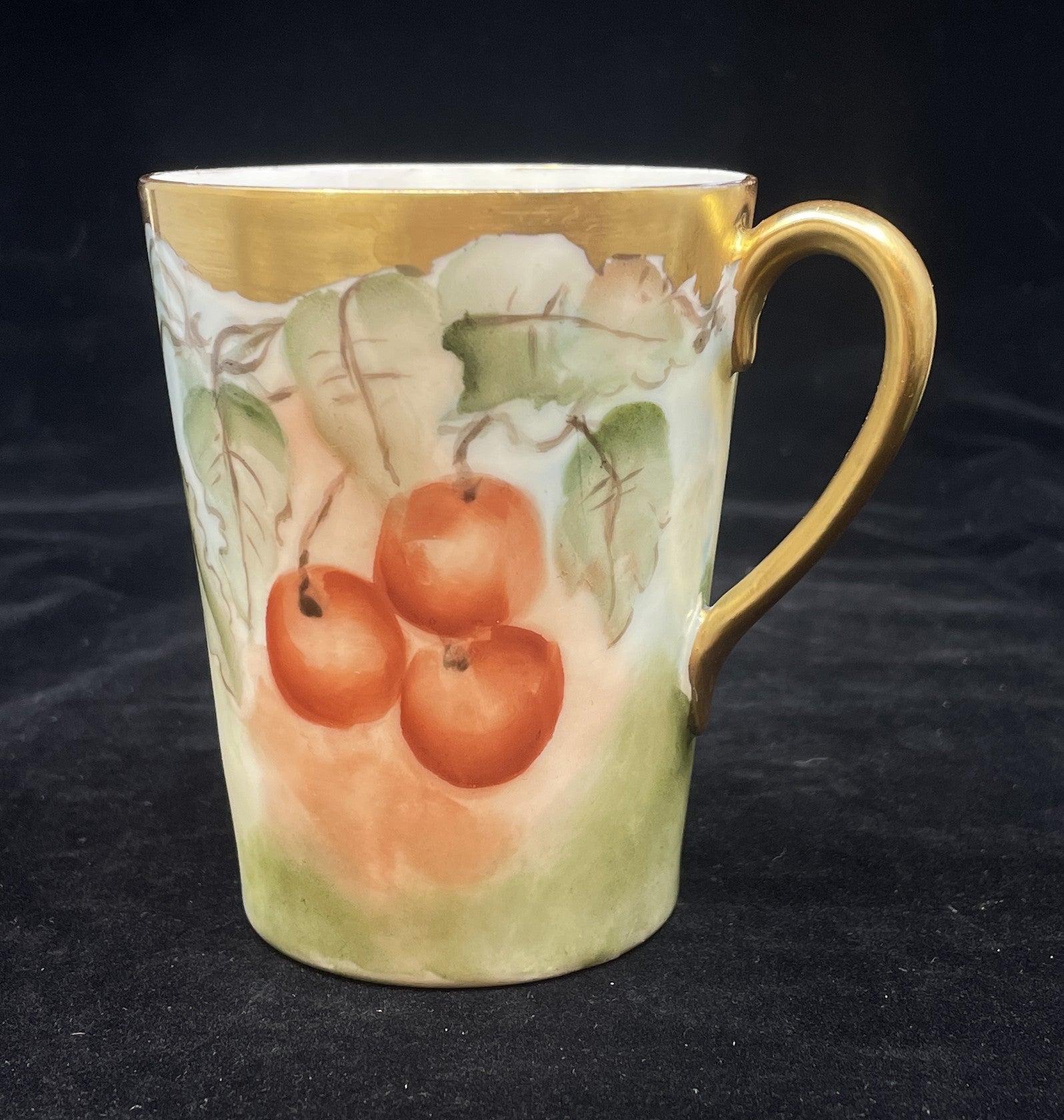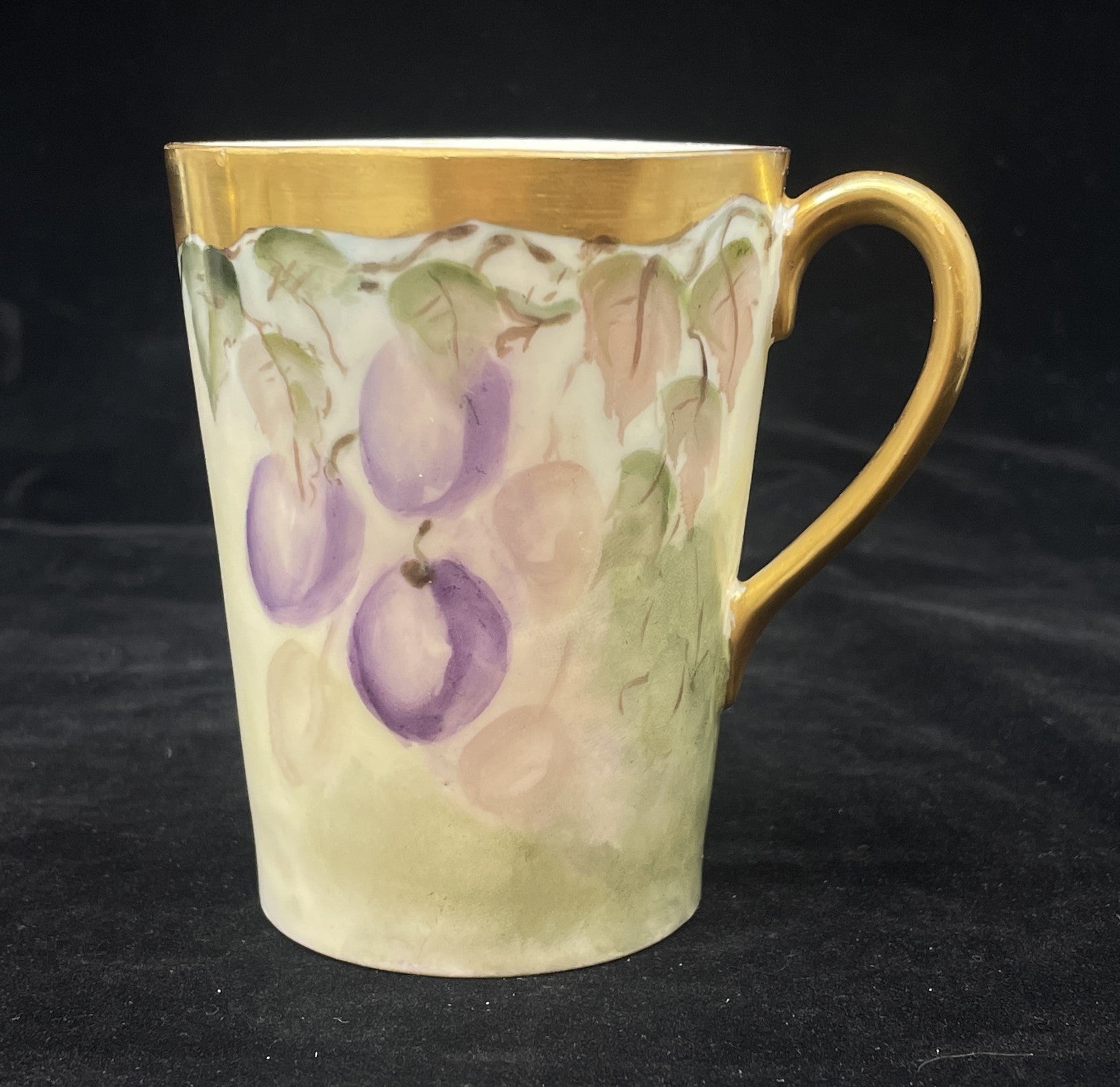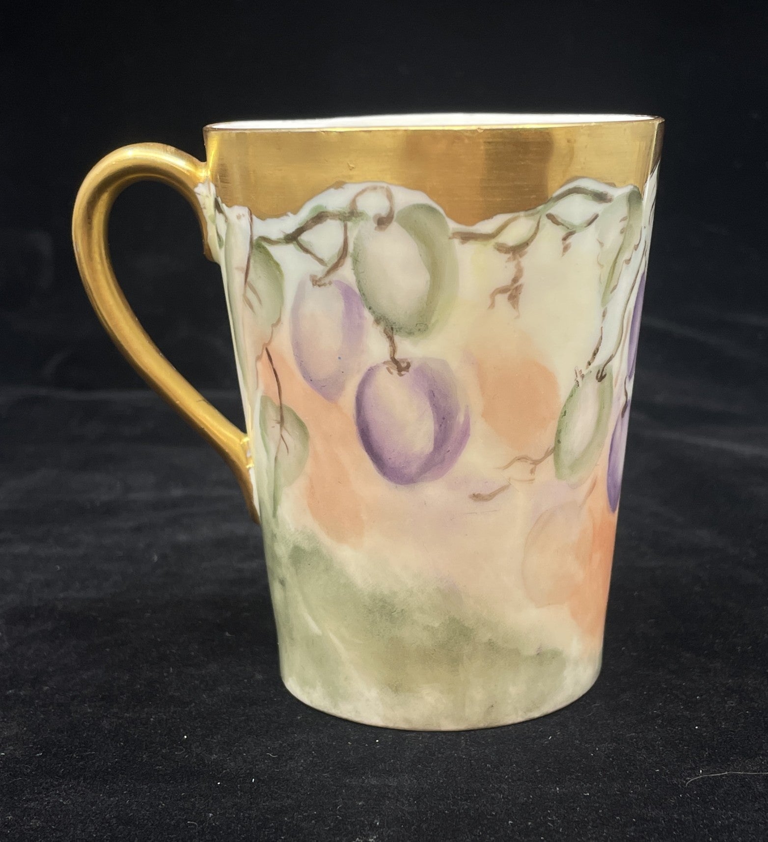 Tressemann & Vogt Limoges set of six antique hand painted mugs. Stamped on the bottom. This stunning set of porcelain mugs features hand-painted designs. Each mug has the same shape with a slightly tapered cup and slender, half-heart handle. The upper rim and handle of each mug are painted gold. Each mug has a different fruit motif painted on the sides. The designs include cherries, gooseberries, raspberries and blackberries, strawberries, plums, and grapes. Each fruit design is accented by a pastel background and some leafy details. A set of mugs full of charm that's perfect for any collector.