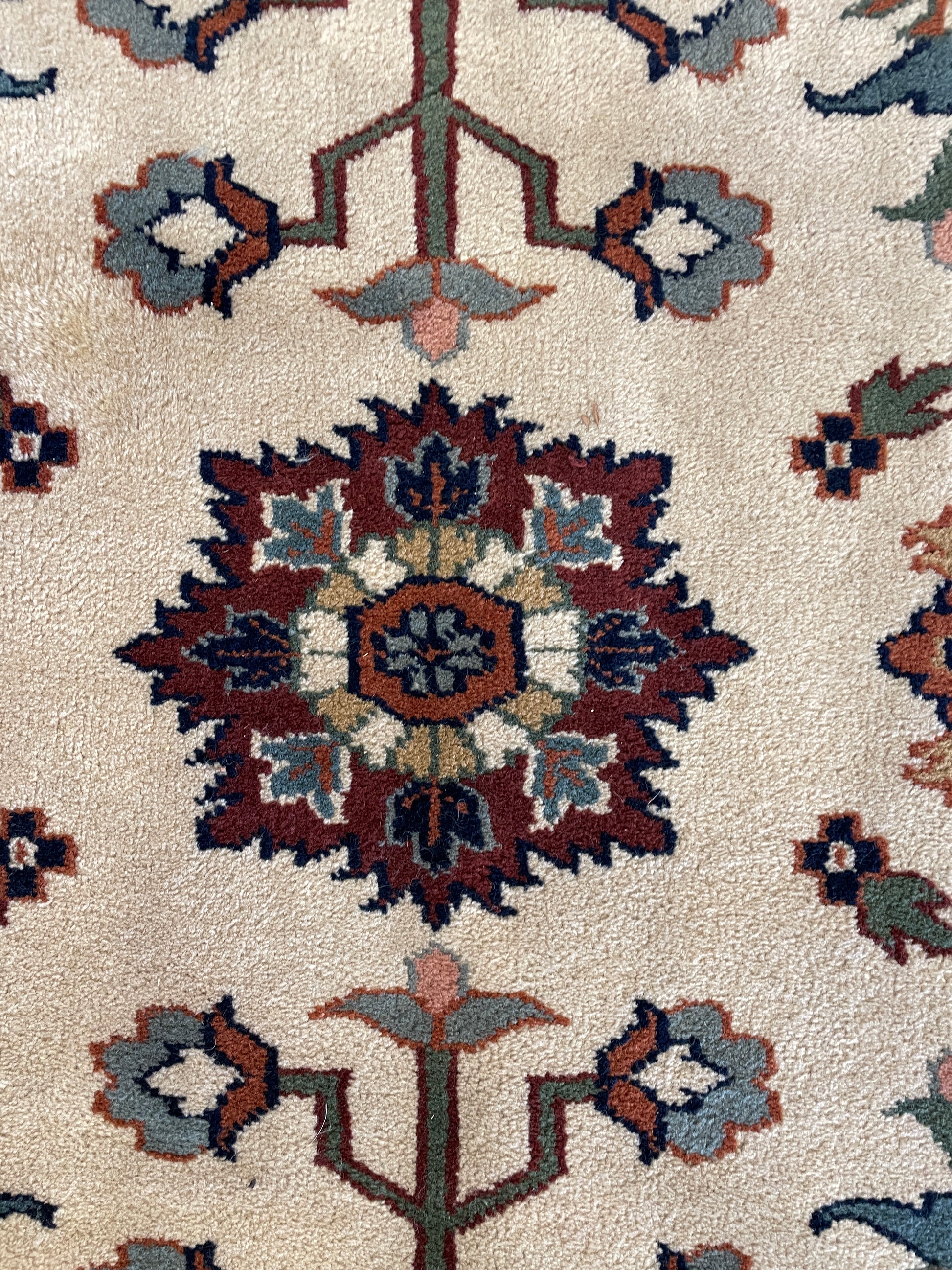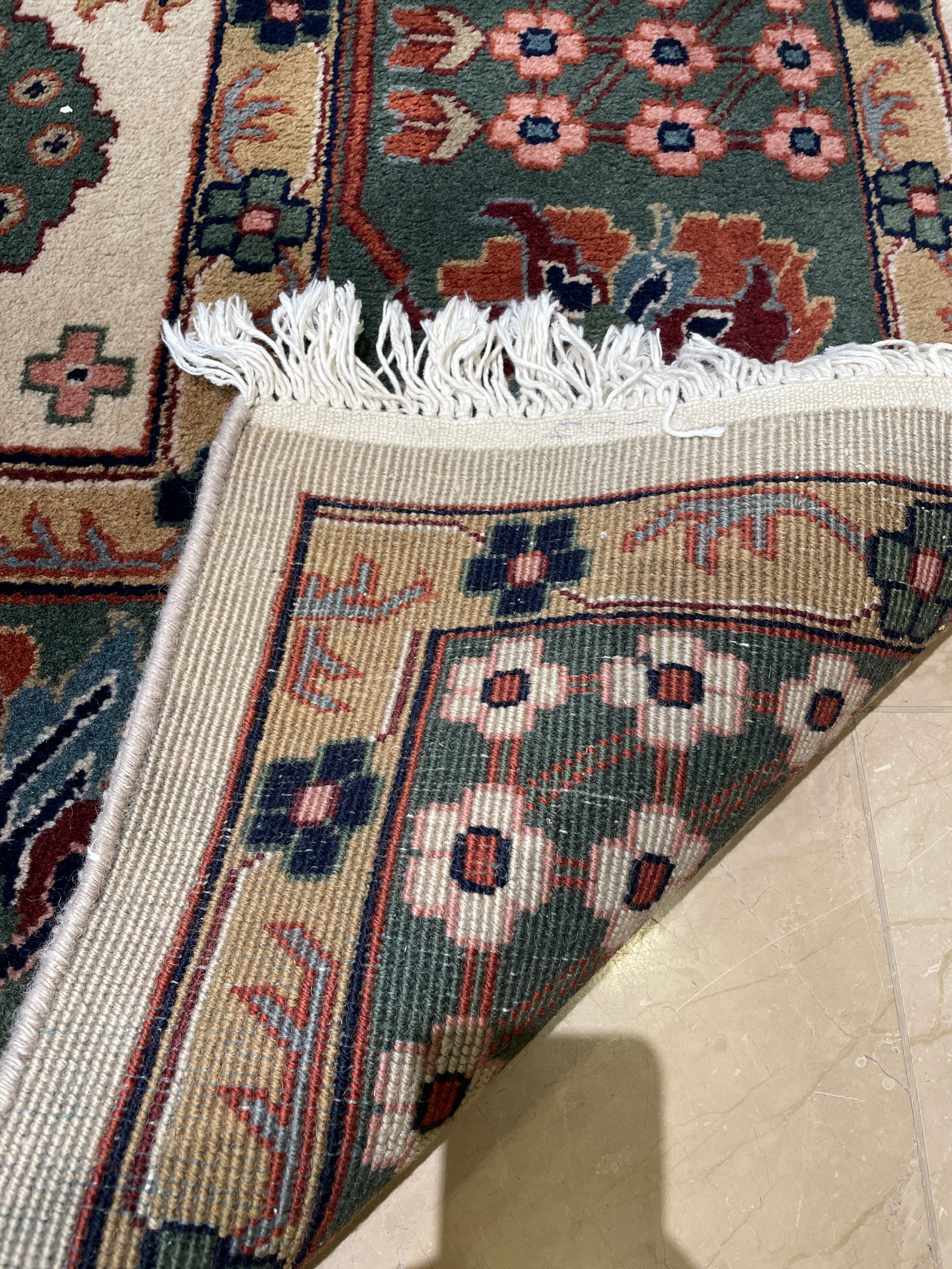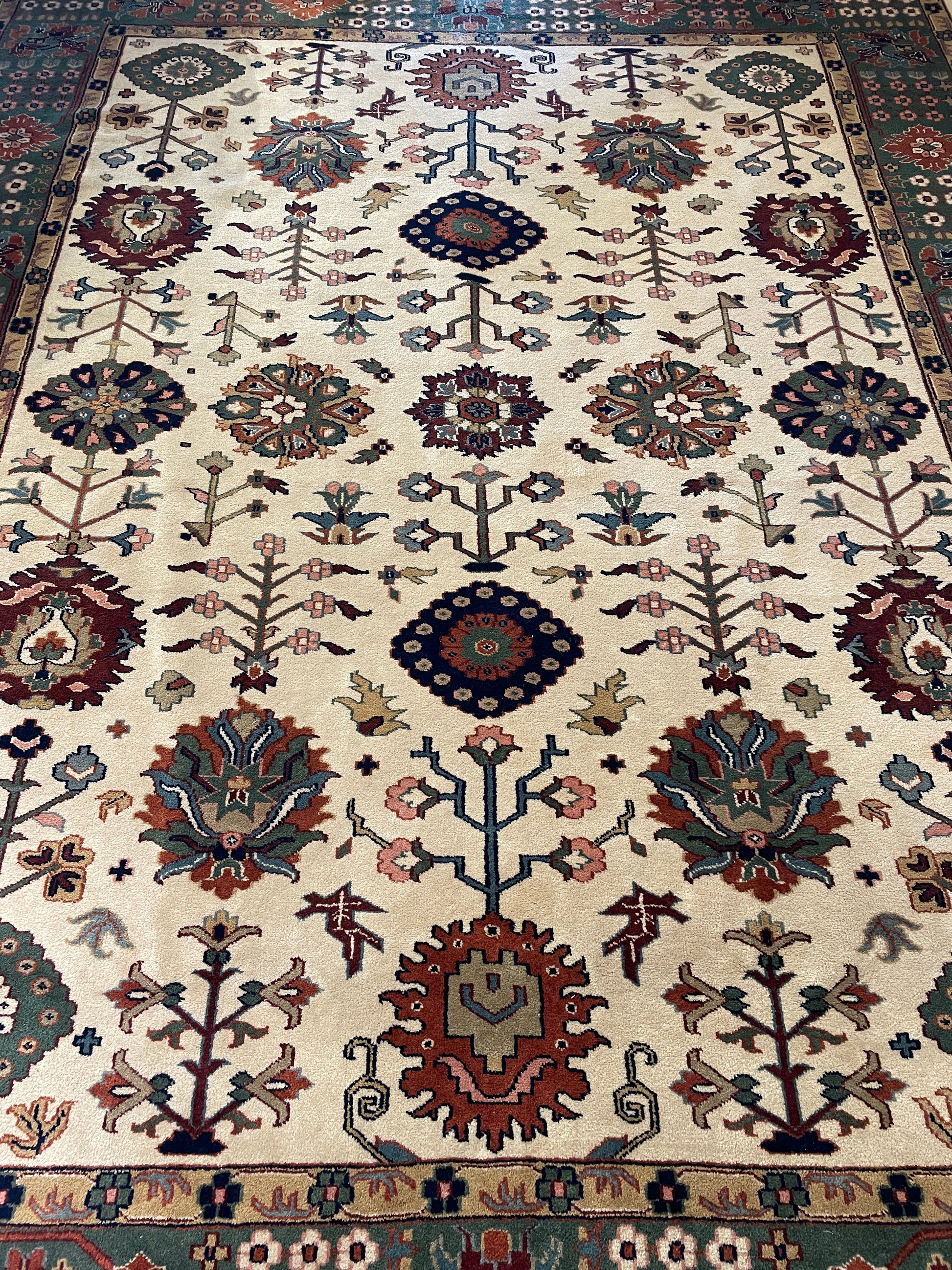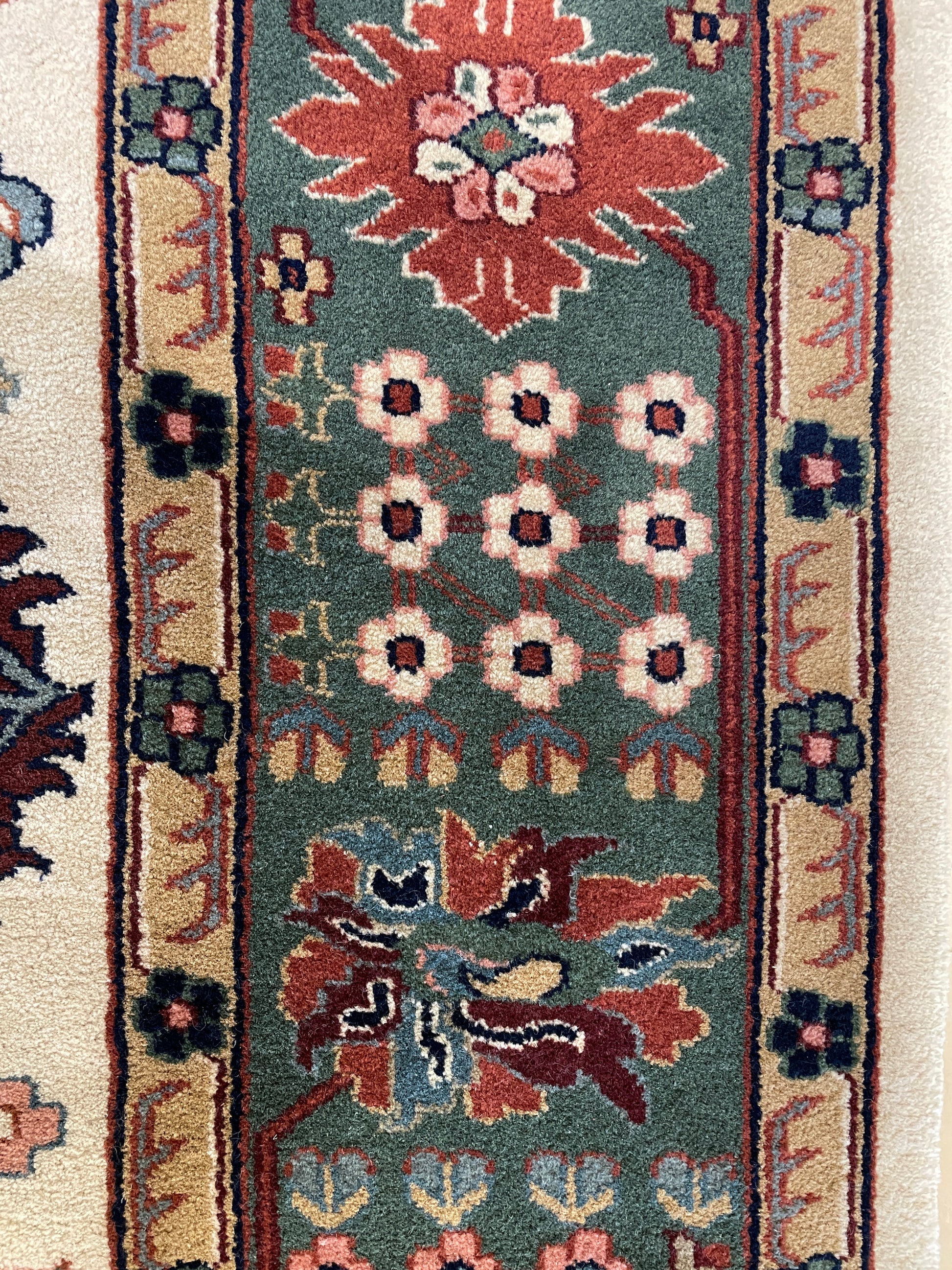 Hand knotted Turkish Kazak rug. Features a rectangular shape with a cream background detailed by floral medallions in green, rust, pink, and tan colors. A green boarder defines the edges with a similar design. White fringe adorns the top and bottom.