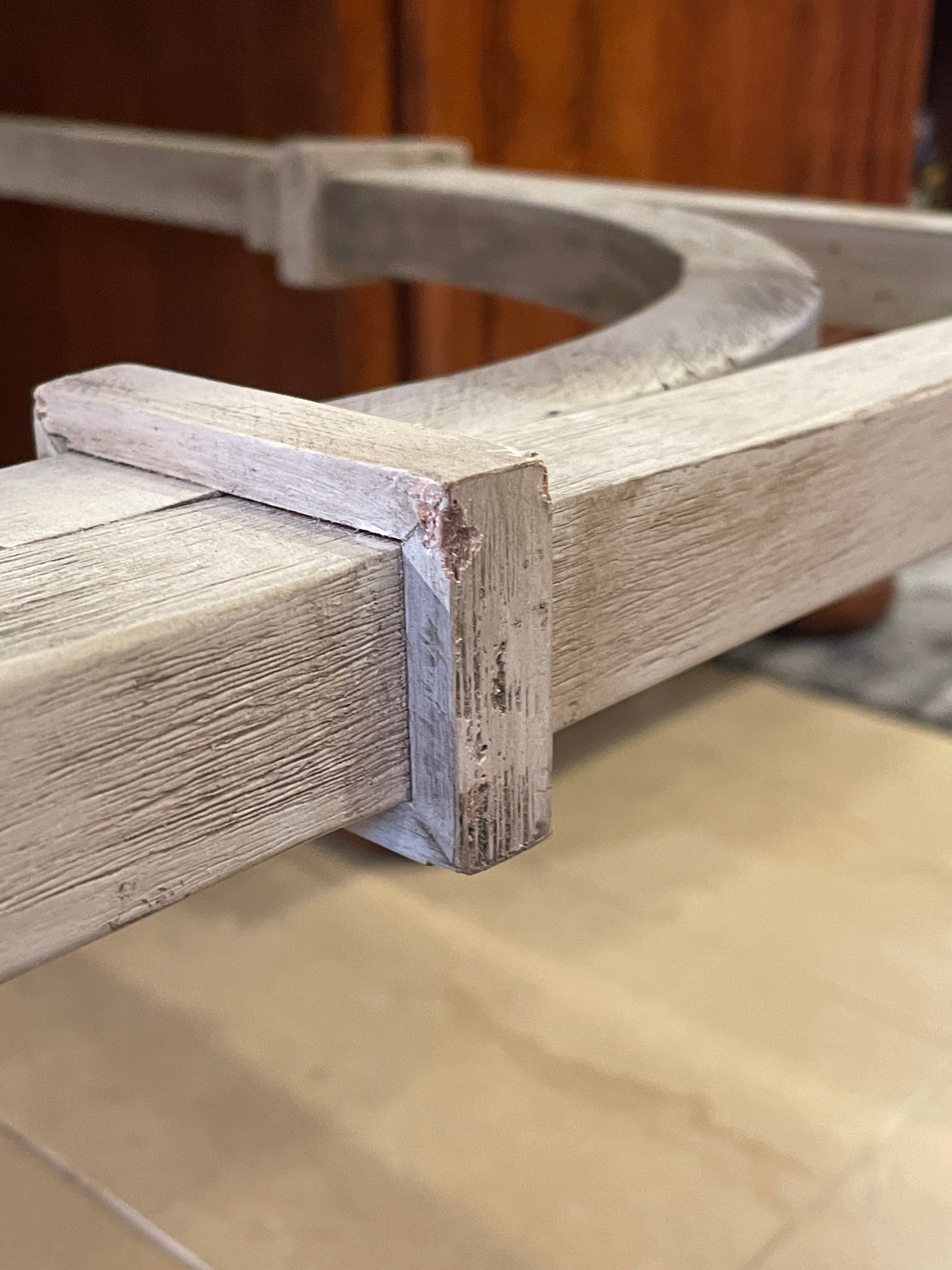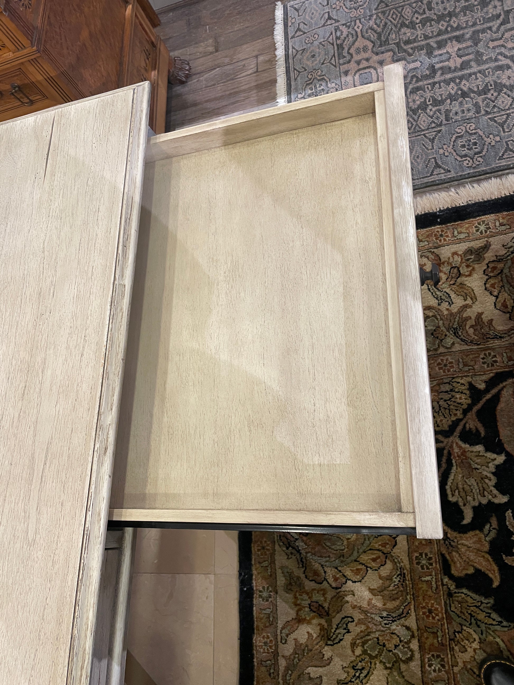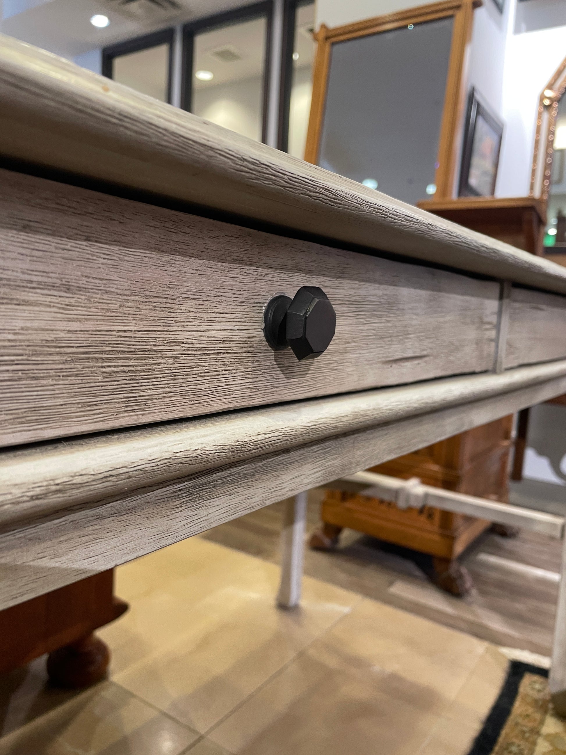 Uttermost Bridgley writing desk. This beautiful writing desk is crafted from plantation-grown mango wood. The solid wood frame is accented with a stunning white finish that emphasizes the deep grained mindi veneer. Subtle carved details accent the piece throughout including a beveled edge and border surrounding the lower portion of the desktop. The table sits on four legs with flared feet. The sides and back of the chair include a stretcher that connects the legs, and the hind legs are connected further with rounded arch stretchers that join the straight stretchers. The desk features two short but wide drawers that are accented with one geometric, antique finished brass knob each. A beautiful piece that is sure to elevate a space with its beautiful craftsmanship and unique material.