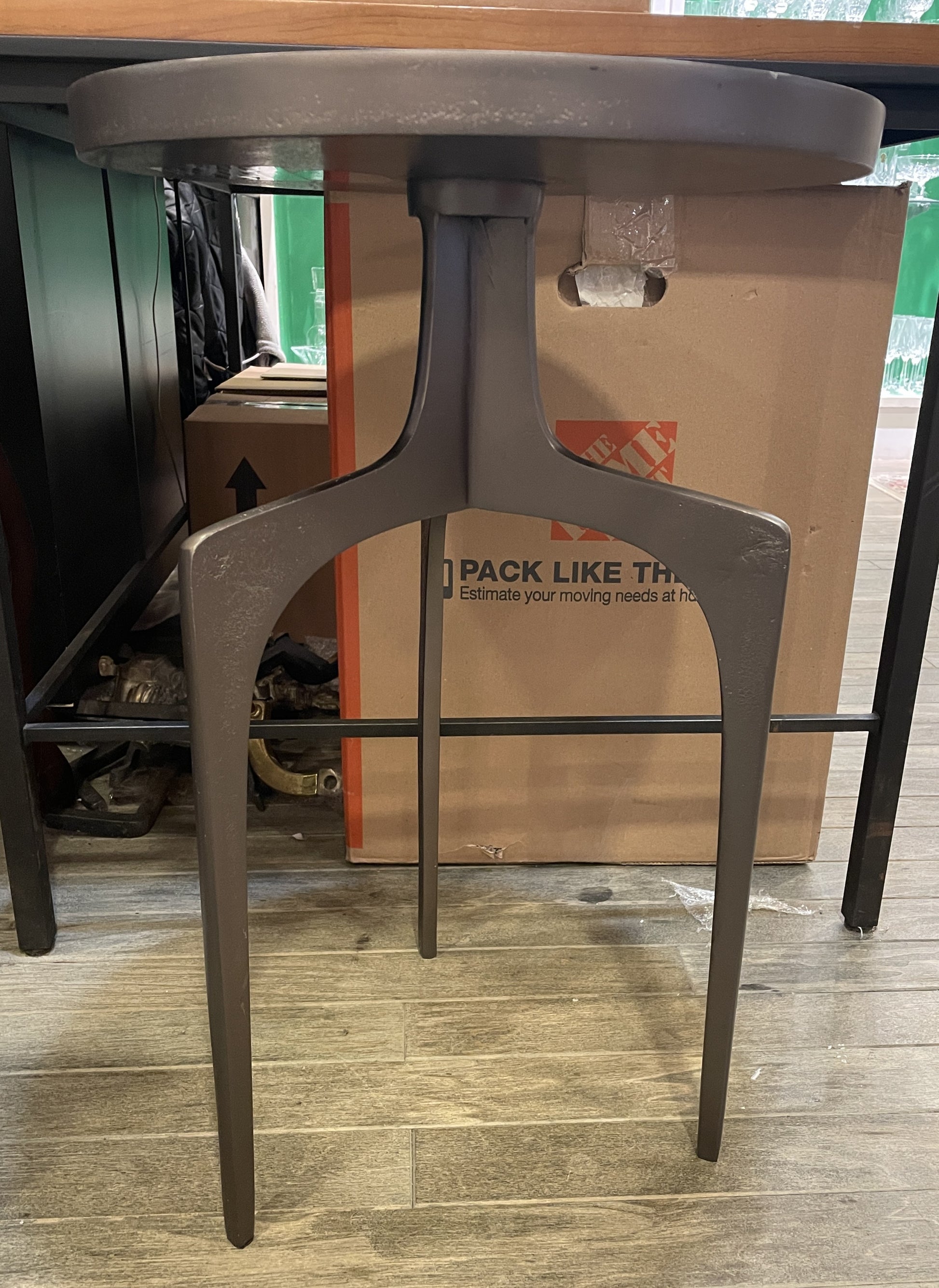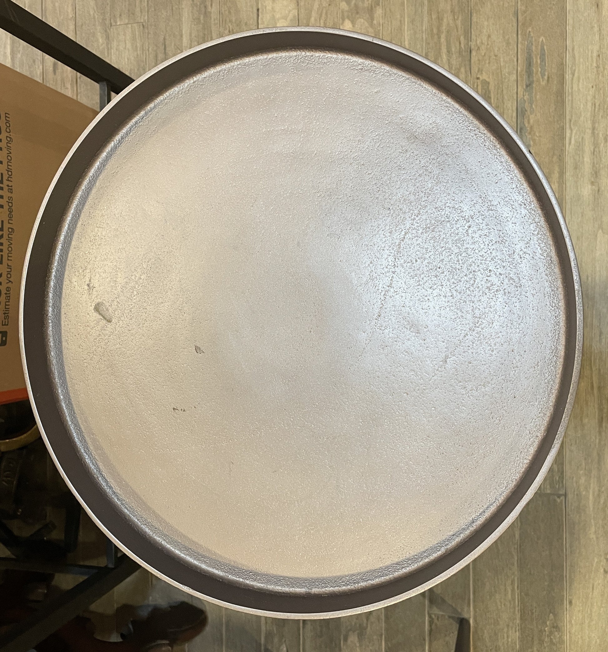 Uttermost Kenna table with a tripod base. This beautiful table crafted from aluminum with a textured nickel finish features a streamlined silhouette. The table sits on a tripod pedestal base. The three legs stem out from a central point underneath the tabletop. They fork out and create a rounded corner which leads down into each tapered leg. The circular tabletop has a shallow rim. A charming little table that would pair perfectly next to a modern accent chair.