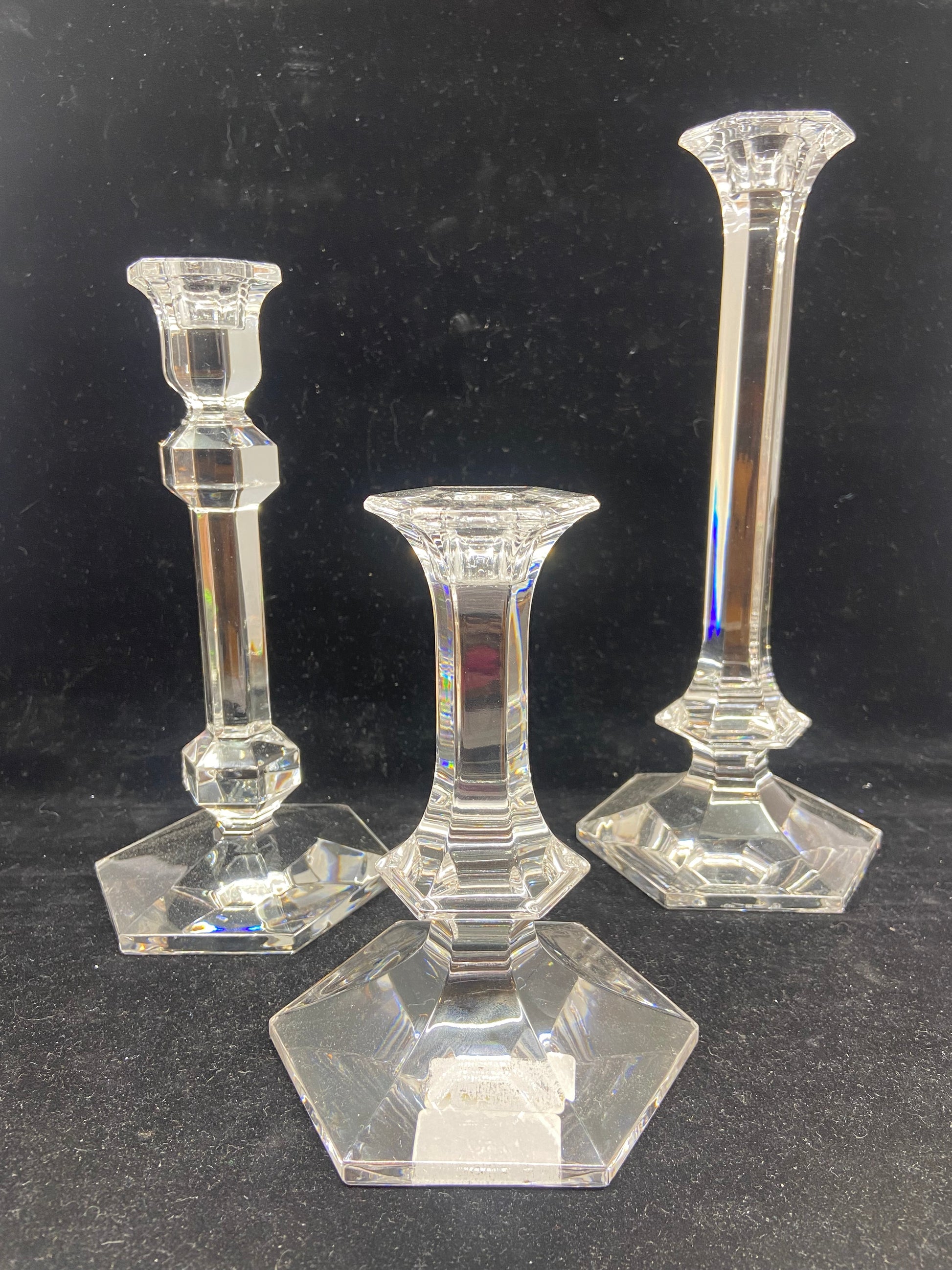 Three different sized candlesticks features a hexagon base with a geometric style neck design.