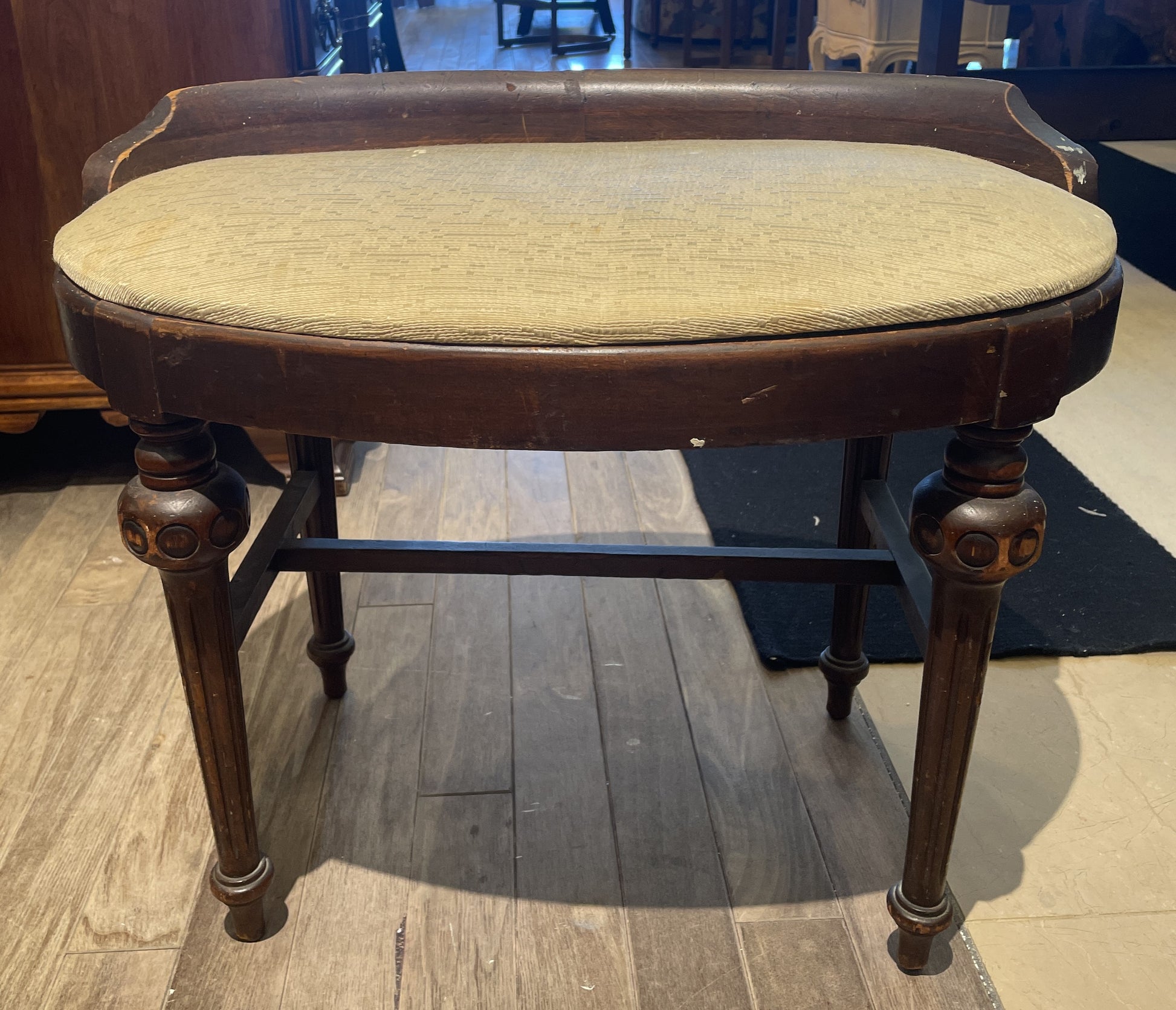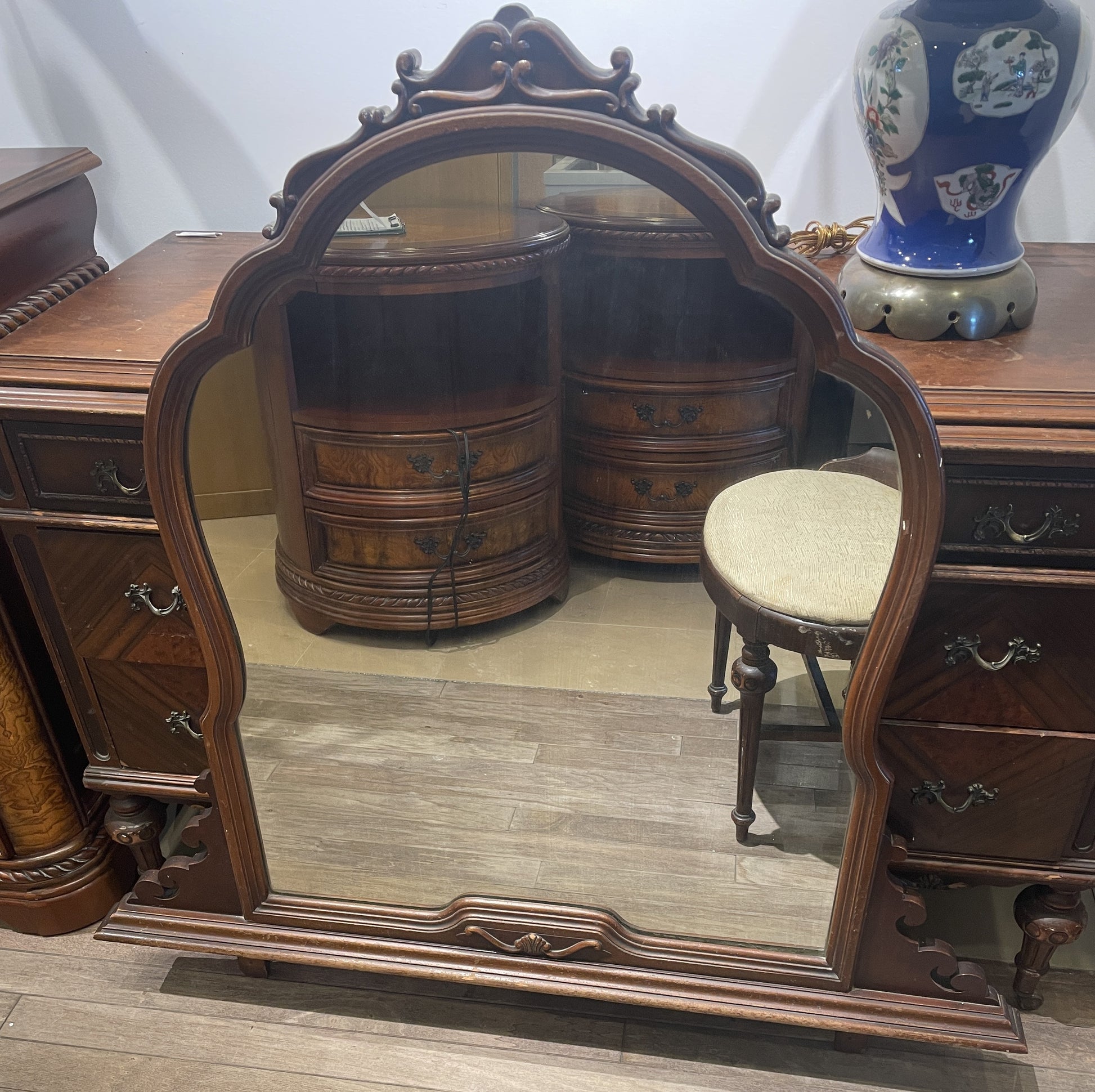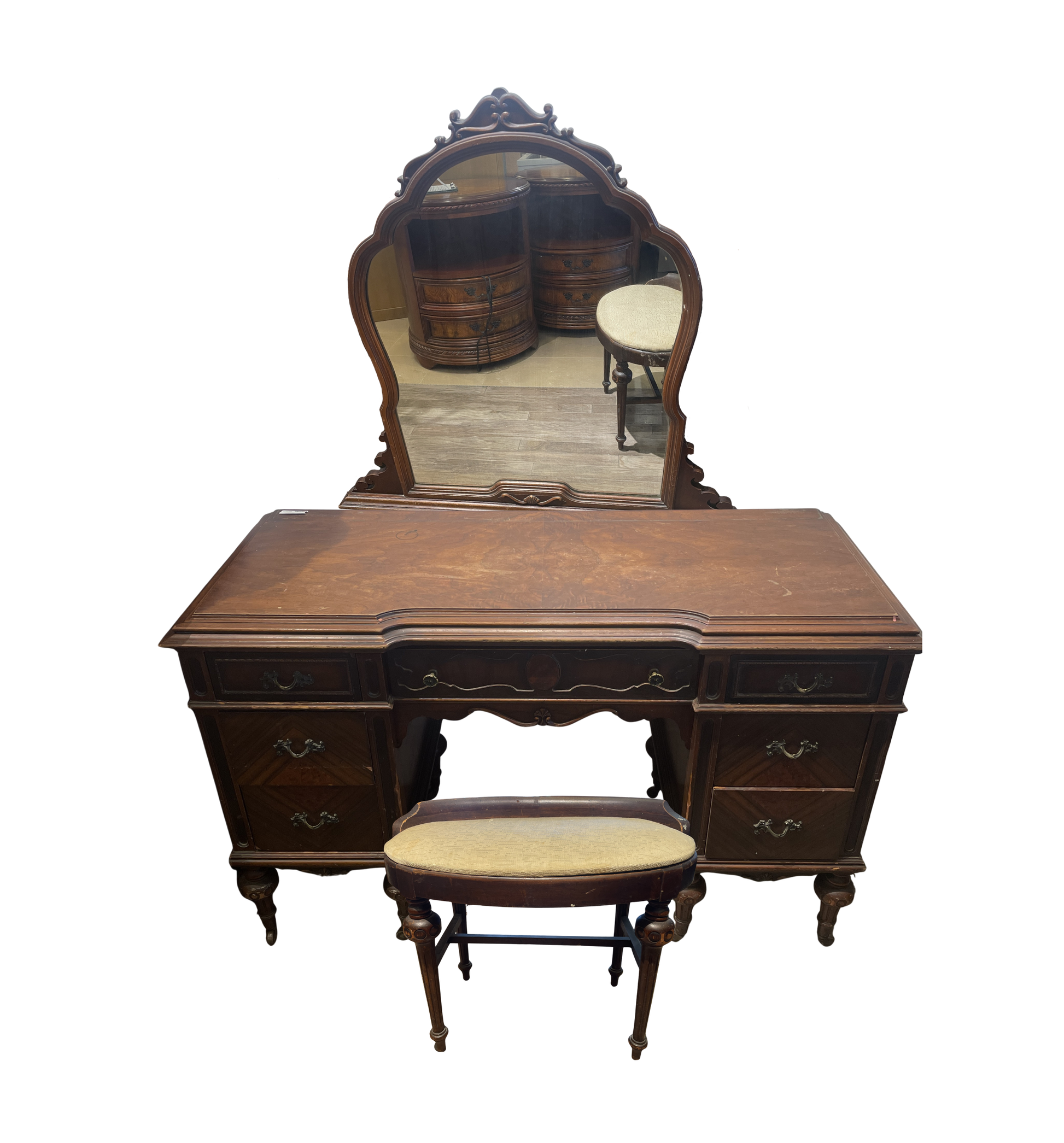 Vanity with bench. This gorgeous piece features a vanity with a beautifully ornamented mirror and a small bench. The medium-toned wooden vanity sits on tapered legs with fluted details that are capped with brass casters for easy motility. It has seven drawers, each of which with brass pulls. The side drawers have handles with an intricate scrolled design, and the center drawer has two small brass pull knobs with a simpler design. The vanity includes an arched mirror with carved details on its frame. The bench has a similar style to the rest of the vanity with tapered fluted legs connected by an H-stretcher. The oval seat is upholstered with a cream colored fabric and has a slight back edge extending from the frame. This gorgeous vanity is full of charm with its intricate designs and timeless craftsmanship.